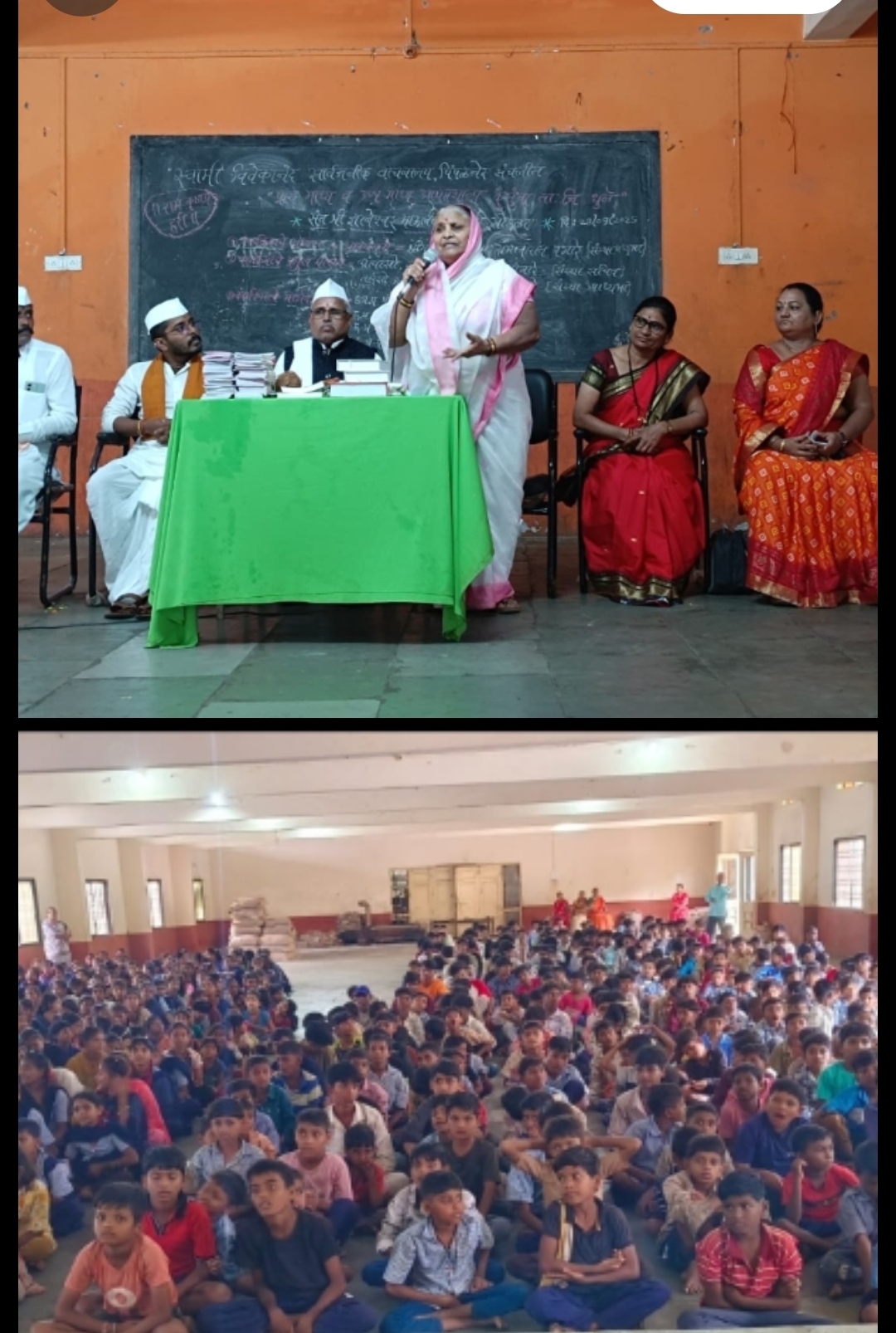 पिंपळनेर : महात्मा फुले विद्याप्रसारक संस्था पिंपळनेर संचलित अनुदानित आश्रमशाळा सामोडे,वि.जा.भ.ज.आश्रमशाळा पिंपळनेर,दाजी साठे इंग्लिश मेडीयम स्कूल पिंपळनेर,अटल फार्मसी कॉलेज पिंपळनेर या सर्व शाळेतील विद्यार्थ्यांना *ओळख ज्ञानेश्वर माऊलींच्या ज्ञानेश्वरी ची* हा शाळेय मुलांसाठी मुल्य शिक्षण विषयक उपक्रम ओळख श्री ज्ञानेश्वरी एक परिवार आळंदी यांच्या वतीने हरिनाम गजरात आयोजित करण्यात आला होता.