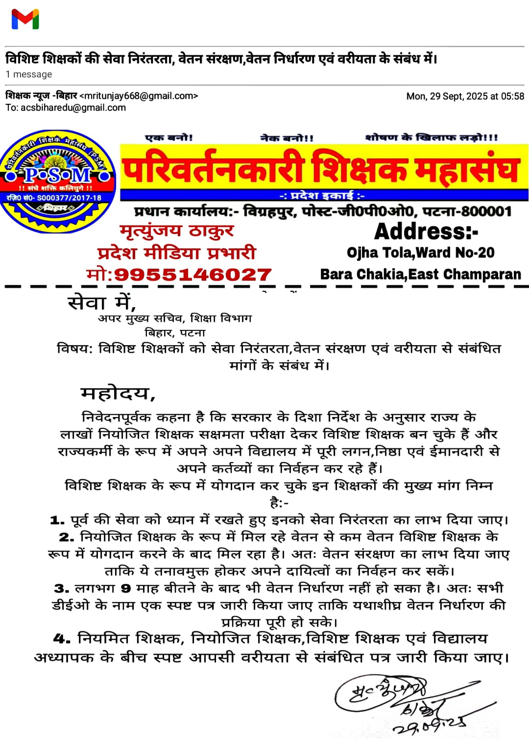 पटना। परिवर्तनकारी शिक्षक महासंघ, बिहार के प्रदेश मीडिया प्रभारी मृत्युंजय ठाकुर ने विशिष्ट शिक्षकों के मांगो को लेकर अपर मुख्य सचिव, शिक्षा विभाग को e-mail के माध्यम से मांग पत्र भेजा है।