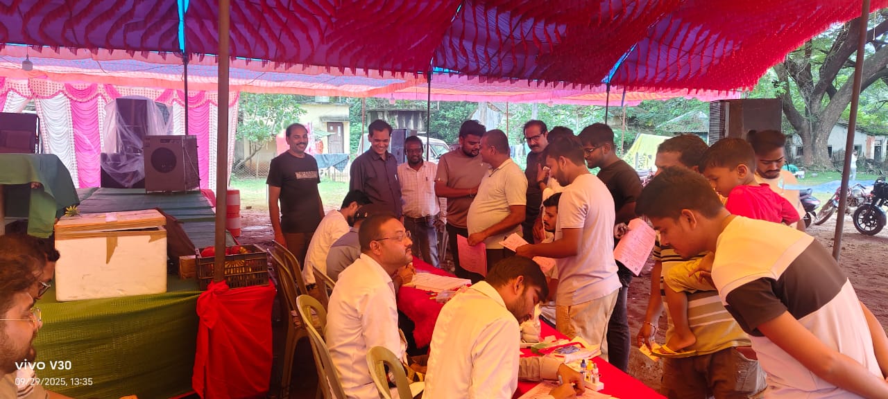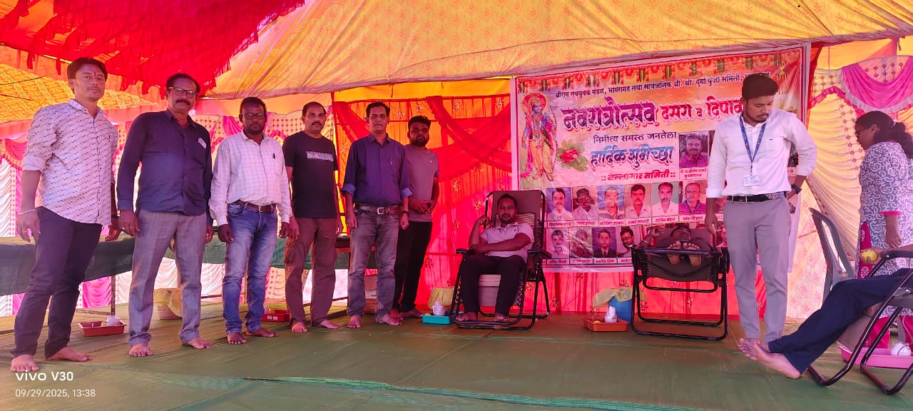 श्री श्री दुर्गापूजा समिती भामरागड तर्फे भव्य रक्तदान आरोग्य व रक्त चाचणी शिबीराचे 29 सप्टेंबर 2025 रोज सोमवार सकाळी 10 वाजेपासून साय 4 वाजेपर्यंत दुर्गा मंदिर समोरील मैदानाचा स्टेजवर आयोजित करण्यात आले होते. गावातील नागरिक तसेच दुर्गापूजा समितीतील मंडळचा कार्यकत्यांनी मिळून एकूण 22 रक्तदात्यांनी रक्तदान केले. समितीतील तसेच जवळपास 50 ते 60 रुग्णचे आरोग्य तसेच रक्त चाचणी करण्यात आले. शिबीरात भामरागड चे तहसीलदार किशोर बागडे यांनी भेट दिली. रक्तसंकलन करिता उपजिल्हा रुग्णालय रक्त पेडी अहेरी येथील डॉ.के.डी.मडावी निखिल कुमार, कोंडापती सुरज बोरकर,अधीपरिचारीका सावित्री मडावी भामरागड येथील तालुका आरोग्य अधिकारी डॉ.मनिष धकाते यांचा उपस्थितित आरोग्य उपकेंद्राचे वैद्यकीय अधिकारी डॉ सतीश तिरणकर त्याची चमू च्या सह्यायाने आलेले रुग्णचे आरोग्य तपासणी तसेच रक्त तपासणी करण्यात आले. यावेळी रक्तदान शिबीराचे संयोजक ओमकार पुजलवार तसेच श्री श्री दुर्गापूजा समितीचे अध्यक्ष प्रदीप कर्मकार, उपाध्यक्ष प्रवीर बिस्वास, सचिव महेंद्र कोठारे,कोषाध्यक्ष राकेश मंडल, सह सचिव अनंत बिस्वास, बिपलाव सरदार, उज्जव बिस्वास अभय बोस, आशु हलदार, तपण मंडल, संतोष बडगे, तपेश हलदार,गोविंद चक्रवती, ज्ञानेश्वर भांडेकर, दादू गफ्फार शेख, असिफ सुफी तसेच समितीचे मंडळी उपस्थित राहून शिबिरात सहकार्य केलेत. आलेला रुग्णांना फळे, बिस्किटे तसेच ORS जुस वाटप करण्यात आले.रक्तदान शिबिरात रक्तदात्यांना मान्यवरांचे हस्ते रक्तदान प्रमाणपत्र वितरीत करण्यात आले.