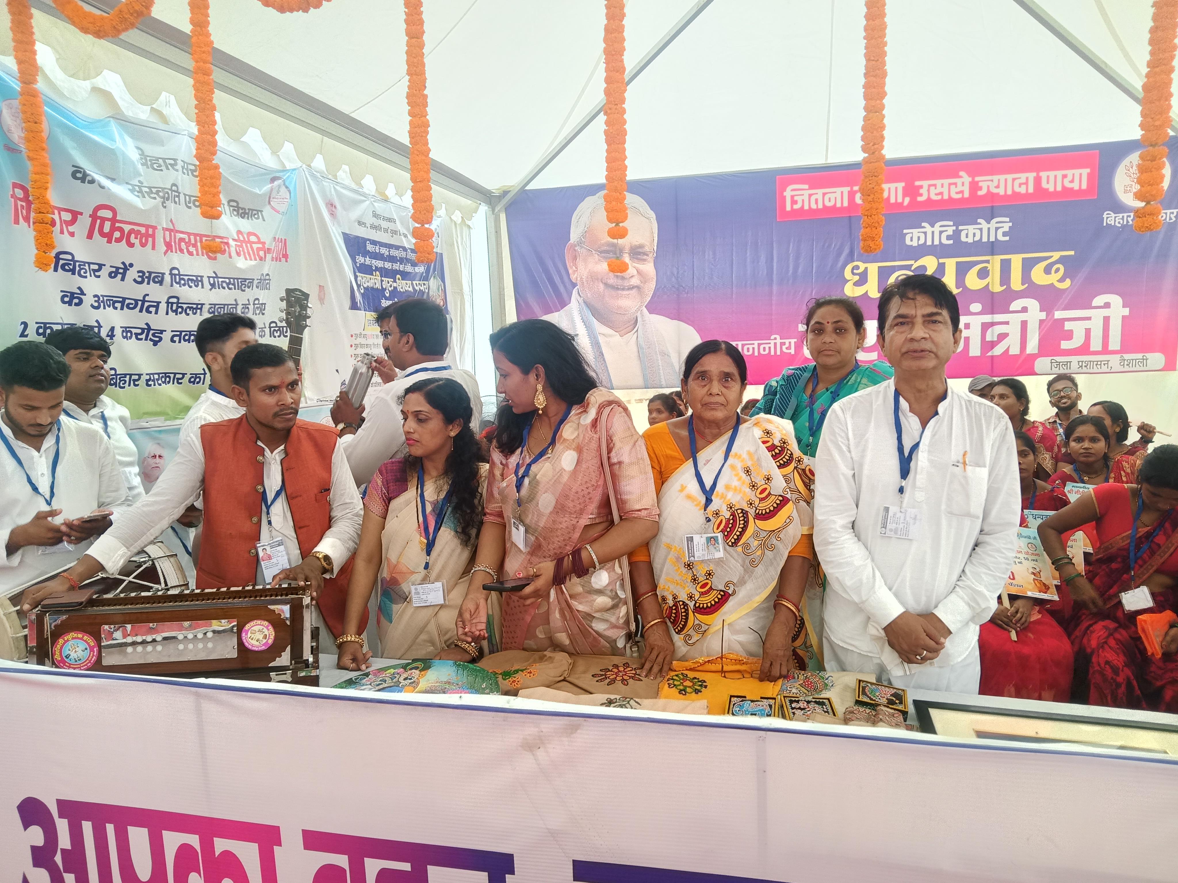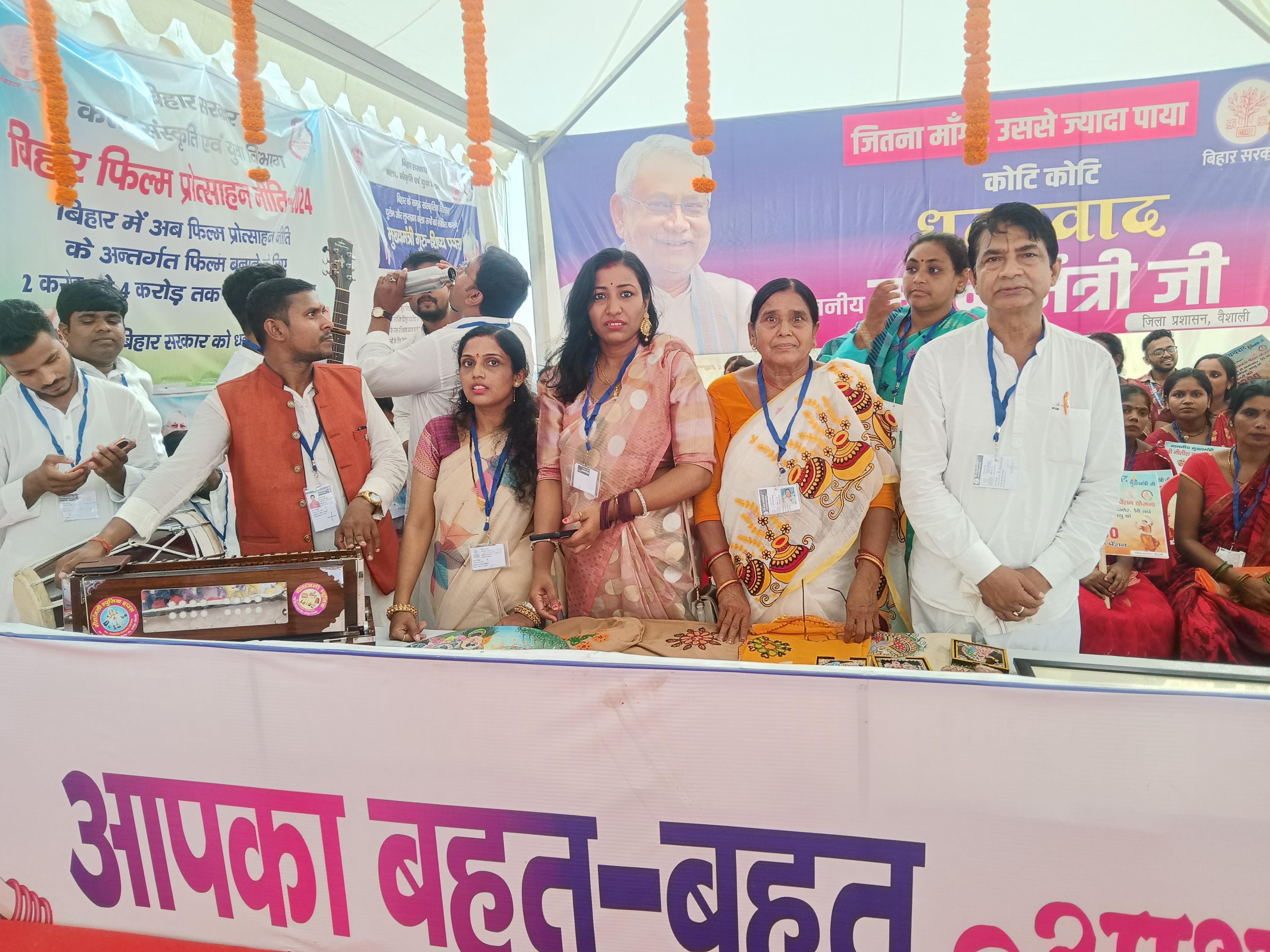 दिनांक 28 सितंबर 2025 को वैशाली जिला के गोरौल प्रखंड अंतर्गत चक व्यास डिग्री कॉलेज का शिलान्यास करने एवं स्टालों का निरीक्षण करने के लिए माननीय मुख्यमंत्री पहुंचे जिसमें बिहार की जनकल्याणकारी योजनाओं का प्रदर्शन स्टॉल का निरीक्षण करने के क्रम में कला संस्कृति एवं युवा विभाग के स्टॉल पर कलाकारों द्वारा स्वागत गीत की प्रस्तुति से मुख्यमंत्री महोदय के बढ़ते कदम रुक गए कलाकारों के गीतों को सुनकर उदघोषक एवं रंगकर्मी बिट्ठल नाथ सूर्य को सम्मानित किया वही एक छात्रा भी सम्मानित हुई मुख्यमंत्री के साथ उपमुख्यमंत्री श्री सम्राट चौधरी, वैशाली के विधायक सिद्धार्थ पटेल ,जिला पदाधिकारी श्रीमती वर्षा सिंह, कला संस्कृति पदाधिकारी शालिनी मैंम ,कलाकारों में विश्वजीत कुमार, विशाल प्रसाद गुप्ता ,चंदन कुमार ,राहुल कुमार सिंह, ईला कुमारी, किरण कुमारी, प्रतिभा कुमारी , तारा कान्त सिंह , नंदेश्वर कुमार, प्रमोद कुमार,रूपक कूमार, सानू कुमार ,अतहर हुसैन खान आदि कलाकार मौजूद रहे l
