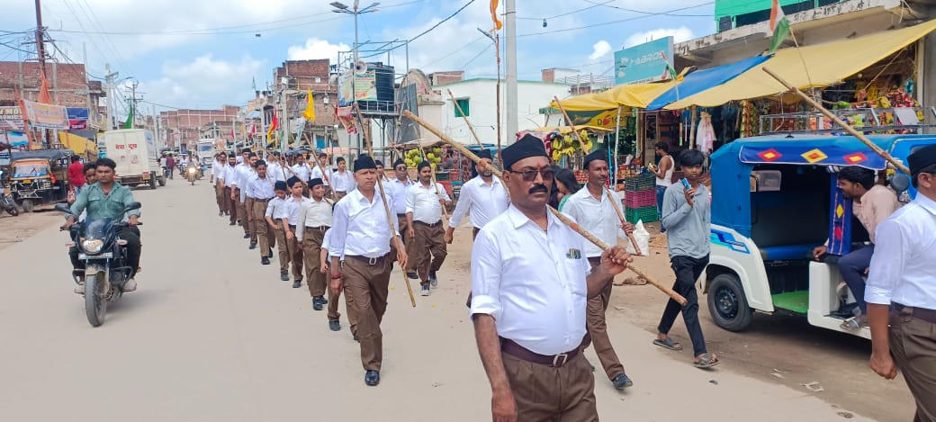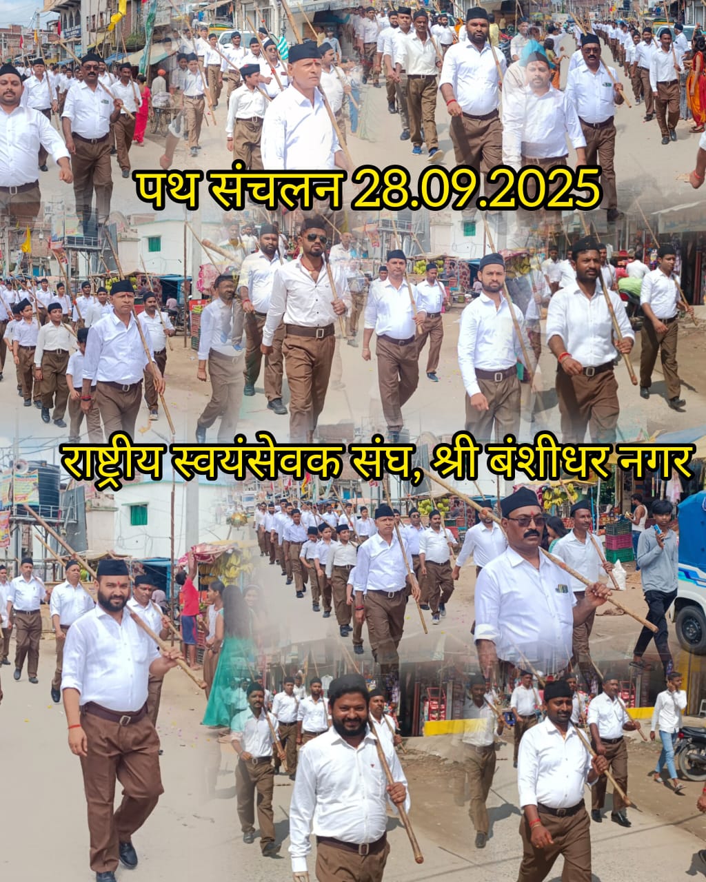 श्री बंशीधर नगर, दिनांक 28.09.2025 राष्ट्रीय स्वयंसेवक संघ के शताब्दी वर्ष के उपलक्ष्य पर श्री बंशीधर नगर खंड द्वारा पथ संचलन लाला बागी हनुमान मंदिर रक्षा से मुख्य पथ होते हुए बस स्टैंड भवनाथपुर मोड से वापस प्लस टू उच्च विद्यालय तक स्वयंसेवकों द्वारा पूर्ण गणवेश में किया गया। रास्ते में स्थानीय नागरिक मातृशक्ति, प्रजापिता ब्रह्मकुमारी, अनुकूल चंद्र, गायत्री परिवार ने स्वयंसेवकों पर पुष्प वर्षा कर उनका स्वागत किया।