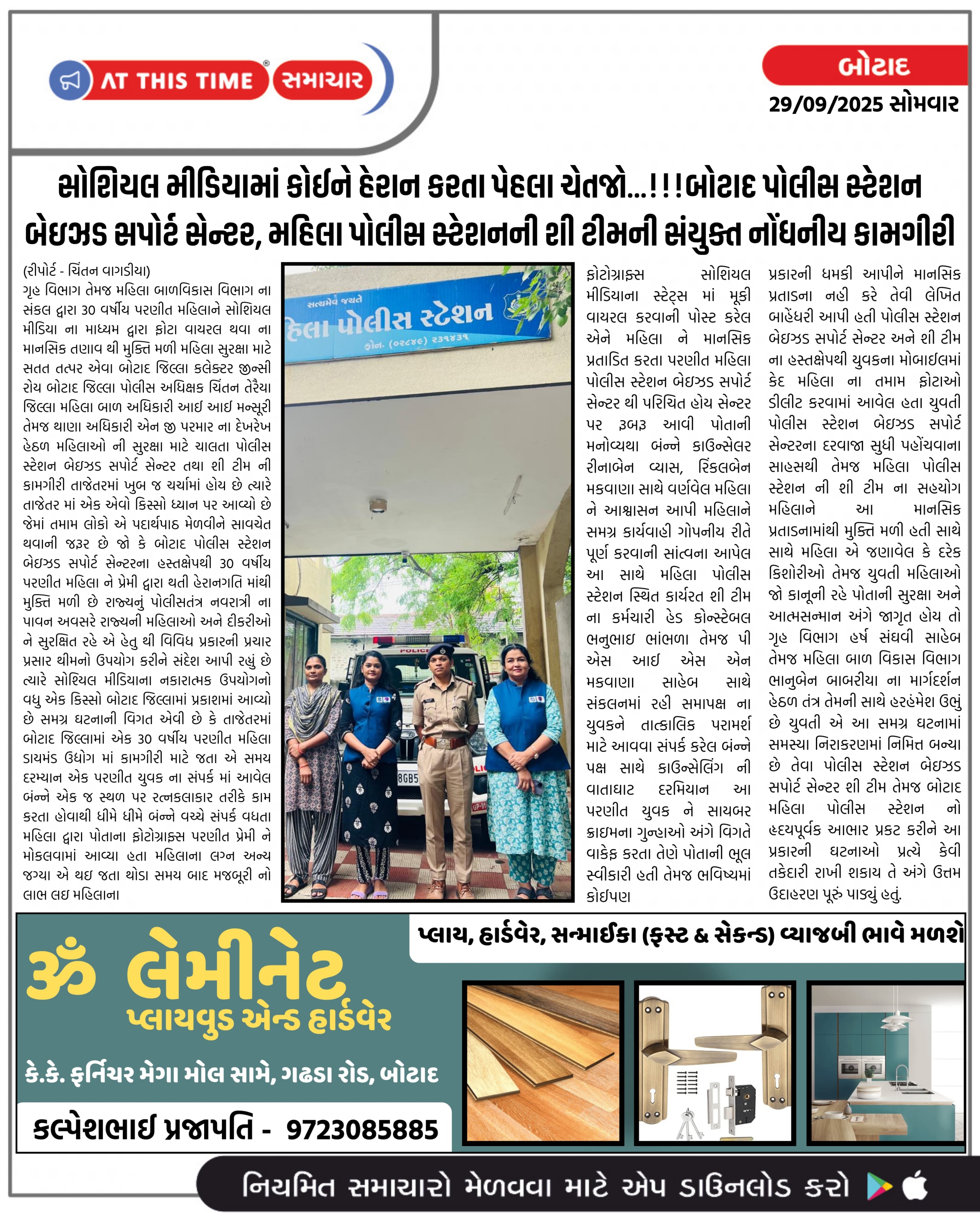 गुजरात भर में महिला और बाल सुरक्षा विभाग द्वारा 30 सितंबर तक "महिला सुरक्षा सप्ताह" मनाया जा रहा है। इस कार्यक्रम के अंतर्गत बोटाद जिले में भी महिला सुरक्षा सप्ताह की जोरदार शुरुआत की गई। इस अवसर पर बोटाद जिला पुलिस प्रमुख चिन्मय पंड्या के मार्गदर्शन में, बोटाद पुलिस स्टेशन, बेशक एपॉइंट सेंटर और महिला पुलिस स्टेशन की SHE टीम ने मिलकर विशेष अभियान चलाया।