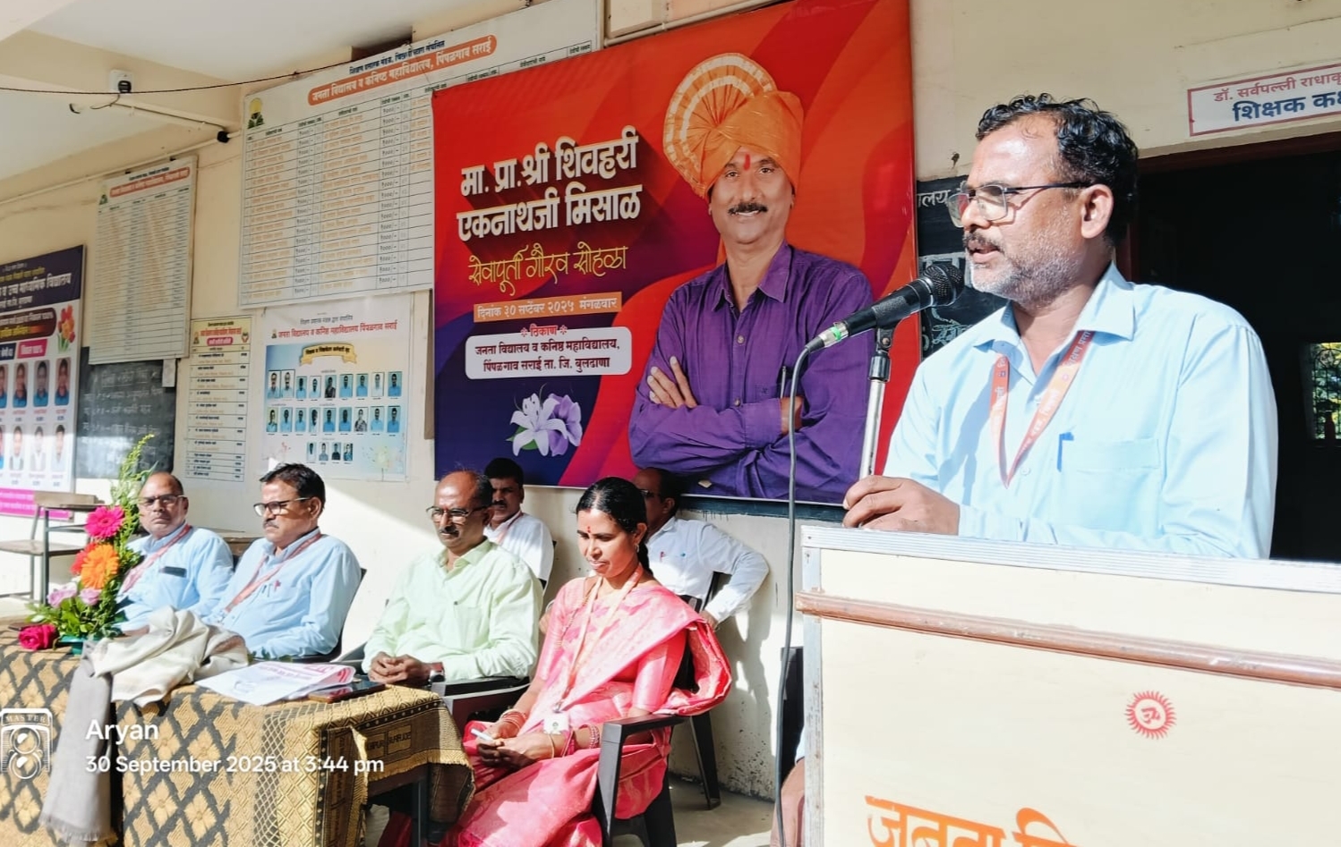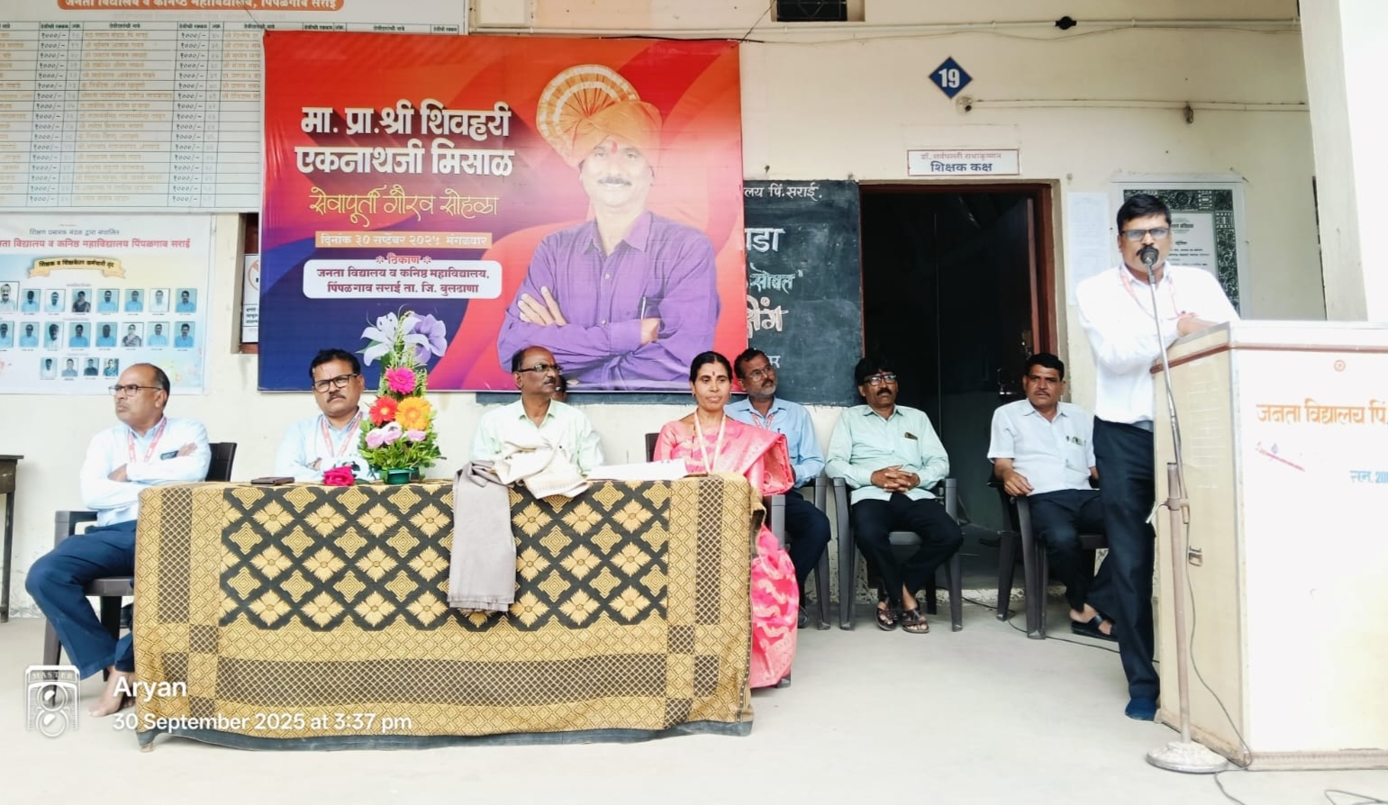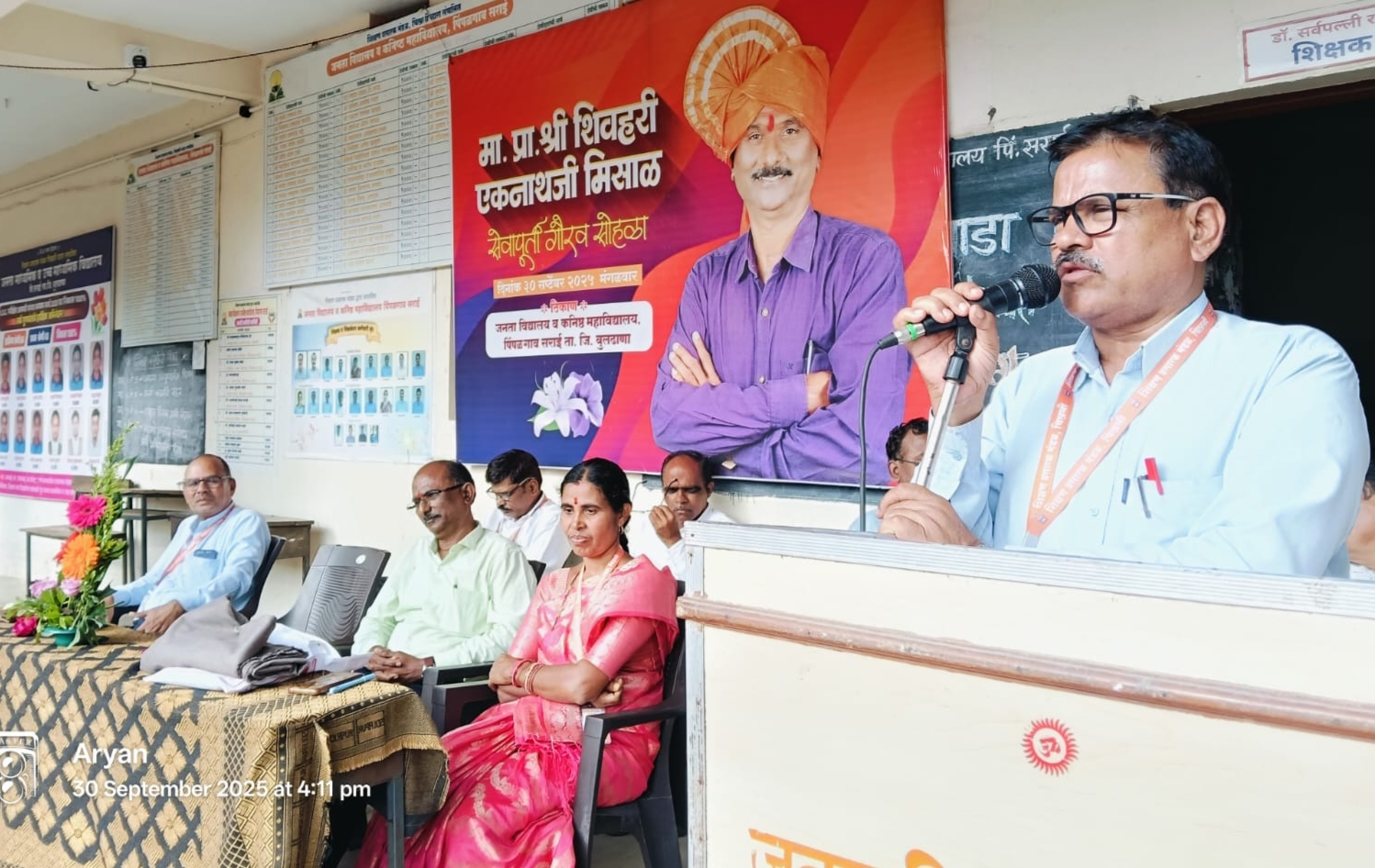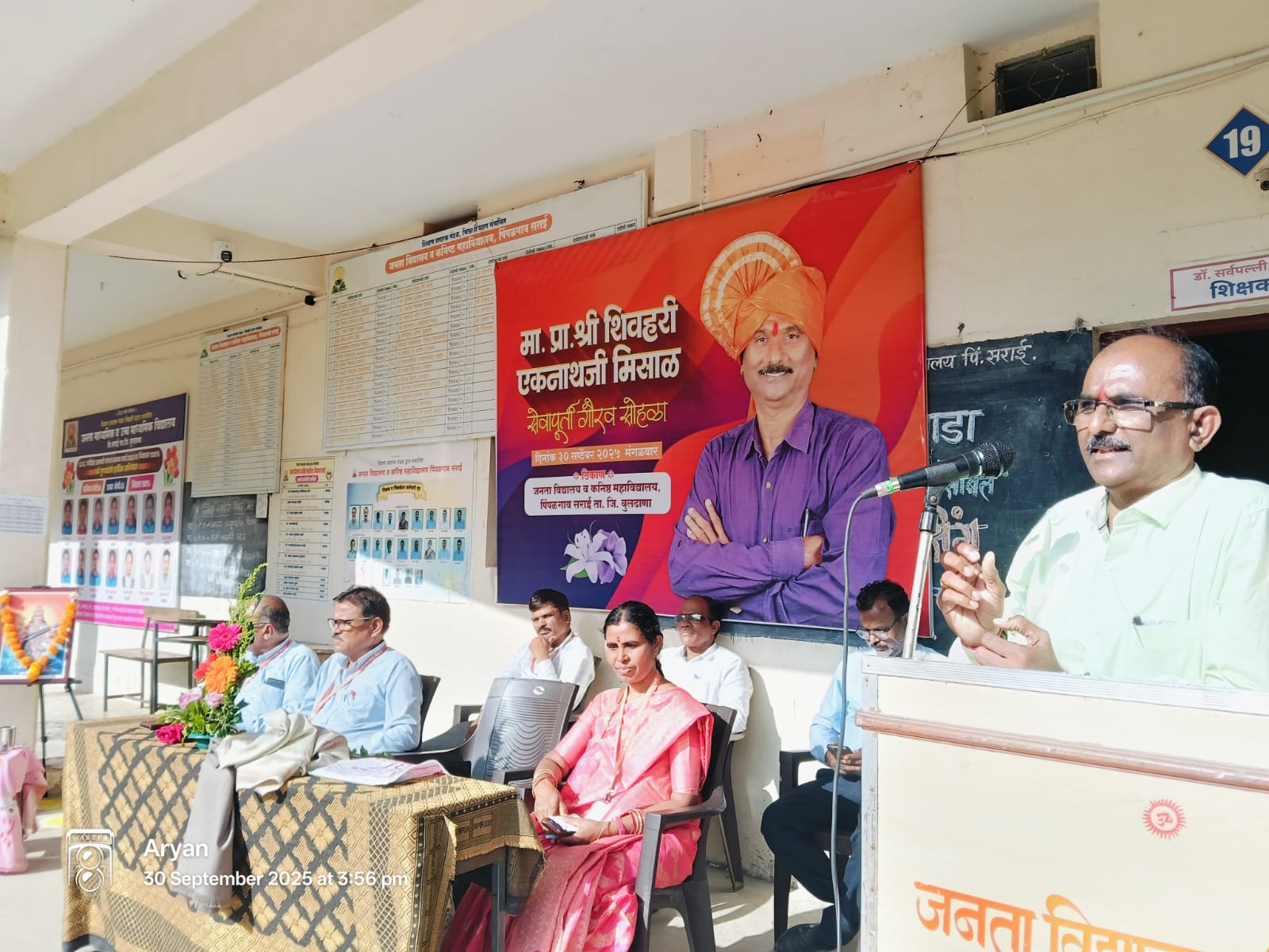 पिंपळगाव सराई (ता. बुलढाणा) : जनता माध्यमिक व उच्च माध्यमिक विद्यालय पिंपळगाव सराई येथे दिनांक ३० सप्टेंबर २०२५ रोजी प्राध्यापक शिवहरी मिसाळ यांच्या सेवापूर्ती सोहळ्याचे आयोजन करण्यात आले. या कार्यक्रमाचे अध्यक्षस्थान विद्यालयाचे प्राचार्य प्रमोद ठोंबरे यांनी भूषविले.कार्यक्रमाचे प्रास्ताविक व प्रा. मिसाळ यांचा परिचय विद्यालयाचे पर्यवेक्षक संजय पिवटे यांनी करून दिला. कार्यक्रमाचे सूत्रसंचालन प्रा. सुधाकर सस्ते यांनी केले तर आभार प्रदर्शन सतीश शेटे यांनी केले.या प्रसंगी विद्यालयाच्या वतीने शाल, श्रीफळ व भेटवस्तू देऊन प्रा. शिवहरी मिसाळ यांचा सत्कार करण्यात आला. मंचावर पर्यवेक्षक संजय पिवटे, जनता प्राथमिक विद्यामंदिराच्या मुख्याध्यापिका सौ. निर्मला खुर्दे व ज्येष्ठ शिक्षक सुदाम चंद्रे यांची उपस्थिती होती.सत्कार प्रसंगी विविध मान्यवरांनी प्रा. मिसाळ यांच्या कार्याचा गौरव केला. कलाशिक्षक रवींद्र खानंदे यांनी “प्रा. शिवहरी मिसाळ म्हणजे मनाने आणि शरीराने काटक असलेले व्यक्तिमत्व आहे” असे गौरवोद्गार काढले. विज्ञान शिक्षक सुहास कुलकर्णी यांनी “मिसाळ सर स्वीकारलेली जबाबदारी पूर्ण क्षमतेने पार पाडत असत” असे म्हटले. तर सौ. निर्मला खुर्दे यांनी “प्रशासकीय कामात आलेल्या अडचणी सोडविणे किंवा मार्गदर्शन करणे यासाठी ते सदैव तत्पर असत” असे सांगितले.सत्काराला उत्तर देताना प्रा. शिवहरी मिसाळ म्हणाले, “वेगवेगळ्या क्षेत्रातील कर्तबगार आणि यशस्वी झालेले विद्यार्थी हेच माझे या सेवानिवृत्तीच्या प्रसंगी समाधान आहे.”अध्यक्षीय भाषणात प्राचार्य प्रमोद ठोंबरे यांनी नमूद केले की, “शिवहरी मिसाळ यांचा उल्लेखनीय गुण म्हणजे स्पष्टवक्तेपणा आणि प्रामाणिकपणे काम करण्याची वृत्ती होय.”सर्व शिक्षक व कर्मचारी बंधू-भगिनींच्या सहकार्याने हा सेवापूर्ती सोहळा उत्साहपूर्ण व भावनिक वातावरणात संपन्न झाला.