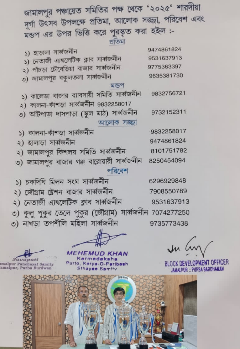 জামালপুর পঞ্চায়েত সমিতির পক্ষ থেকে শারদ সম্মান ২০২৫ ঘোষণা