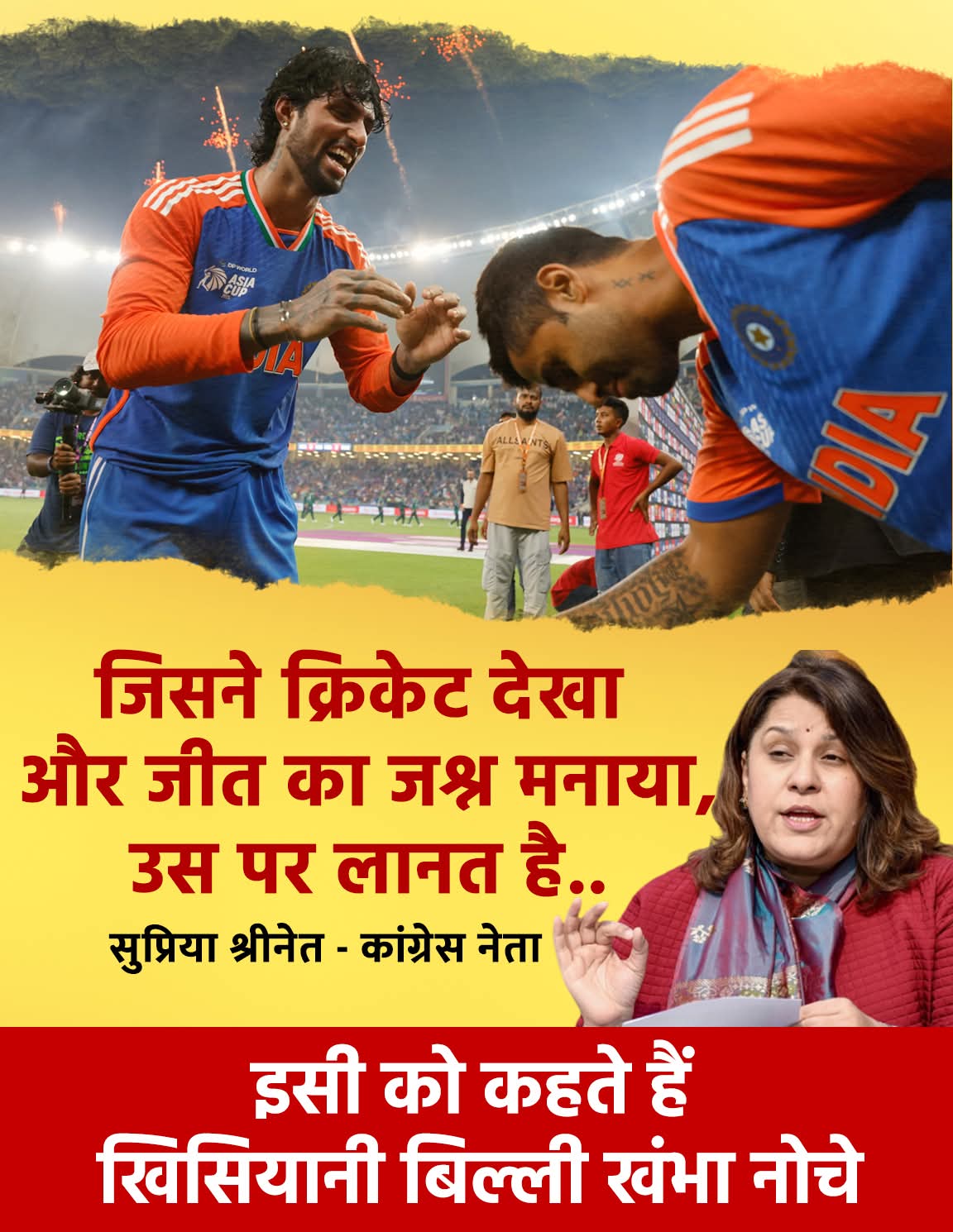 एशिया कप में भारत की जीत ने पूरे देश को उत्साह और गर्व से भर दिया। हर चौके-छक्के पर तिरंगे की लहराहट और हर विकेट पर भारत माता की जयकार गूंजती रही। लेकिन जब देश एक सुर में जश्न मना रहा था, तब कांग्रेस नेता सुप्रिया श्रीनेट का बयान सामने आया –