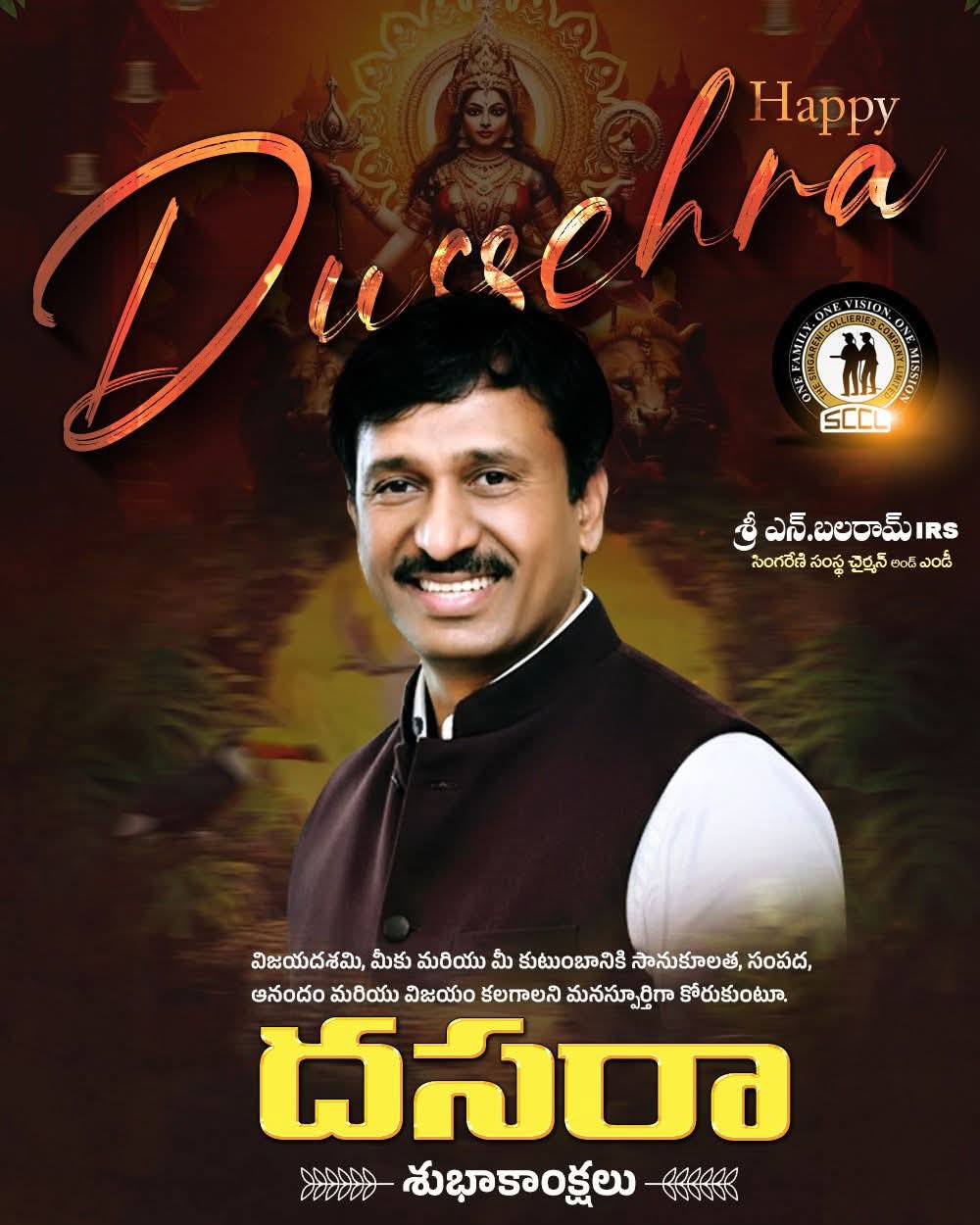 ఈ దసరా తెలంగాణ ప్రజల మరియు సింగరేణి కార్మికుల జీవితాలలో వెలుగులు నింపాలని మనసారా కోరుకుంటూ విజయదశమి శుభాకాంక్షలు.