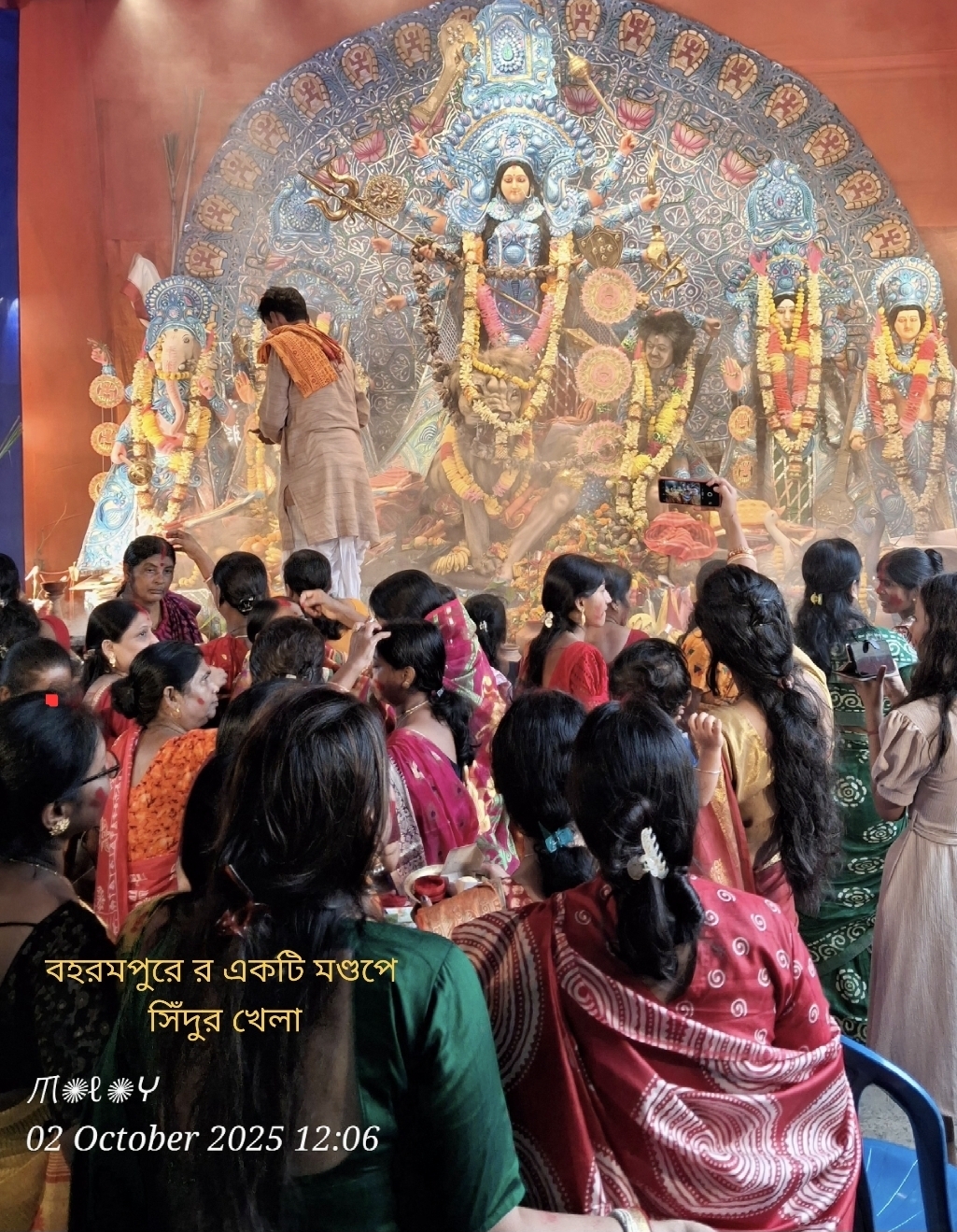 বহরমপুরে র একটি পুজো মণ্ডপে সিঁদুর খেলা চলছে সকালে।