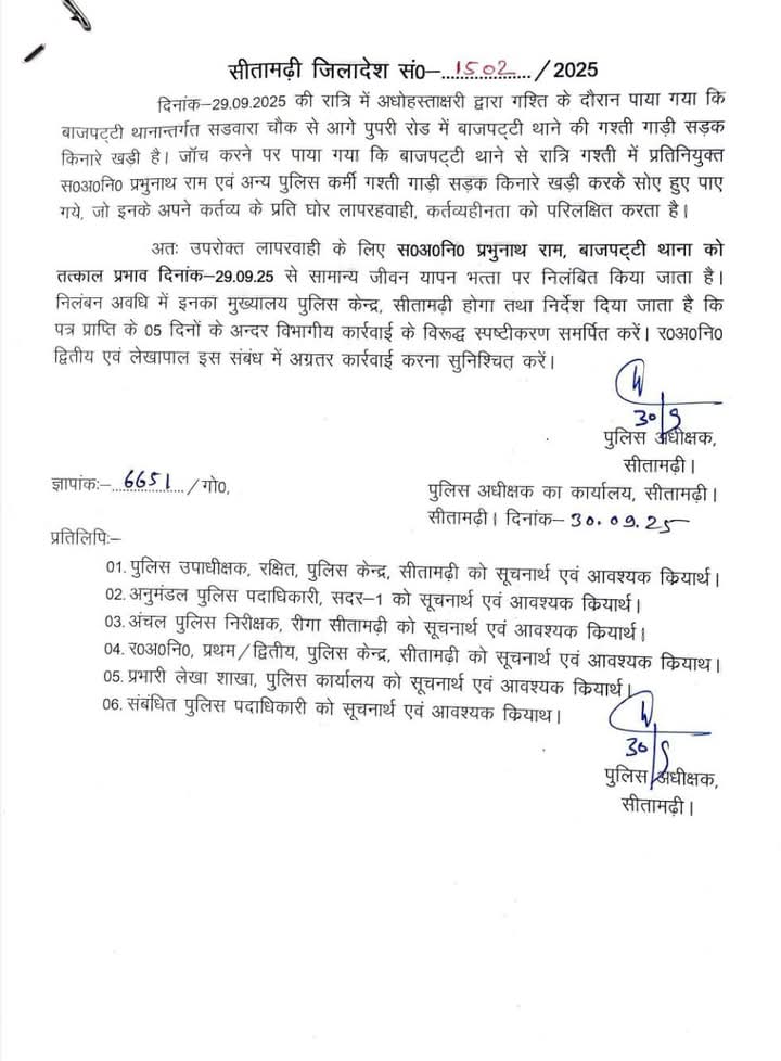 *ब्रेकिंग:- सीतामढ़ी SP अमित रंजन की बड़ी कार्रवाई,सड़क किनारे गाड़ी लगाकर आराम कर रहे सहायक अवर निरीक्षक प्रभुनाथ राम को एसपी ने किया सस्पेंड,बाजपट्टी थाना क्षेत्र में गश्ती पर निकले दारोगा जी आराम कर रहे थे जब प्रशासन ही सोए गा तो जनता का क्या होगा