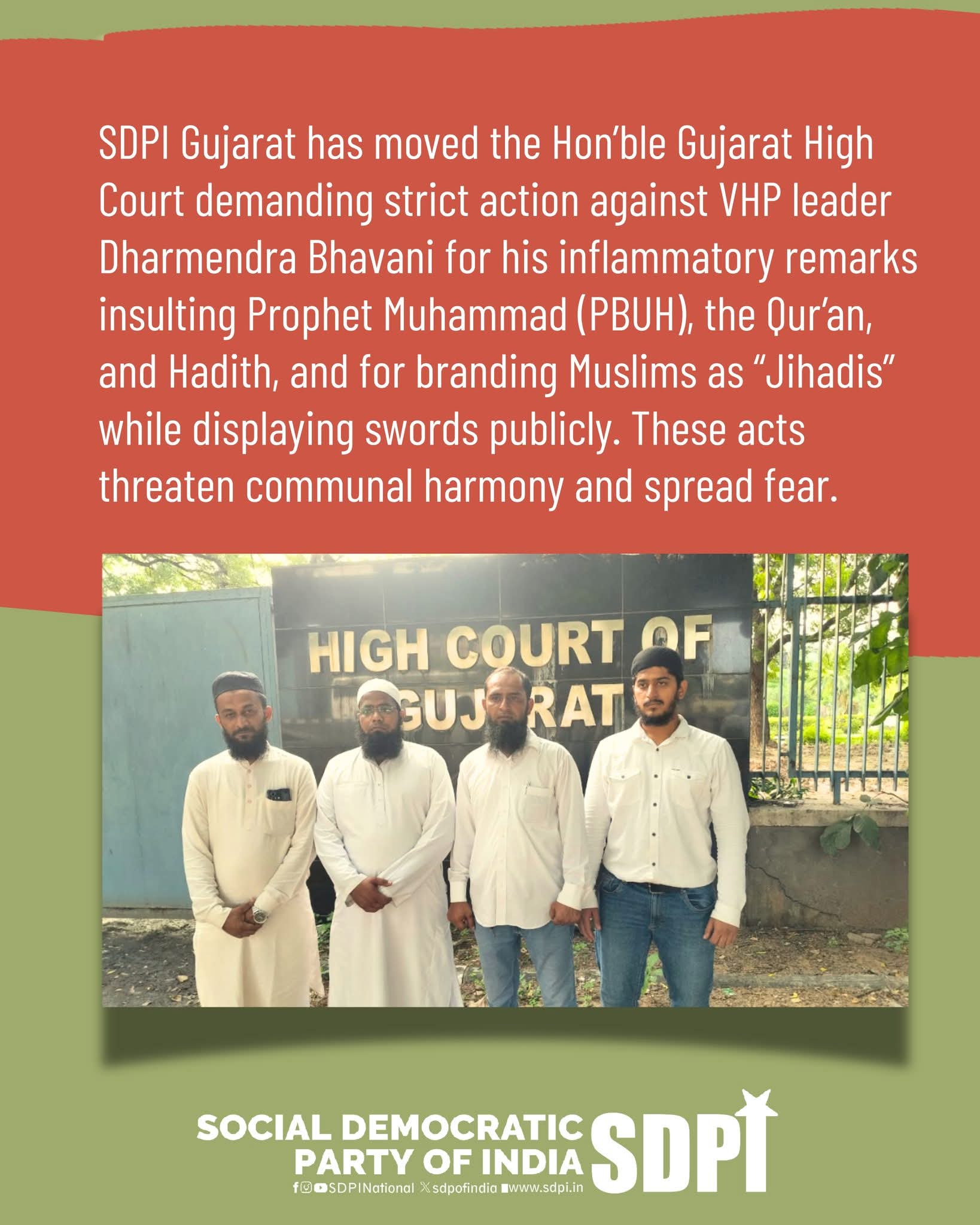 The Social Democratic Party of India Gujarat has filed a petition before the Hon’ble Gujarat High Court seeking the inclusion of stringent provisions in the FIR against Vishwa Hindu Parishad (VHP) leader Dharmendra Bhavani.