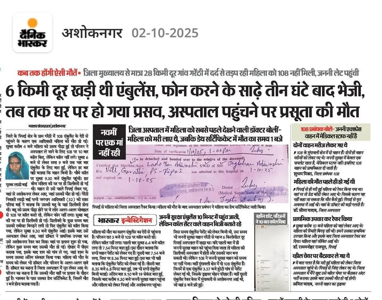 यह अखबार की कटिंग नहीं है यह देश की बदहाल स्थिति का चेहरा है। सोचने वाली बात है 6 किलोमीटर दूर खड़ी एंबुलेंस 3:30 घंटे में स्थान तक नहीं पहुंच पाई।