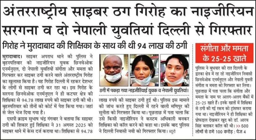 शादी.कॉम के जरिये लोगों को फंसाकर व फर्जी कस्टम अधिकारी बनकर मनी लाड्रिंग के केस में फंसाने की धमकी देकर साईबर ठगी करने वाले गिरोह का खुलासा करते हुये थाना साईबर क्राईम पुलिस द्वारा 03 अन्तरराष्ट्रीय साईबर ठगों को गिरफ्तार किया गया।