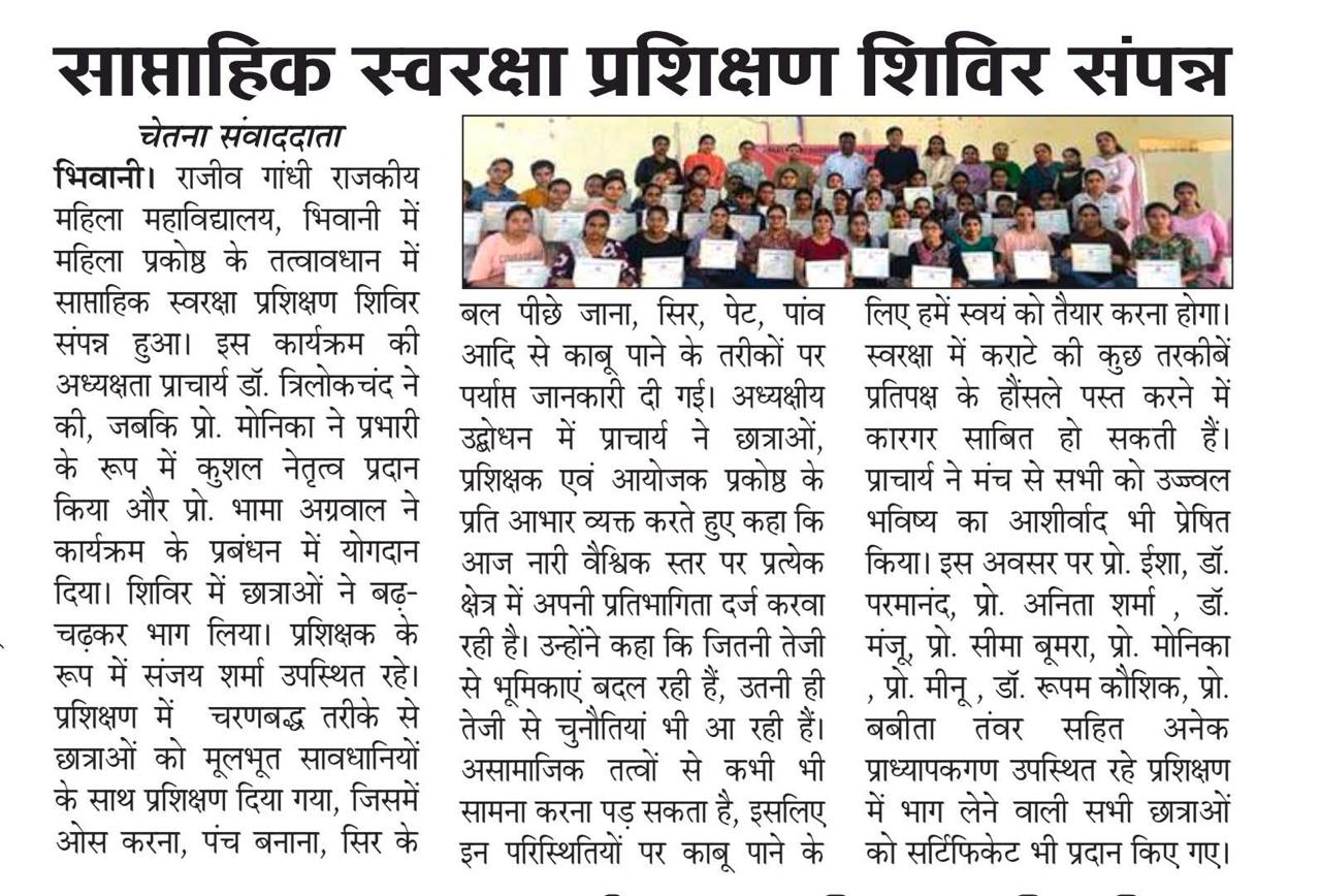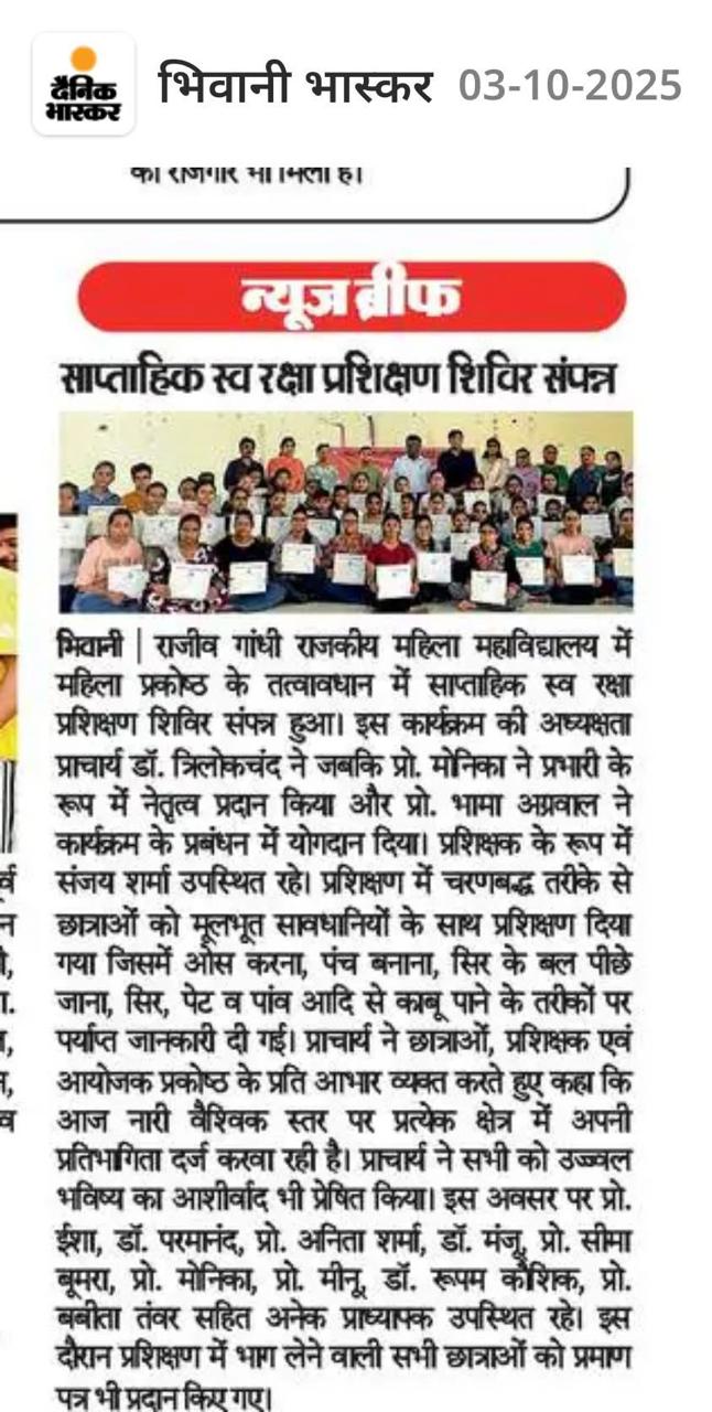 Bhiwani, 3 October 2025:Rajiv Gandhi Government Women’s College, Bhiwani mein महिला प्रकोष्ठ ke तत्वावधान mein ek साप्ताहिक आत्मरक्षा प्रशिक्षण शिविर safalta se संपन्न हुआ.Is कार्यक्रम ki अध्यक्षता कॉलेज की प्राचार्या डॉ. त्रिलोकेचंद्र ne ki, jabki प्रो. मोनीका ने प्रभारी ke roop mein नेतृत्व किया. प्रो. भामा अंबावल ne भी कार्यक्रम के संचालन में सक्रिय योगदान दिया.प्रशिक्षक ke roop mein संजय शर्मा बाबा ne छात्राओं ko आत्मरक्षा ke vividh practical tareeke सिखाए. प्रशिक्षण mein शामिल छात्राओं ko ओस करना, पंच बनाना, सिर और पेट पर वार से बचाव, पकड़ से छूटने ke तरीके jaise महत्वपूर्ण कौशल सिखाए गए.छात्राओं ne उत्साहपूर्वक भाग लिया aur शिविर ke अंत mein उन्हें प्रमाण पत्र भी वितरित किए गए. इस अवसर पर कई प्राध्यापक और स्थानीय गणमान्य व्यक्ति भी मौजूद रहे.प्राचार्य ne कहा ki ऐसे कार्यक्रम नारी शक्ति को सशक्त aur आत्मनिर्भर बनाने ke liye अत्यंत आवश्यक हैं. उन्होंने छात्राओं ko उज्जवल भविष्य ki शुभकामनाएं दीं.