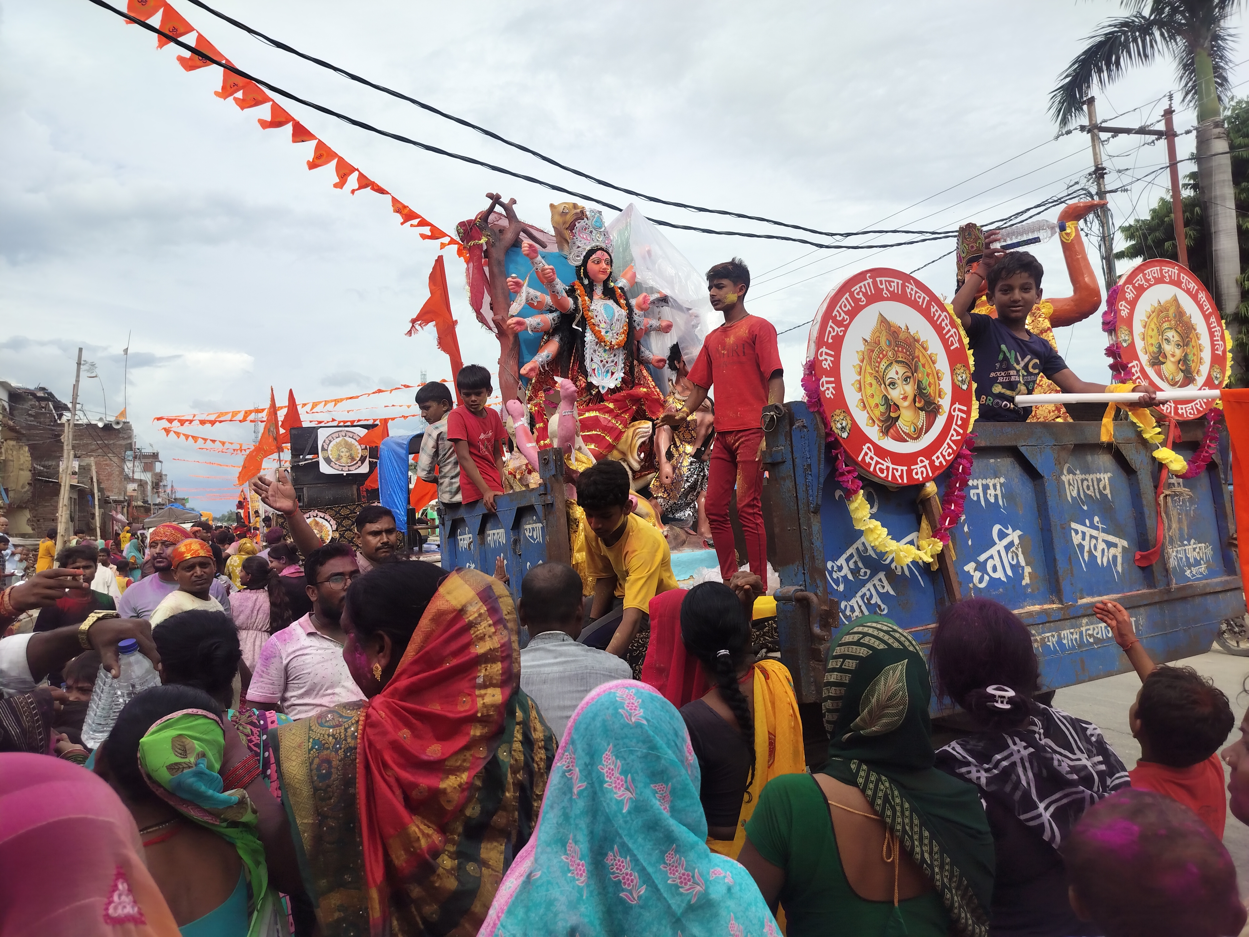 विकास खण्ड मिठौरा क्षेत्र अंतर्गत मिठौरा में आज माँ दुर्गा के प्रतिमा को विसर्जन करने केलिए आज मिठौरा क्षेत्र के लोग बड़ी शांति के साथ भव्य झाकी एवं जुलूस निकाले जिसमे प्रधान प्रत्याशी मकसूदन निगम जुलूस में शामिल हुए लोगो को गुड़ और पानी पिलाकर सभी लोगों का स्वागत किये और जिसमे प्रशासन का बहुत ही मदद रहा पुलिस फोर्स के सभी लोग साथ साथ रहे जिससे शांति भंग न हो शांति पुण ढंग से जुलूस निकल सके और लोगों ने भक्ति गीत बजा कर समस्त ग्रामवासी भक्ति में झूमते,गाते हुए लोगों ने माता का विदाई किए जो मिठौरा से निकल कर निचलौल से होते हुए झूलनीपुर से आगे तरह चार पुल बैठवलिया में दुर्गा जी के प्रतिमा को गंडक नदी में जल प्रवाह किए