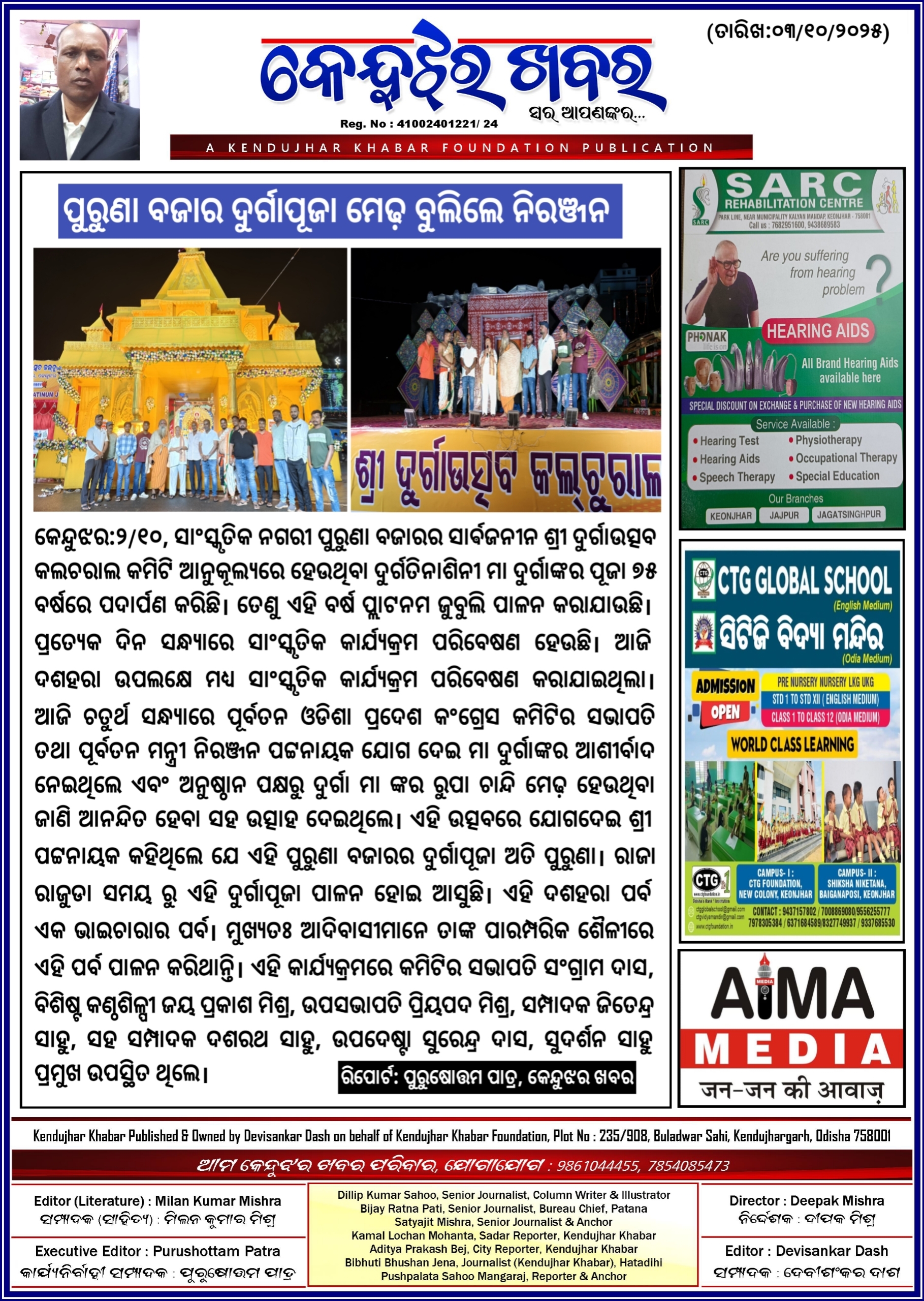 ପୁରୁଣା ବଜାର ଦୁର୍ଗାପୂଜା ମେଢ଼ ବୁଲିଲେ ନିରଞ୍ଜନ । କେନ୍ଦୁଝର: ସାଂସ୍କୃତିକ ନଗରୀ ପୁରୁଣା ବଜାରର ସାର୍ଵଜନୀନ ଶ୍ରୀ ଦୁର୍ଗାଉତ୍ସବ କଲଚରାଲ କମିଟି ଆନୁକୂଲ୍ୟରେ ହେଉଥିବା ଦୁର୍ଗତିନାଶିନୀ ମା ଦୁର୍ଗାଙ୍କର ପୂଜା ୭୫ ବର୍ଷରେ ପଦାର୍ପଣ କରିଛି । ତେଣୁ ଏହି ବର୍ଷ ପ୍ଲାଟନମ ଜୁବୁଲି ପାଳନ କରାଯାଉଛି । ପ୍ରତ୍ୟେକ ଦିନ ସନ୍ଧ୍ୟାରେ ସାଂସ୍କୃତିକ କାର୍ଯ୍ୟକ୍ରମ ପରିବେଷଣ ହେଉଛି । ଆଜି ଦଶହରା ଉପଲକ୍ଷେ ମଧ୍ୟ ସାଂସ୍କୃତିକ କାର୍ଯ୍ୟକ୍ରମ ପରିବେଷଣ କରାଯାଇଥିଲା । ଆଜି ଚତୁର୍ଥ ସନ୍ଧ୍ୟାରେ ପୂର୍ବତନ ଓଡିଶା ପ୍ରଦେଶ କଂଗ୍ରେସ କମିଟିର ସଭାପତି ତଥା ପୂର୍ବତନ ମନ୍ତ୍ରୀ ନିରଞ୍ଜନ ପଟ୍ଟନାୟକ ଯୋଗ ଦେଇ ମା ଦୁର୍ଗାଙ୍କର ଆଶୀର୍ବାଦ ନେଇଥିଲେ ଏବଂ ଅନୁଷ୍ଠାନ ପକ୍ଷରୁ ଦୁର୍ଗା ମା ଙ୍କର ରୁପା ଚାନ୍ଦି ମେଢ଼ ହେଉଥିବା ଜାଣି ଆନନ୍ଦିତ ହେବା ସହ ଉତ୍ସାହ ଦେଇଥିଲେ । ଏହି ଉତ୍ସବରେ ଯୋଗଦେଇ ଶ୍ରୀ ପଟ୍ଟନାୟକ କହିଥିଲେ ଯେ ଏହି ପୁରୁଣା ବଜାରର ଦୁର୍ଗାପୂଜା ଅତି ପୁରୁଣା । ରାଜା ରାଜୁଡା ସମୟ ରୁ ଏହି ଦୁର୍ଗାପୂଜା ପାଳନ ହୋଇ ଆସୁଛି । ଏହି ଦଶହରା ପର୍ବ ଏକ ଭାଇଚାରାର ପର୍ବ । ମୁଖ୍ୟତଃ ଆଦିବାସୀମାନେ ତାଙ୍କ ପାରମ୍ପରିକ ଶୈଳୀରେ ଏହି ପର୍ବ ପାଳନ କରିଥାନ୍ତି । ଏହି କାର୍ଯ୍ୟକ୍ରମରେ କମିଟିର ସଭାପତି ସଂଗ୍ରାମ ଦାସ, ବିଶିଷ୍ଟ କଣ୍ଠଶିଳ୍ପୀ ଜୟ ପ୍ରକାଶ ମିଶ୍ର, ଉପସଭାପତି ପ୍ରିୟପଦ ମିଶ୍ର, ସମ୍ପାଦକ ଜିତେନ୍ଦ୍ର ସାହୁ, ସହ ସମ୍ପାଦକ ଦଶରଥ ସାହୁ, ଉପଦେଷ୍ଟା ସୁରେନ୍ଦ୍ର ଦାସ, ସୁଦର୍ଶନ ସାହୁ ପ୍ରମୁଖ ଉପସ୍ଥିତ ଥିଲେ । ରିପୋର୍ଟ: ପୁରୁଷୋତ୍ତମ ପାତ୍ର, କେନ୍ଦୁଝର ଖବର।