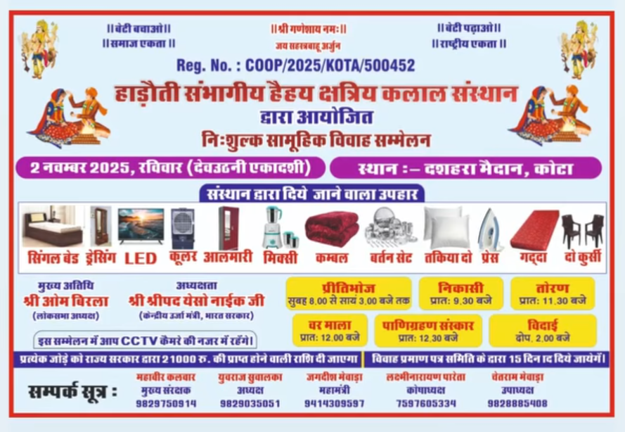 कोटा। हाड़ौती संभागीय हर्षद क्षत्रिय कलाल संस्थान के तत्वावधान में निःशुल्क सामूहिक विवाह सम्मेलन का आयोजन 2 नवम्बर 2025, रविवार (देवउठनी एकादशी) को किया जाएगा। यह आयोजन दशहरा मैदान, कोटा में सम्पन्न होगा।