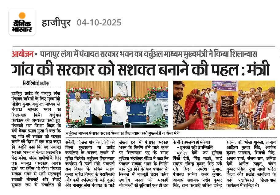 मुख्यमंत्री नीतीश कुमार ने वर्चुअल कार्यक्रम कर पानापुर लंगा में पंचायत सरकार भवन का किया शिलान्यास...... दैनिक भास्कर समाचार पत्र ने प्रमुखता के साथ किया खबर को प्रकाशित.....