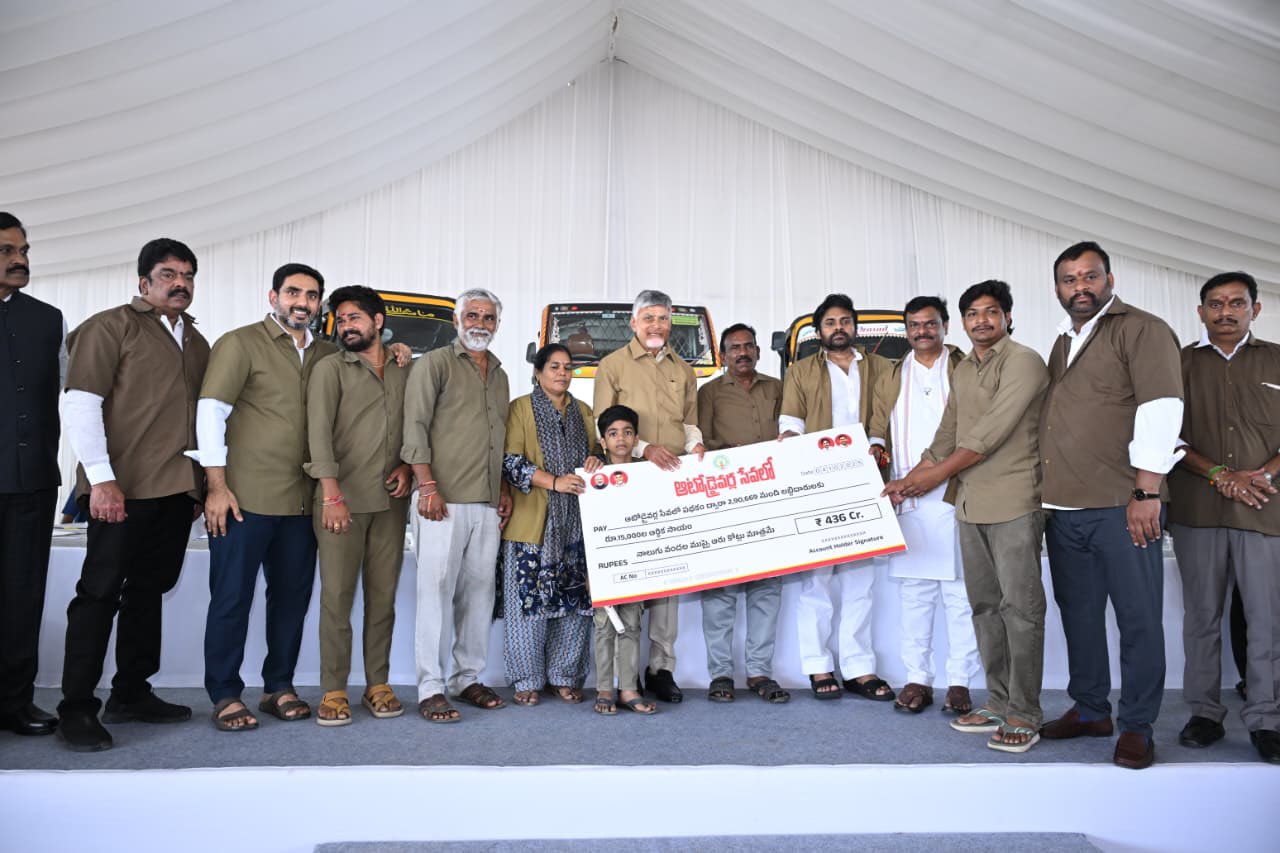 అమరావతి (AIMA MEDIA ): ఆటో డ్రైవర్ల సేవలో పథకం ప్రారంభ కార్యక్రమంలో ముఖ్యమంత్రితో కలిసి పాల్గొన్న ఉప ముఖ్యమంత్రి పవన్ కళ్యాణ్.ఈ సందర్భంగా ఆటో డ్రైవర్లను ఉద్దేశించి ఆయన ప్రసంగిస్తూ ఆటో డ్రైవర్ల సేవలో పథకం ద్వారా 2 లక్షల 90 వేల మందికి పైగా ఆటో డ్రైవర్ సోదరులకు లబ్ధి చేకూరనున్నట్లు, ఆర్థిక ఇబ్బందుల్లో ఉన్నప్పటికీ, వారికి ఊతం ఇవ్వడానికి సుమారు 436 కోట్ల రూపాయల భారాన్ని రాష్ట్ర ప్రభుత్వం మోస్తుందని తెలిపారు.ఈ కార్యక్రమంలో సహచర మంత్రులు నారలోకేష్, మండిపల్లి రాంప్రసాద్ రెడ్డి , బీజేపీ రాష్ట్ర అధ్యక్షులు మాధవ బీజేపీ, విజయవాడ ఎంపీ కేశినేని శివదత్ , విజయవాడ సెంట్రల్ ఎమ్మెల్యే శ్రీ బొండా ఉమామహేశ్వరరావు, అధికారులు పాల్గొన్నారు.