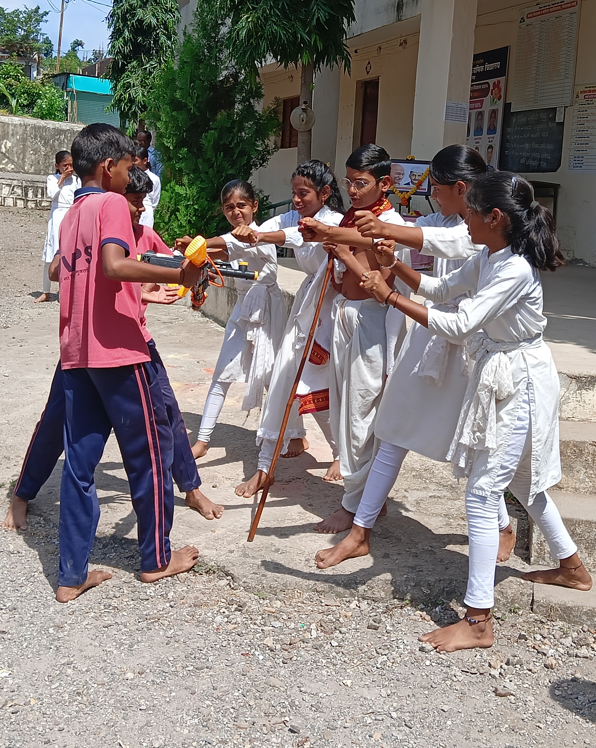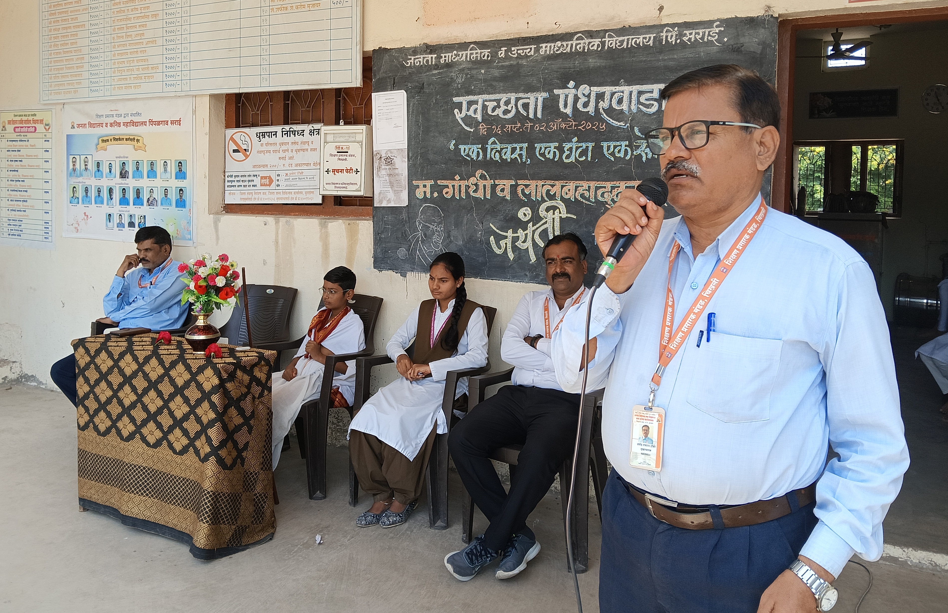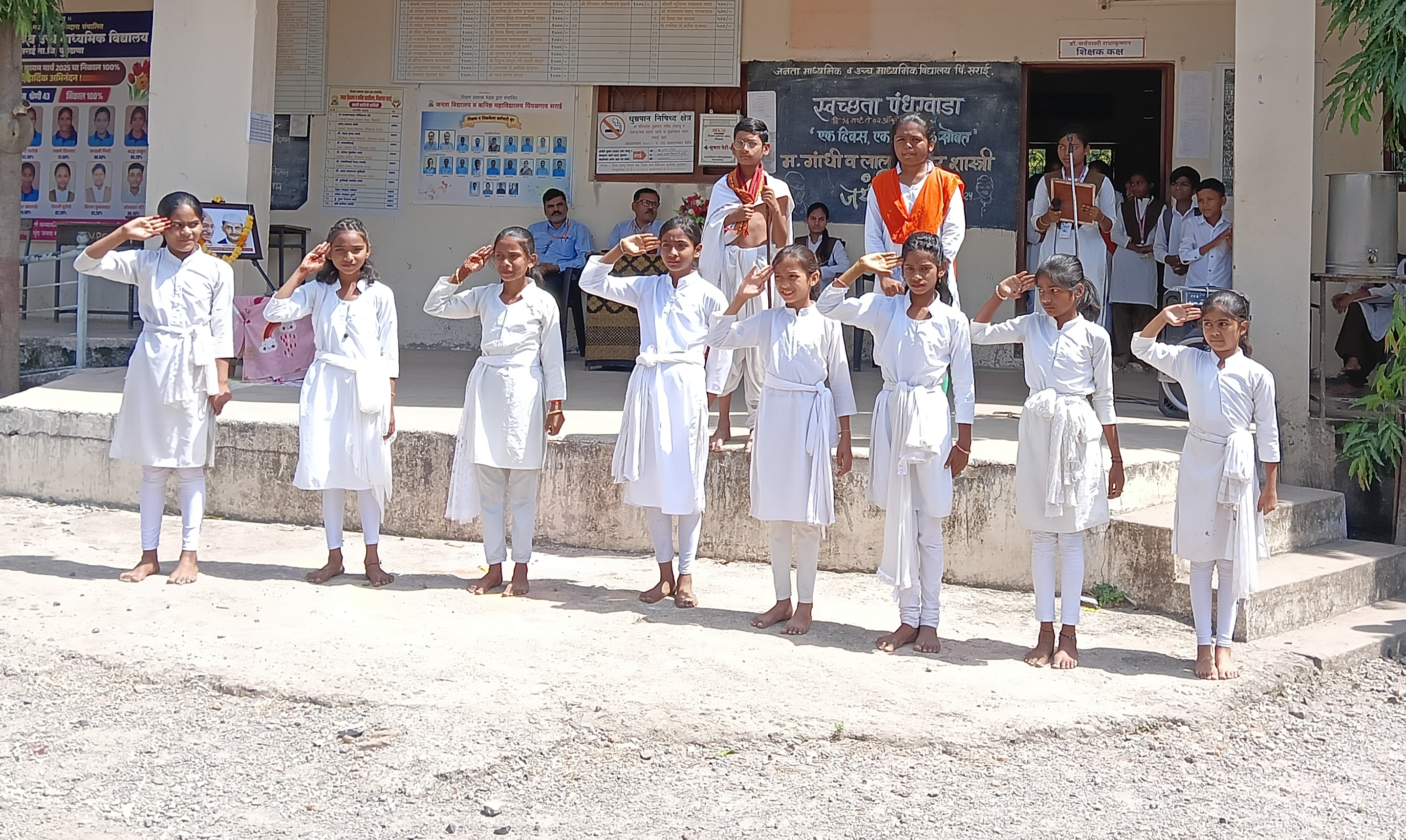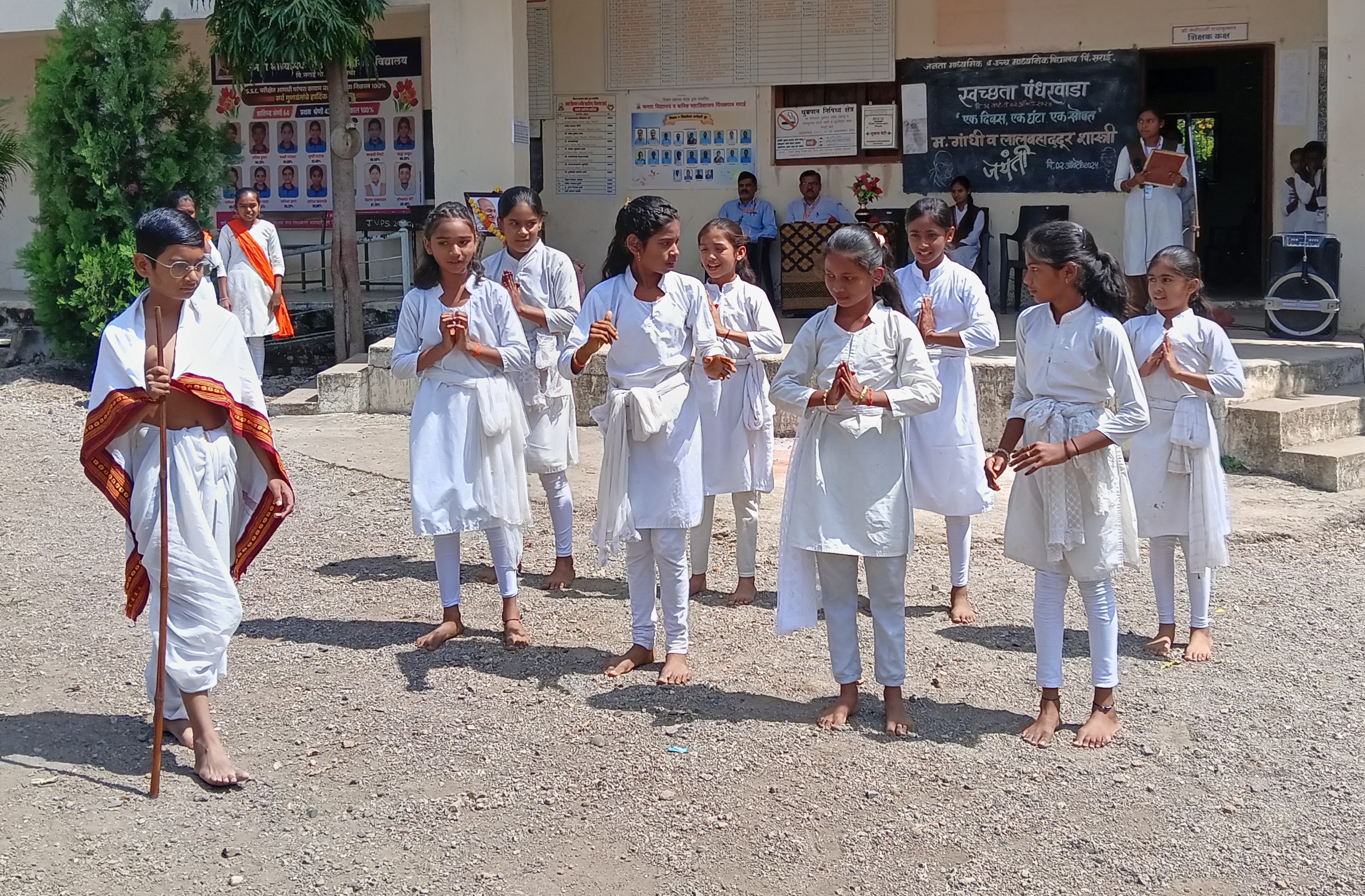 दि. ३ ऑक्टोबर, पिंपळगाव सराई . जनता विद्यालय पिंपळगाव सराई येथे राष्ट्रपिता महात्मा गांधी व स्वतंत्र भारताचे दुसरे पंतप्रधान लालबहादूर शास्त्री यांच्या जयंतीनिमित्त भव्य कार्यक्रमाचे आयोजन करण्यात आले. या कार्यक्रमातून विद्यार्थ्यांनी विविध उपक्रमांद्वारे या महान नेत्यांना आदरांजली वाहिली. कार्यक्रमाची वैशिष्ट्यपूर्ण बाब म्हणजे अध्यक्षस्थानी पारंपरिक गांधी वेशभूषेत आलेला इयत्ता सहावीतील विद्यार्थी समर्थ खेन्ते याची उपस्थिती होय. विद्यार्थ्यांमधील या अनोख्या अध्यक्षीय भूमिकेने कार्यक्रमाला विशेष महत्त्व प्राप्त झाले. मंचावर मार्गदर्शक सोनम मुकलवार, विद्यालयाचे प्राचार्य प्रमोद ठोंबरे, ज्येष्ठ शिक्षक रवींद्र खानंदे तसेच कार्यक्रमाचे आयोजक देविदास दळवी यांची मान्यवर उपस्थिती होती. या वेळी प्राचार्य प्रमोद ठोंबरे यांनी विद्यार्थ्यांना मार्गदर्शन करताना गांधीजींच्या सत्य व अहिंसेच्या तत्त्वज्ञानाचे महत्त्व अधोरेखित केले. तसेच शास्त्रीजींचे "जय जवान, जय किसान" हे घोषवाक्य आजच्या काळातही तितकेच प्रेरणादायी असून त्याचा जीवनात अवलंब करणे आवश्यक असल्याचे सांगितले. ज्येष्ठ शिक्षक रवींद्र खानंदे यांनी महापुरुषांच्या विचारातून शिकण्याचा संदेश दिला. कार्यक्रमात विद्यार्थिनी वैष्णवी सोनुने हिने प्रभावी सूत्रसंचालन केले, तर आभार प्रदर्शन दिया देशमुख विद्यार्थिनीनेच करून कार्यक्रमाला सुंदर पूर्णविराम दिला. कार्यक्रमाचे प्रमुख आकर्षण म्हणजे इयत्ता सहावीच्या विद्यार्थ्यांनी सादर केलेली नाटिका होती. या नाटिकेतून गांधीजींचे साधेपण, सत्याग्रह, अहिंसा आणि शास्त्रीजींच्या कर्तृत्वपूर्ण जीवनाचे प्रभावी चित्रण विद्यार्थ्यांनी सादर केले. नाटिकेला उपस्थित मान्यवर व प्रेक्षकांनी उत्स्फूर्त दाद दिली. या कार्यक्रमामुळे विद्यार्थ्यांमध्ये देशभक्तीची प्रेरणा जागवली गेली असून, महान नेत्यांच्या कार्याचा आदर्श घेऊन जीवन जगण्याचे मौल्यवान संस्कार या निमित्ताने विद्यार्थ्यांना मिळाले. विद्यालयाच्या सर्व घटकांचे सहकार्य लाभले
