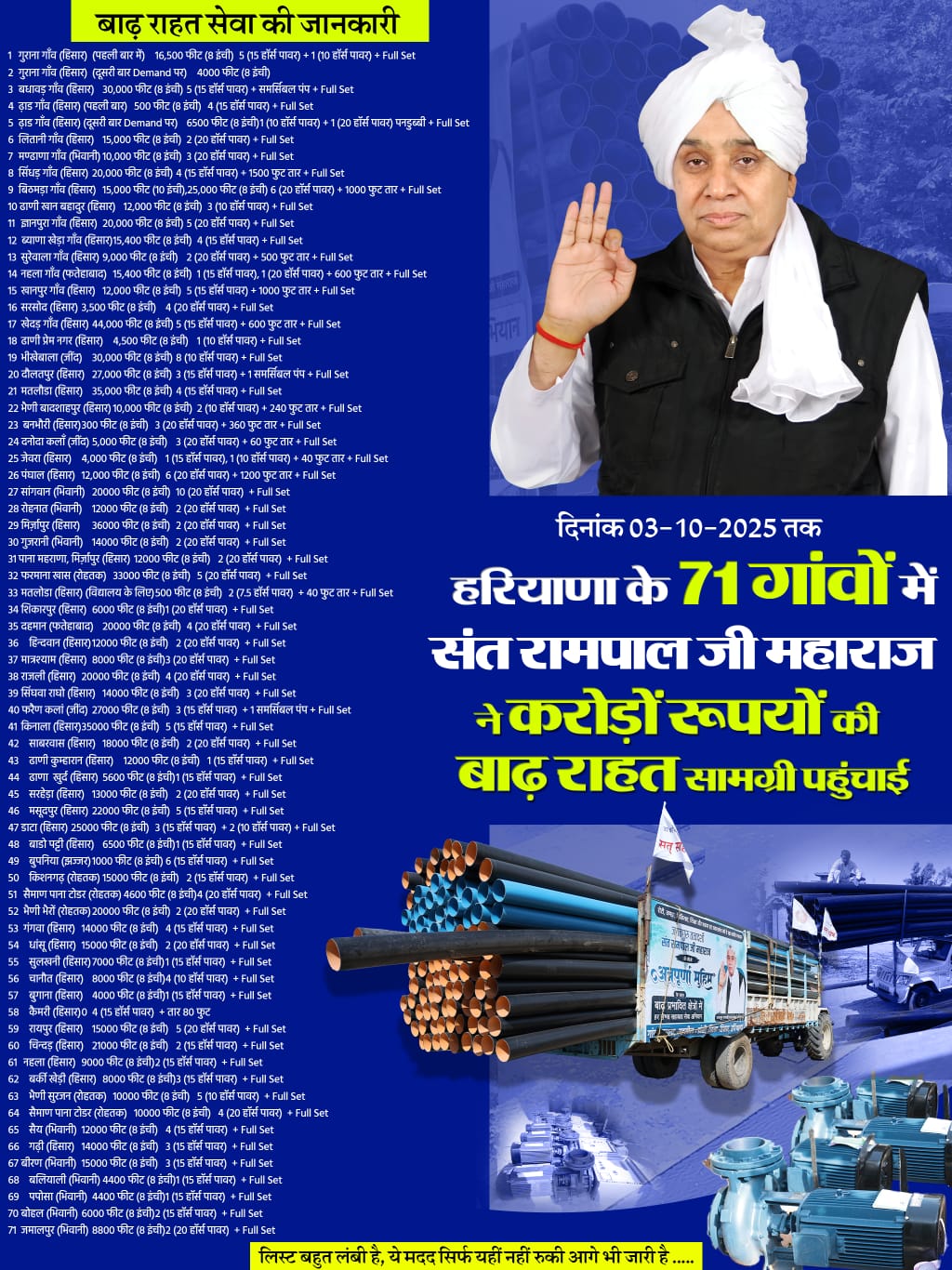 अन्नपूर्णा मुहिम के तहद संत रामपाल जी महाराज जी ने 71 बाढ़ पीड़ित ग्रामों की मदद की।