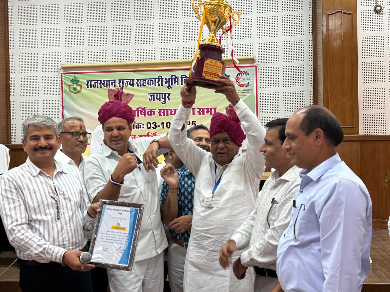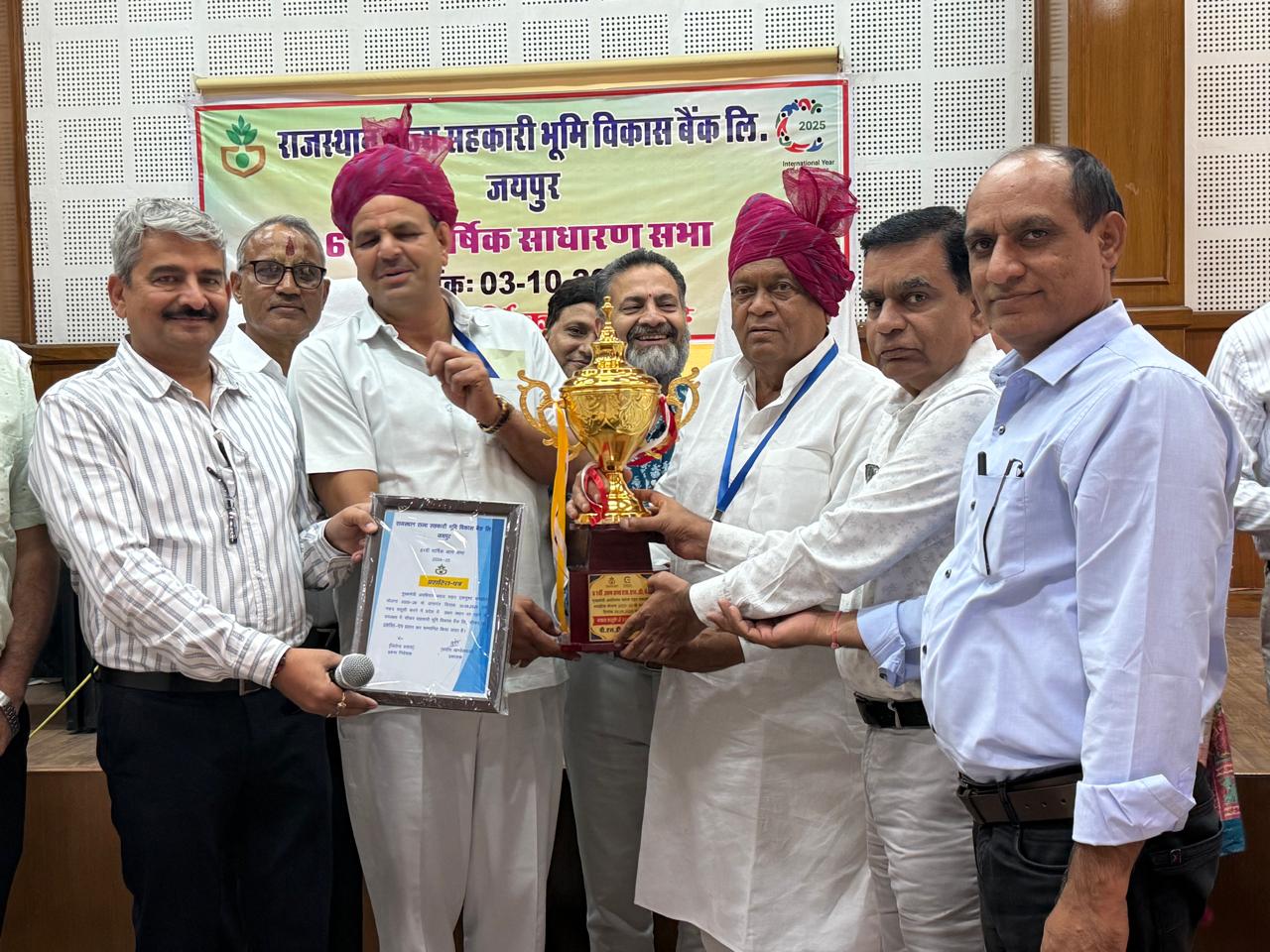 सीकर।राजस्थान राज्य सहकारी भूमि विकास बैंक लि०, जयपुर की 61वीं वार्षिक साधारण सभा अपेक्स बैंक के सभागार में आयोजित की गई बैंक प्रशासक एवं अतिरिक्त रजिस्ट्रार (द्वितीय) श्री सन्दीप खण्डेलवाल की अध्यक्षता तथा आर.एस.एल.डी.बी. प्रबन्ध निदेशक श्री जितेन्द्र प्रसाद शर्मा की उपस्थित में आयोजित हुई। इसमें मुख्यमंत्री भजन लाल शर्मा द्वारा बजट सत्र के दौरान की गई घोषणा की अनुपालना में लागू मुख्यमंत्री अवधिपार ब्याज राहत एकमुश्त समझौता योजना 2025-26 के लिये साधारण सभा में आभार व्यक्त करते हुये दीर्घकालीन साख सरंचना के लिये जीवनदायिनी बताया तथा इस अवसर पर मुख्यमंत्री अवधिपार ब्याज राहत एकमुश्त समझौता योजना में उत्कृष्ट प्रदर्शन करने वाले प्राथमिक सहकारी भूमि विकास बैंक को ट्रॉफी व प्रशस्ति पत्र प्रदान कर सम्मानित किया है। इसमें सीकर प्राथमिक सहकारी भूमि विकास बैंक लि०, को राज्य स्तर पर सर्वाधिक नकद वसूली 10.28 करोड़ कर राज्य में प्रथम स्थान प्राप्त करने (द्वितीय स्थान पर जालौर 8.37 करोड, तृतीय स्थान पर राजसमंद 7.20 करोड़, चतुर्थ स्थान पर चुरू 5.66 करोड़, पंचम स्थान पर जयपुर 5.57 करोड़) व सीकर जिले के कृषकों को 13.19 करोड़ की राहत प्रदान करने पर बैंक अध्यक्ष श्री कैलाश चन्द्र शर्मा, सचिव श्री विक्रम सिंह राठौड़ व लेखाकार श्री दिनेश कुमार मीणा को ट्रॉफी व प्रशस्ति पत्र प्रदान कर सम्मानित किया गया।