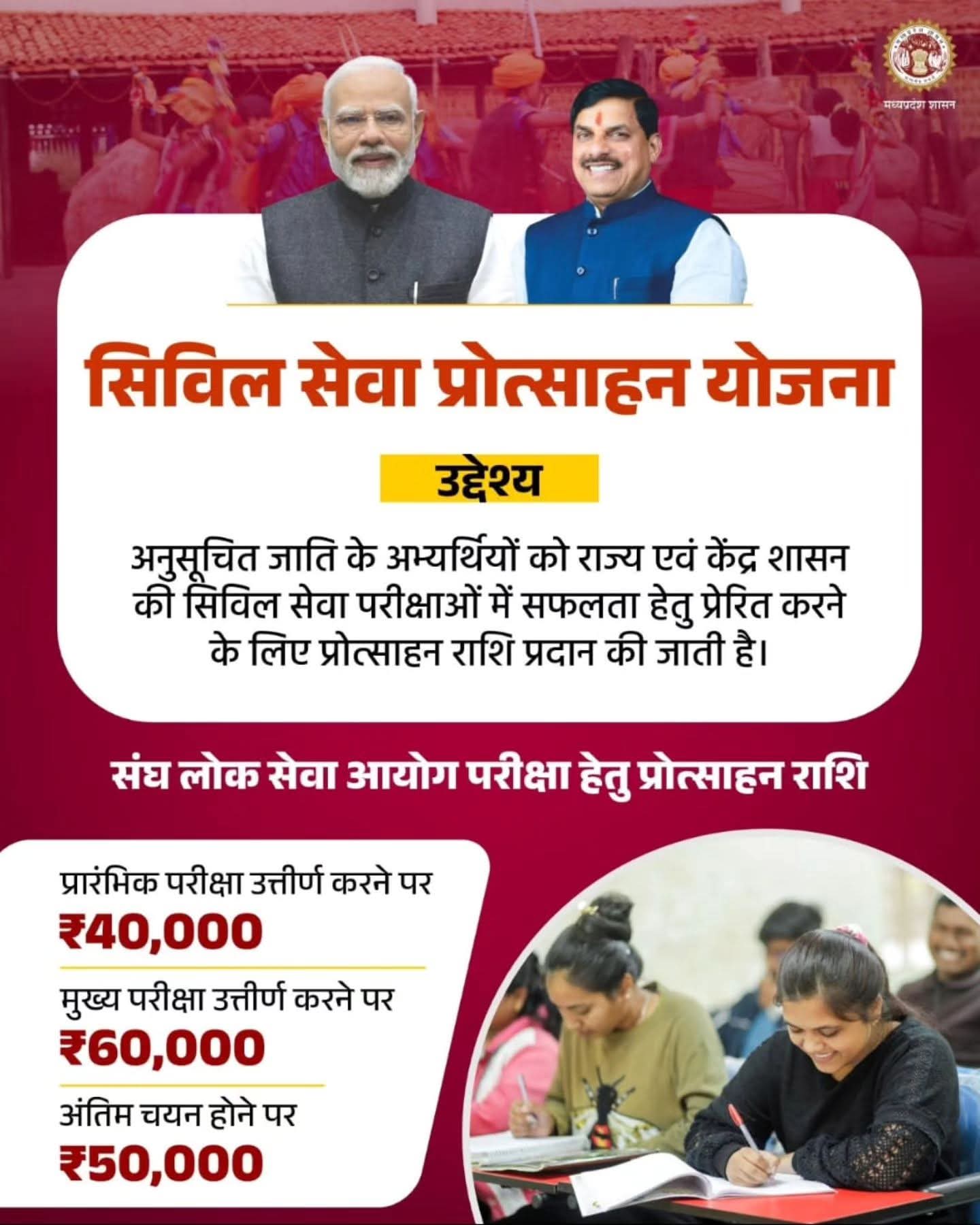 अनुसूचित जाति के अभ्यर्थियों को राज्य एवं केंद्र शासन की सिविल सेवा परीक्षाओं में सफलता हेतु प्रेरित करने के लिए प्रोत्साहन राशि प्रदान की जाती है।
