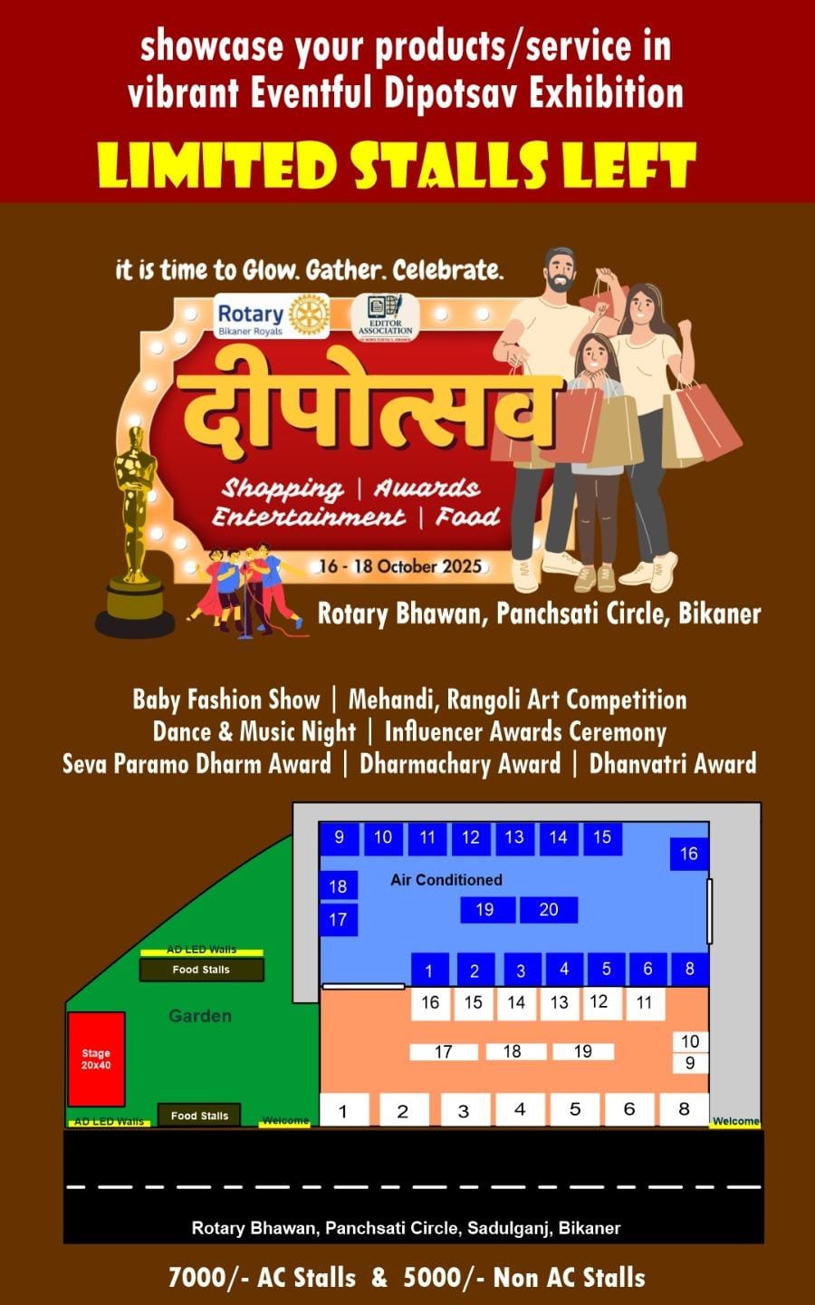 बीकानेर, 5 अक्टूबर । रोशनी और उमंग का पर्व दीपावली इस बार बीकानेर में एक नए रंग-रूप के साथ मनाया जाएगा। एडिटर एसोसिएशन ऑफ न्यूज पोर्टल्स बीकानेर और रोटरी क्लब बीकानेर रॉयल्स के संयुक्त तत्वावधान में 16 से 18 अक्टूबर तक रोटरी भवन, पंचशती सर्किल, सादुलगंज में तीन दिवसीय दीपोत्सव कार्यकर्म का आयोजन किया जा रहा है। दीपोत्सव के तहत खरीददारी, सम्मान समारोह, और मनोरंजन के कार्यक्रमों को त्रिवेणी के रूप मे आयोजित किया जा रहा जिससे हर वर्ग अपने अंदाज़ मे दीपोत्सव मना सके. यह आयोजन केवल खरीदारी और मनोरंजन का मेला नहीं होगा, बल्कि इसमें संस्कृति, साहित्य, सेवा और सम्मान की अनूठी छटा भी देखने को मिलेगी।