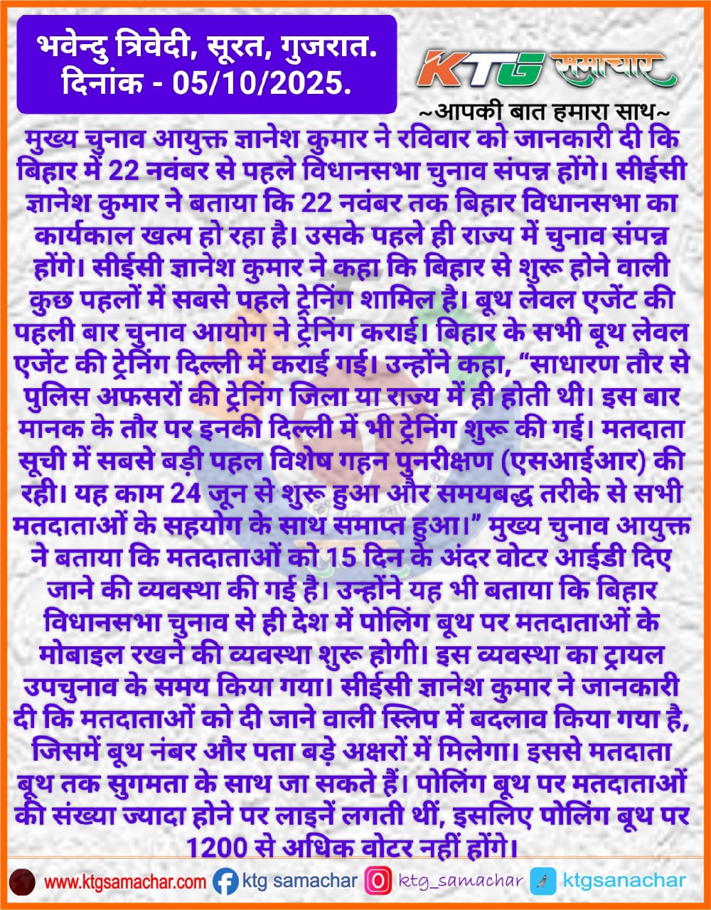 मुख्य चुनाव आयुक्त ज्ञानेश कुमार ने रविवार को जानकारी दी के बिहार में 22 नवंबर से पहले विधानसभा चुनाव संपन्न होंगे।