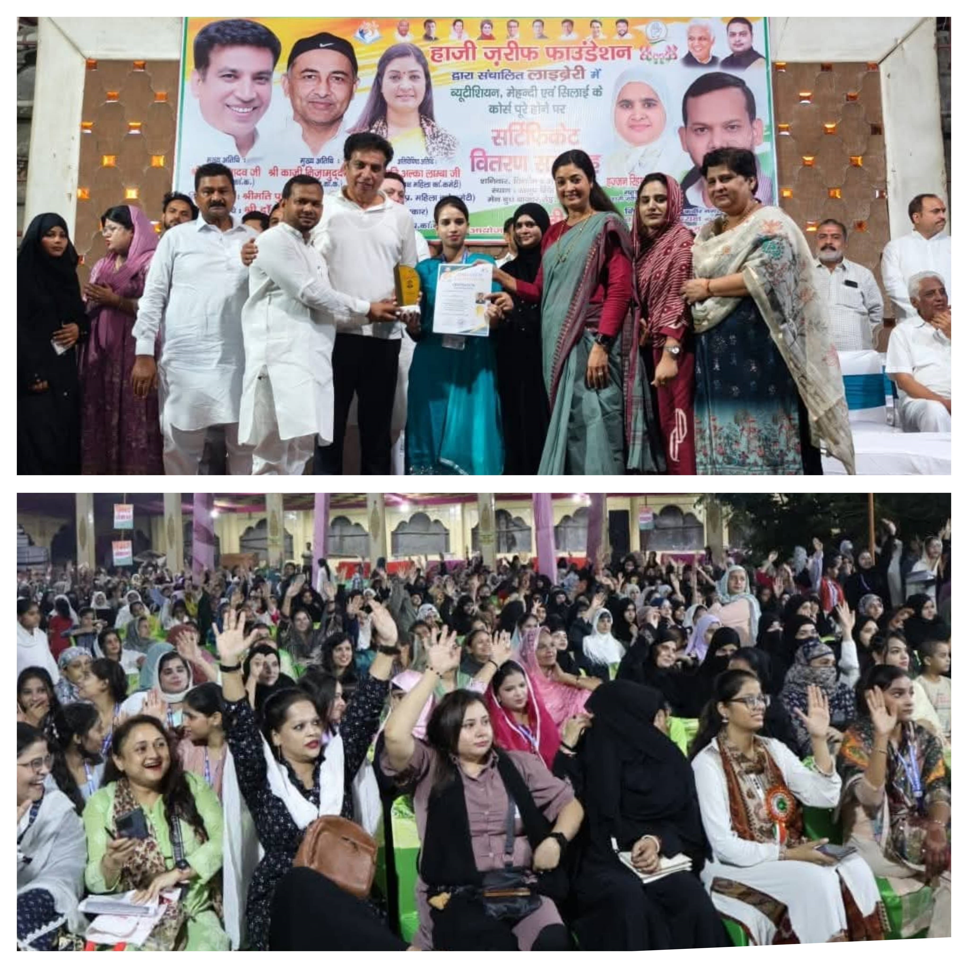 अगर महिलाएं मान ले आप सब ने जिस तरह से आज जो कुछ सिखा है वो आप के जीवन भर काम आएगा आप सभी छात्राओं एवं महिलाओं को बधाई और आप सभी बेटियों और महिलाओं ने आज अपने बीच वो भाई और बेटा राजनीति में चुना है जो सर्व धर्म सर्व समाज की सेवा में हाजी जरीफ युवा खड़ा है जो काम एवं कार्य सरकार नहीं कर सकती हैं वो काम हाजी जरीफ फाउंडेशन के माध्यम से बहन बेटियों के उनके हाथों को हुनर दे कर मजबूत कर रहे हैं ताकि जीवन में उनका साहस हिम्मत बना रहे और वो भविष्य में किसी इल्म की मौहताज न रहे और आगे दिल्ली प्रदेश कांग्रेस अध्यक्ष देवेंद्र यादव ने कहा कि आप सब आगे भी हाजी जरीफ के लिए साथ खड़े रहना ताकि आप की सेवा में हाजी जरीफ इसी तरह समर्पित रहे और निगम पार्षद हाजी जरीफ का हौसला आप की सेवा में लगा रहे आप सभी की कौशिश रंग लगाएगी फिर से जिस तरह से नि शुल्क सेवा कबीर नगर में आप को हाजी जरीफ फाउंडेशन से मिल रही हैं मध्य वर्ग की बेटियां और महिलाएं तालीम लाइब्रेरी से हासिल कर रही है हाजी जरीफ निगम पार्षद की जितनी प्रशंसा करें उतनी ही कम है जिसकी राज्य में सरकार न हो और देश में सरकार न हो वो चुनौतियों से लड़ कर समाज के लिए उनके अधिकार के लिए अपने निजी फंड से समाज एवं सर्व धर्म की सेवा कर रहे हैं ये कितनी साहस और हिम्मत की बात है उनकी दयालुता इंसानियत की प्रेरणा श्रोत मिशाल हैं आप ऐसे व्यक्ति की साहस हिम्मत को बरकरार रखे और उनकी हिम्मत को टूटने नहीं दे देवेंद्र यादव ने भारत सरकार के खिलाफ वोट चोर अभियान के तहत फॉर्म पर भी महिलाओं एवं कार्यक्रम में आए गण मान्य प्रदेश कांग्रेस कार्यकर्ताओं के हस्ताक्षर भी भरवाए ताकि भारत सरकार की वोट चोरी खिलाफ कमर तोड़ी जा सकें और राहुल गांधी कि आवाज मजबूत हो सकें। कार्यक्रम में जिले के कई विधान सभा के पूर्व विधायक उपस्थित रहे भीष्म शर्मा पूर्व विधायक और दिल्ली सरकार के पुर्व मंत्री हाजी जरीफ के राजनीति गुरु नरेंद्र नाथ सहित ईश्वर सिंह बागड़ी पुर्व भी शामिल हुए।