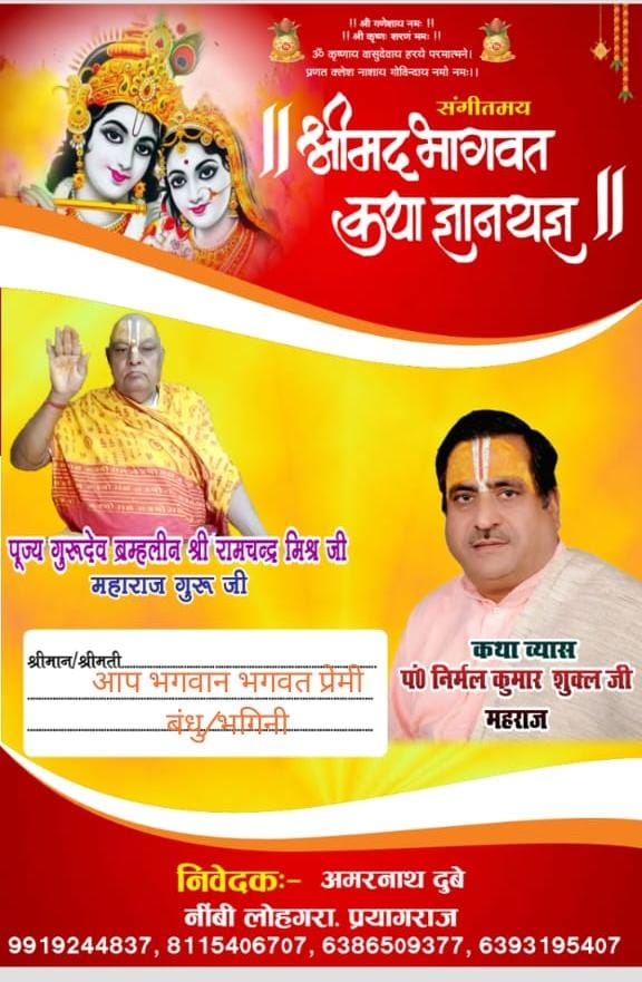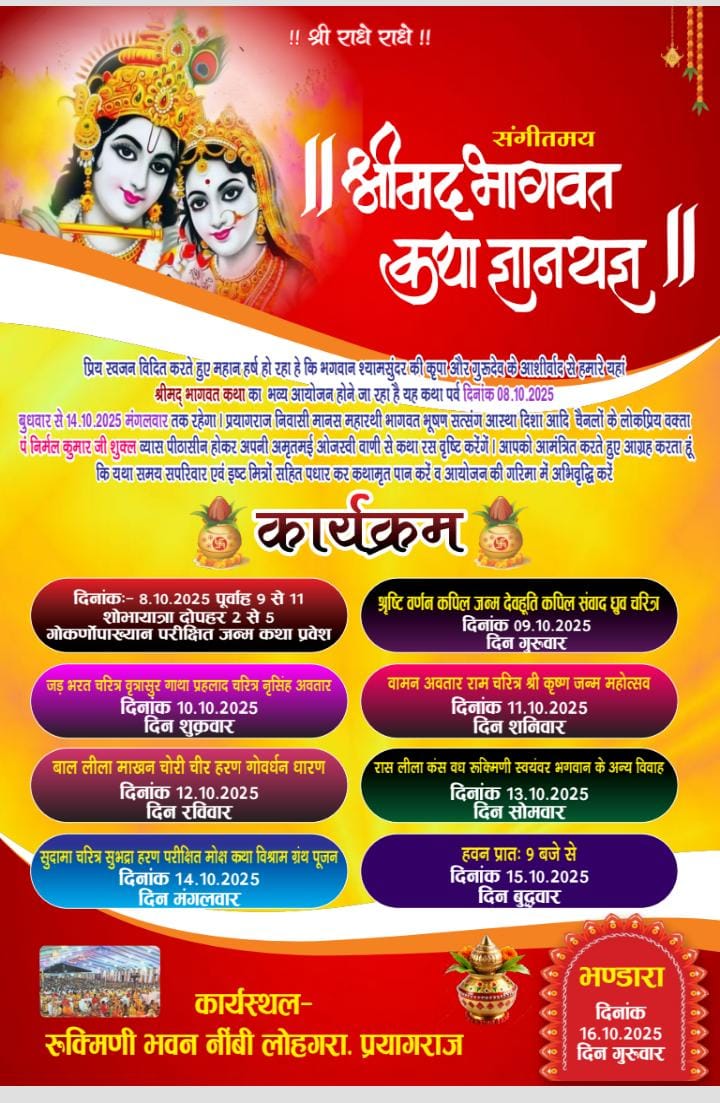 भारतीय किसान संघ के शंकरगढ़ ब्लॉक मंत्री अमिय शंकर दुबे के अनुसार नीबी लोहागरा बाजार में दिनांक 08-10-2025 से 16-10-2025 तक आयोजित हो रही भगवान भागवत की कथा जिसका कार्यक्रम क्रमशः 08अक्टूबर दिन बुधवार को सुबह 9 बजे से कलश यात्रा /शोभा यात्रा होगी तदोपरांत 08अक्टूबर से 14अक्टूबर तक प्रतिदिन समय 2बजे अपराह्न से सायं 5बजे तक भगवान भागवत की कथा की अमृत वर्षा होगी दिनांक 15 अक्टूबर को हवन कार्यक्रम होगा तथा दिनांक 16अक्टूबर को महाप्रसाद का आयोजन किया गया हैं जिसमें भगवान भागवत के हर चरणबद्ध कार्यक्रम में आमजनमानस से भारी संख्या पहुंचने का निवेदन किया गया हैं।