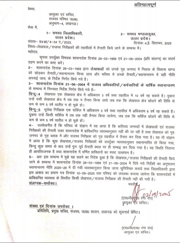 शासन से दिनांक 10/09/2025 तक लेखपालों का स्थानांतरण उनके गृह ब्लॉक से हटाकर अन्य क्षेत्र पर करना था परंतु शासनादेश की अवेहलना कर अपने चहतों की तैनाती उनके गृह ब्लॉक मे कर दी जिससे तहसील मे पक्षपात और भ्रष्टाचार को बढ़ावा मिल रहा इसका विरोध कई समाजसेवियों व वकीलो द्वारा किये जाने की बात सामने आयी है द्वारा ।