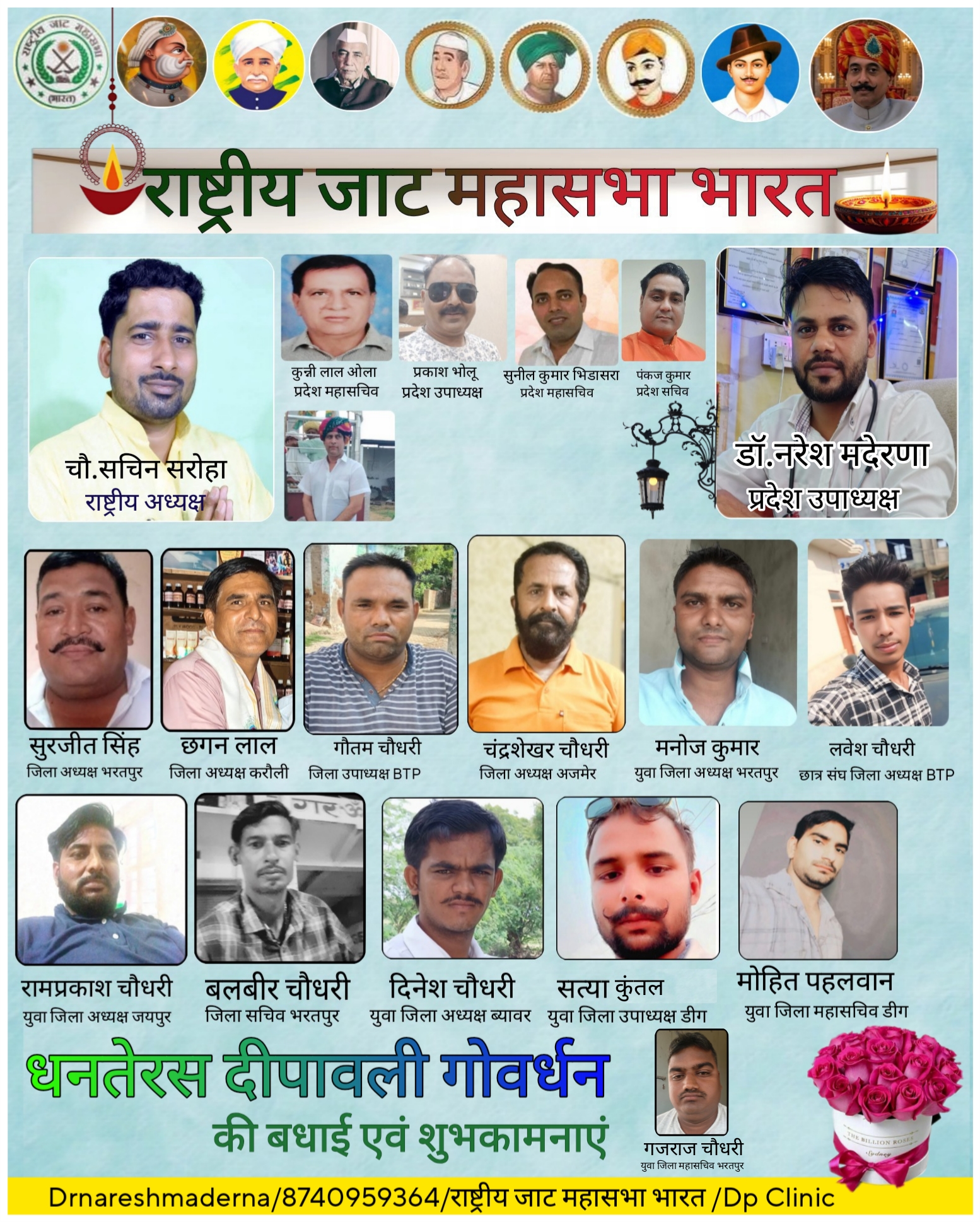 राष्ट्रीय जाट महासभा भारत के राष्ट्रीय अध्यक्ष सचिन सरोहा जी राजस्थान प्रदेश उपाध्यक्ष डॉ नरेश मदेरणा एवं राजस्थान की टीम भरतपुर जिला अध्यक्ष सुरजीत चौधरी करौली जिला अध्यक्ष छगन लाल जी अजमेर जिला अध्यक्ष चंद्रशेखर चौधरी जी प्रदेश महासचिव कुन्नी लाल चौधरी प्रदेश महासचिव सुशील कुमार भिड़ासरा प्रदेश सचिव पंकज कुमार ने देश प्रदेश को दीपाली की शुभकामनाएं प्रेषित की