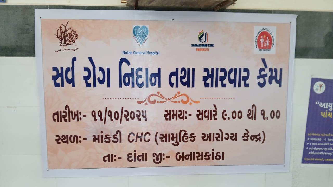 તા:11/10/2025 ના રોજ JANPATH TRUST તથા AID, આરોગ્ય & પરિવાર કલ્યાણ વિભાગ તથા સાંકળચંદ પટેલ યુનિવર્સિટી સંલગ્ન નૂતન મેડિકલ કોલેજ & રિસર્ચ સેન્ટર & નૂતન જનરલ હોસ્પિટલ, વિસનગર ના સહયોગથી બનાસકાંઠા જિલ્લાના, દાંતા તાલુકાના માંકડી CHC (સામૂહિક આરોગ્ય કેન્દ્ર) પર નિઃશુલ્ક સર્વરોગ નિદાન તથા સારવાર કેમ્પ રાખવામાં આવ્યો ,જેમા અતિથિ મહેમાન તરીકે મગવાસ PHC ડૉ.જીગરભાઈ (MO), તથા જનપથ સંસ્થાના મુખ્ય શ્રી હરિનેશભાઈ પંડ્યા,તેમજ સાધનાબેન પંડ્યા , નૂતન જનરલ હોસ્પિટલ ટીમ , જિલ્લામાંથી AIDS Control Society માંથી વસંતભાઈ અને તેમની ટીમ, ગોરાડ આંગણવાડી સુપરવાઈઝર વિમળાબેન હાજર રહ્યા હતા. તે સિવાય સામાજિક કાર્યકર મણીલાલ,બાબુભાઈ, બકાભાઇ, અન્નપૂર્ણાબેન તેમજ માંકડી સરપંચ ભોજાભાઈ હાજર હતા.તે સિવાય માંકડી CHC MO(ડૉ.મોહિત પટેલ તથા ડૉ.વંદના પ્રજાપતિ) અને તેમના પૂરા સ્ટાફ નો પણ ખૂબ સારો સહકાર મળ્યો.આ નિઃશુલ્ક સર્વરોગ નિદાન તથા સારવાર કેમ્પમાં દાંતા તાલુકાના 93 ગામોના 631 દર્દીઓએ સારવાર લીધી હતી. તથા આરોગ્ય કેમ્પ નો લાભ લેનાર તમામ દર્દીઓને 1 માસની દવા સાથે 6 કેળા આપવામાં આવ્યા, આ સિવાય જે વ્યક્તિને આગળ વધુ સારવારની જરૂર જણાઈ તેવા કુલ 127 દર્દીઓને આગામી સારવાર માટે આગામી દિવસોમાં તેઓને નૂતન જનરલ હોસ્પિટલ , વિસનગર માં વિના મુલ્યે સારવાર માટે લઇ જવાશે. આજે આરોગ્ય કેમ્પમાં કુલ 28 વ્યક્તિના આયુષ્માનકાર્ડ કાઢી આપવામાં આવ્યા.આજના આરોગ્ય કેમ્પની ખુબજ સારી સફળતા મળી.