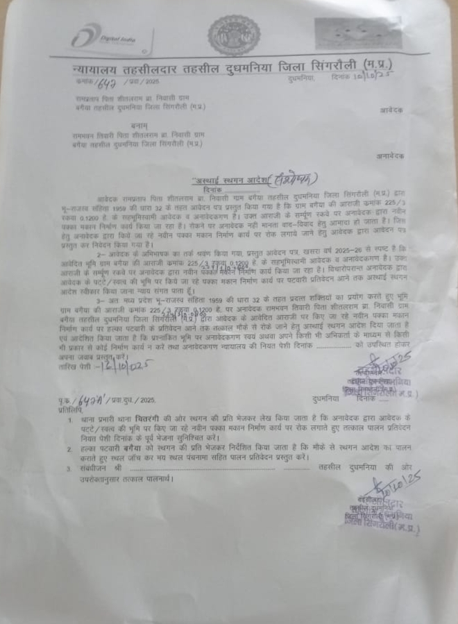 तहसील दुधमनिया थाना चितरंगी के अंतर्गत ग्राम बगैया के निवासी रामप्रताप पिता शितालराम ग्राम बगैया में भू-राजस्व संहिता 1959 की धारा 32 के तहत प्रदत्त शक्तियों का प्रयोग करते हुए भूमि बगैया की अराजी क्रमांक 225/3 रकवा 0.1200हे० व 224/1 रकवा 0.800 हे० पर अनावेदक रामभवन तिवारी पिता शीतलराम निवासी ग्राम बगैया तहसील दुधमनिया जिला सिंगरौली (म०प्र०) द्वारा आवेदक के आवेदित अराजी पर किए जा रहे नविन पक्का मकान निर्माण कार्य पर हल्का पटवारी के प्रतिवेदन आने तक तत्काल मौके से रोके जाने हेतु स्थगन आदेश दिया जाता है एवं आदेशित किया जाता है प्रश्नाकित भूमि पर अनावेदकगण स्वयं अथवा किसी भी अभिकर्ता के माध्यम से किसी भी प्रकार से कोई निर्माण कार्य न करें तथा अनावेदकगण न्यायलय की नियत पेशी दिनांक 16.10.2025 अपना जवाब प्रस्तुत करें| आदेश होने के बाद पटवारी द्वारा माना करने के बावजूद मनमानी तरीके से जमीं को लुटने के मकसद से निर्माण कार्य किया जा रहा है, तहसीलदार महोदय से व थाना प्रभारी से अनुरोध है तत्काल जाँच कराकर उचित कार्यवाही किया जाना चाहिए| माया तिवारी के पति रामप्रताप एवं उनके लड़के का मानसिक स्थिति खराब होने से उनके दामाद परवेन्दर तिवारी द्वारा कानूनी प्रक्रिया में सहयोग किया जा रहा है तो विपक्षी के द्वारा कई लोगों से जान मारने कि धमकी दी गई है अनावेदकगण द्वारा धमकी दी हम हमारा कुछ नहीं होगा मौके से निर्माण कार्य रोकने गए प्रार्थी तो मारपीट करने लगे और गाली गलौज करने लगे जान से मारने की धमकी देने लगे जिससे प्रार्थी काफी भयभीत है तथा स्थगन आदेश का पालन न होने से स्वामित्व की भूमि से बेदखल हो जाएगा जिसे उक्त घटना की जांच कराई जाकर तत्काल निर्माण कार्य बंद कराया जाए एवं कार्यवाही किया जाना आवश्यक है एवं न्यायोलित है।