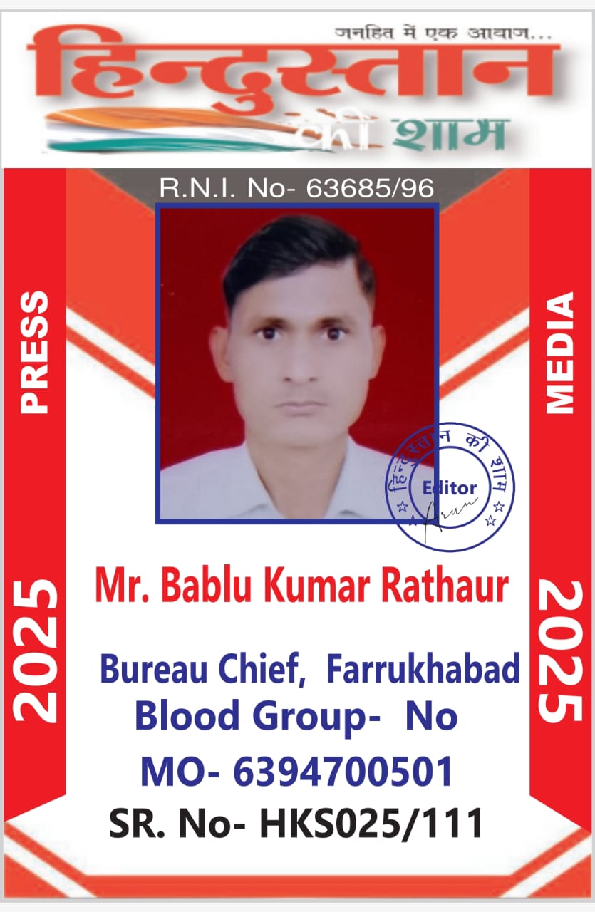 हिंदुस्तान की शाम न्यूज़ पेपर में बबलू कुमार राठौर को जिला फर्रुखाबाद से ब्यूरो चीफ बनाया गया है