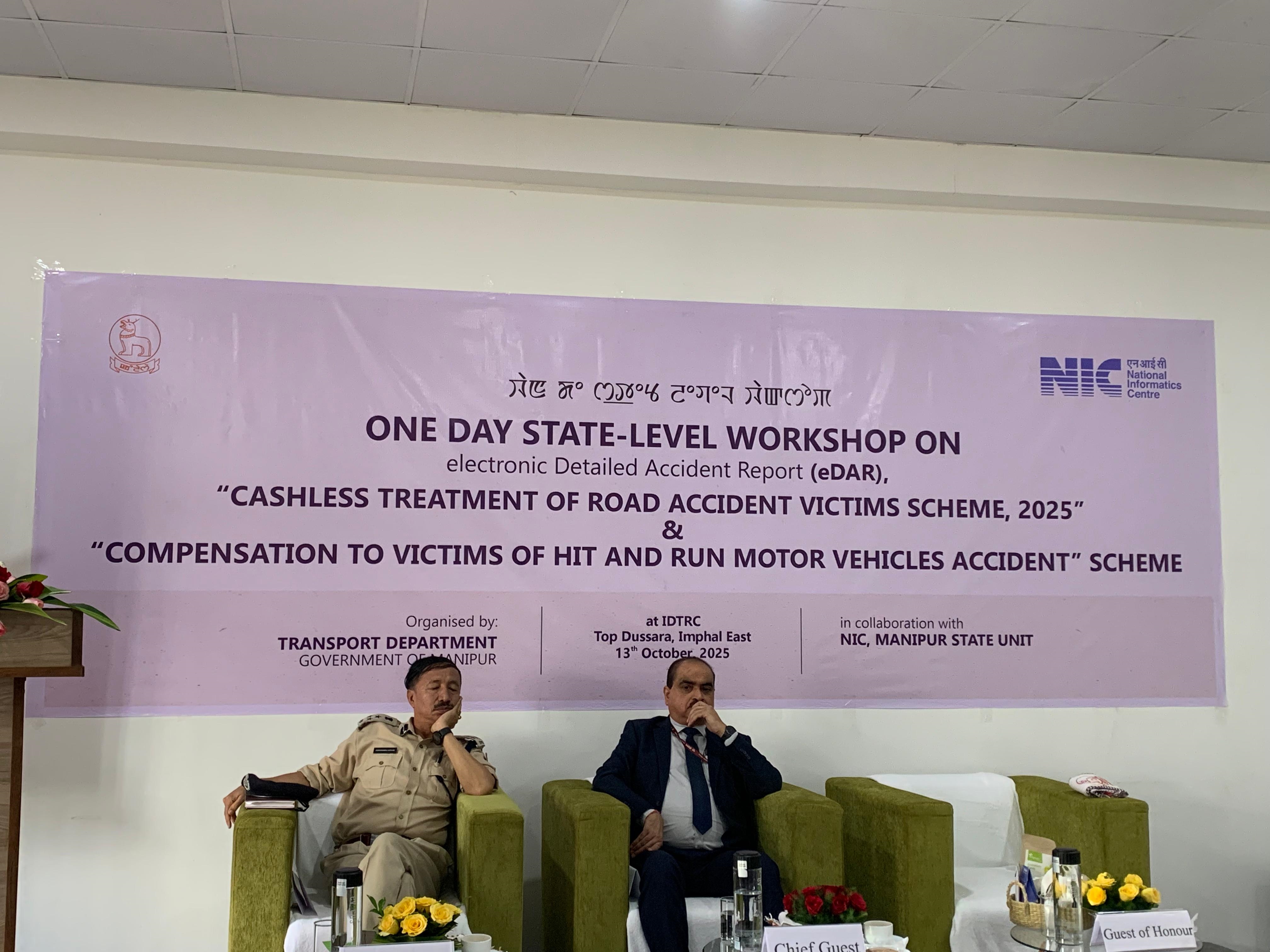 IMPHAL, India — October 13: The Transport Department of Manipur, in collaboration with the National Informatics Centre (NIC), Manipur State Unit, on Monday organised a one-day State-Level Workshop focused on the Electronic Detailed Accident Report (eDAR) system, the Cashless Treatment of Road Accident Victims Scheme 2025, and the Compensation to Victims of Hit-and-Run Motor Vehicle Accidents Scheme. The event took place at the Institute of Driving Training and Research Centre (IDTRC) in Top Dhrussa, Imphal East.