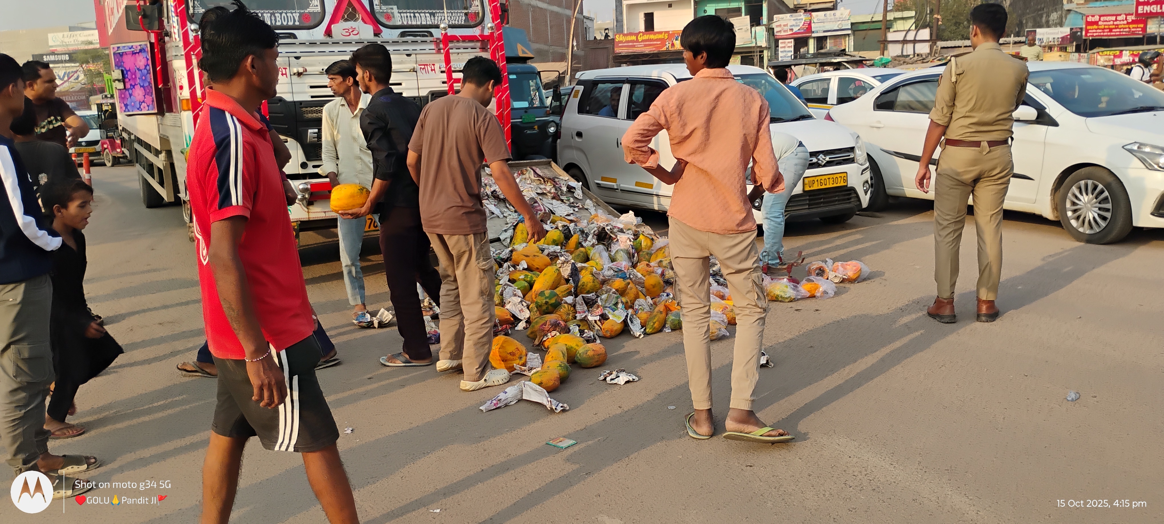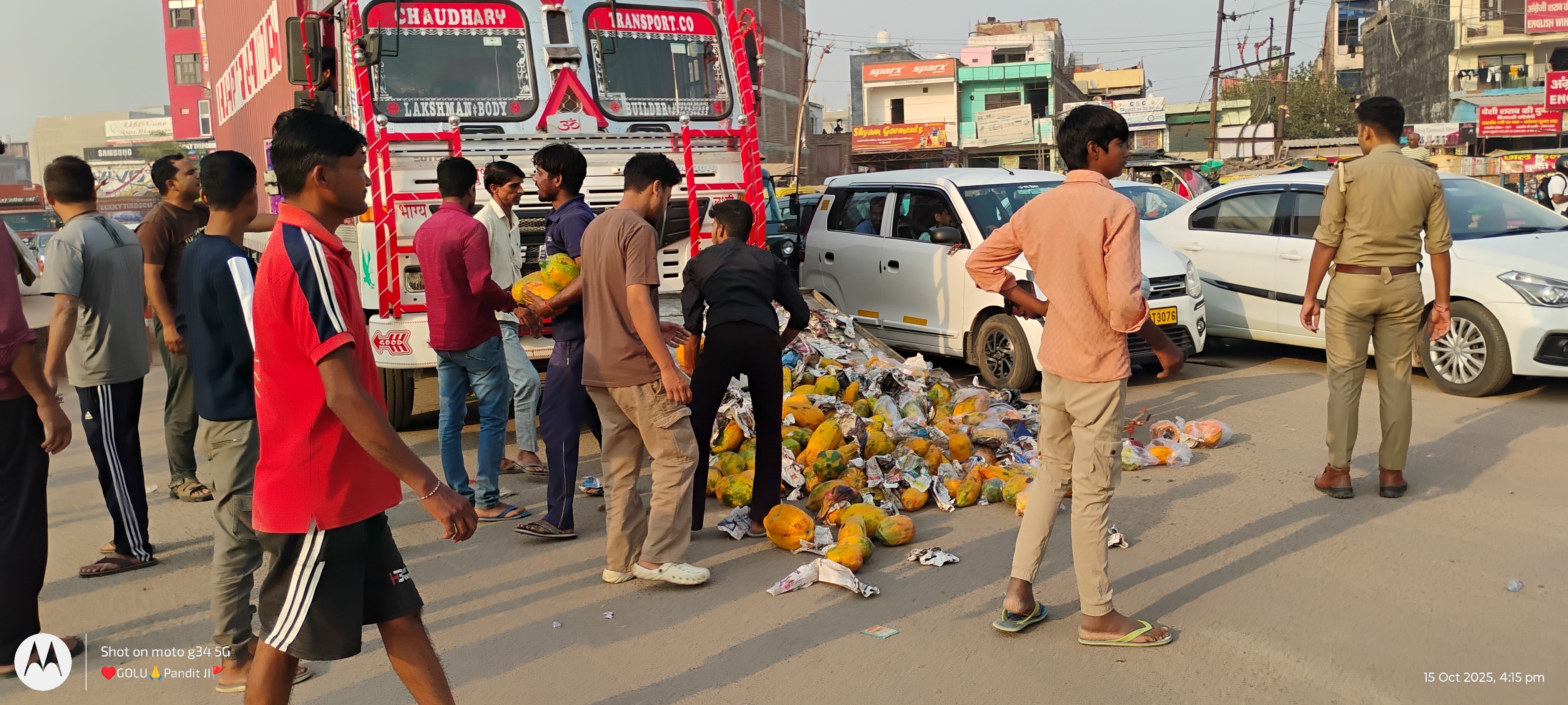 आज नोएडा सेक्टर 63 पुलिस चौकी वह थाने के सामने एक ट्रक ने ठेले वाले को मारा टक्कर जिसकी वजह से ठेला क्षतिग्रस्त हो गया ठेले पर रखे पपीते का फल रोड पर बिखर गया किसी का जान माल का कोई नुकसान नहीं है मौके पर पहुंची पुलिसकर्मी ने मामला को संभाला