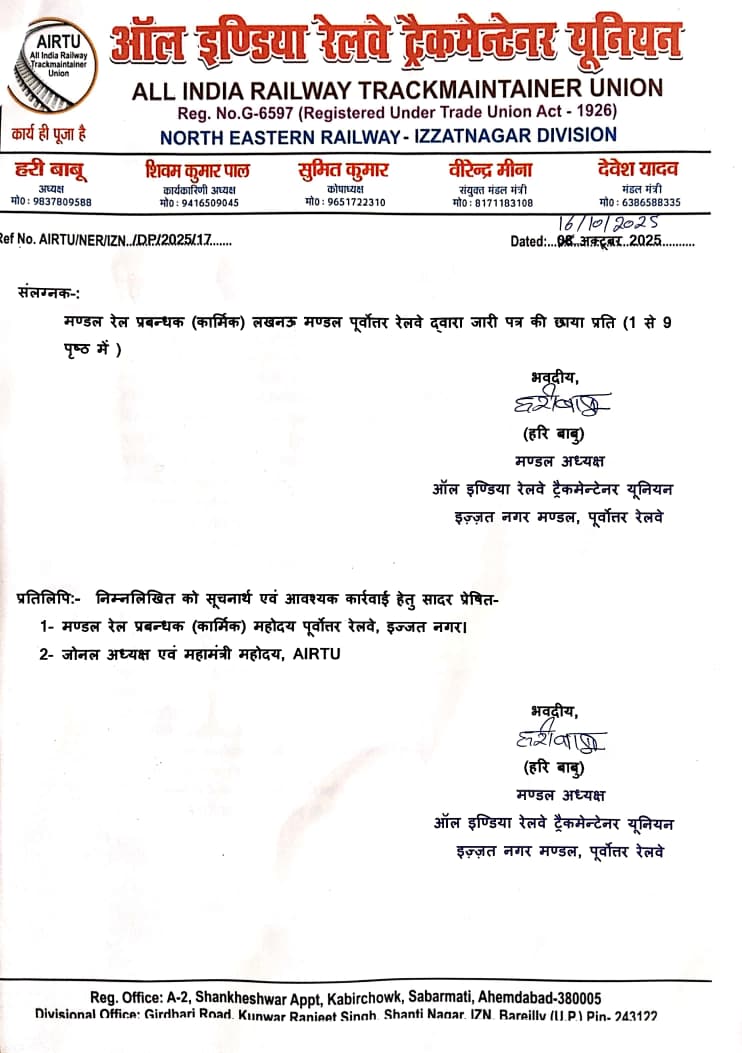AIRTU ने ट्रैकमैनों के हित में उठाई बड़ी पहल — इज़्ज़तनगर मंडल में LDCE वैकेंसी में शामिल करने हेतु सौंपा गया ज्ञापन