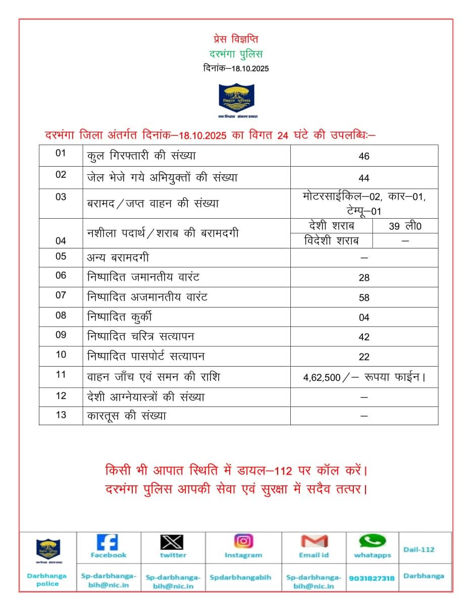दरभंगा जिला अंतर्गत दिनांक-18.10.2025 का विगत 24 घंटे की उपलब्धि .... . .