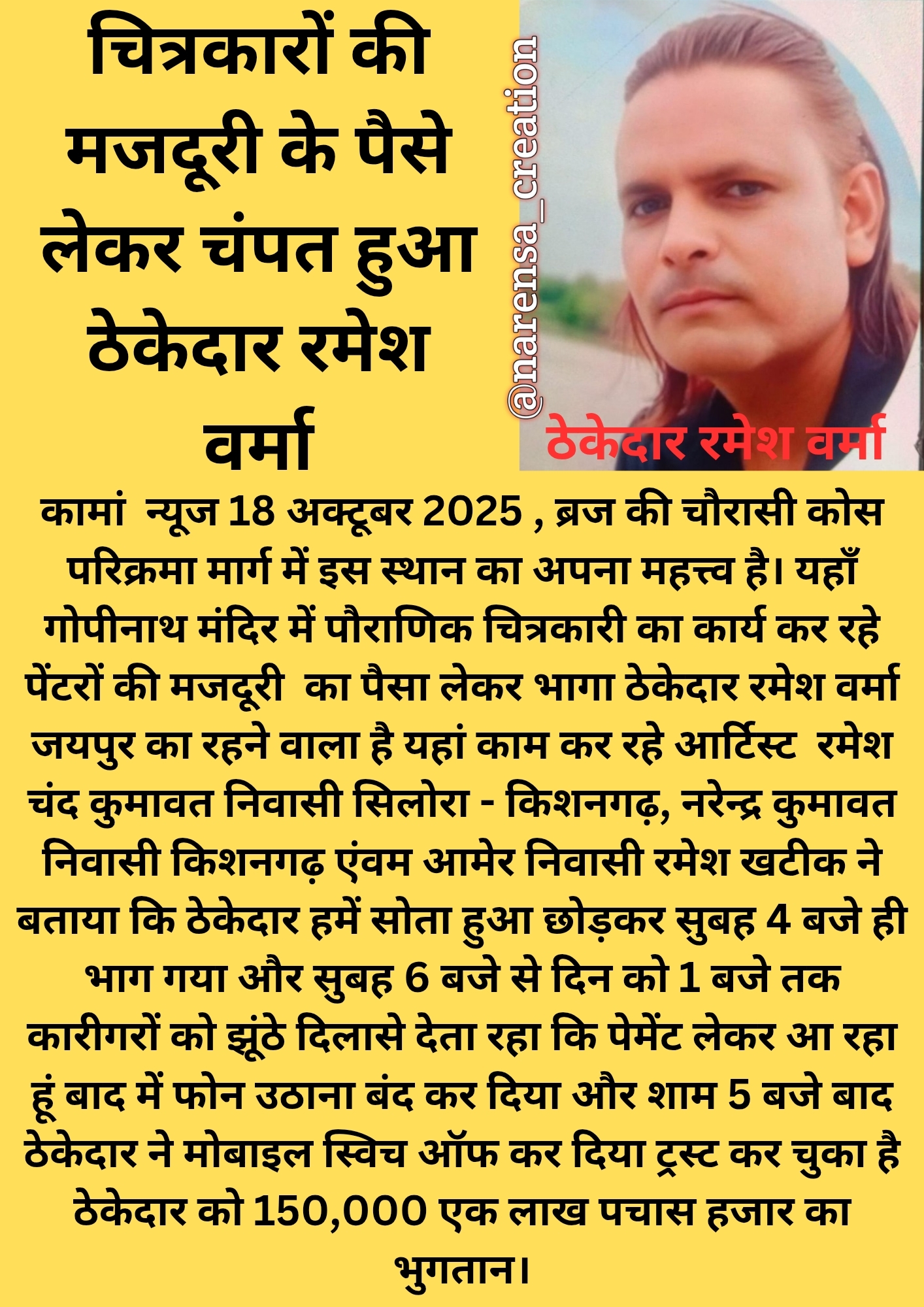 कामां 18 अक्टूबर 2025 , ब्रज की चौरासी कोस परिक्रमा मार्ग में इस स्थान का अपना महत्त्व है। यहाँ गोपीनाथ मंदिर में पौराणिक चित्रकारी का कार्य कर रहे पेंटरों की मजदूरी का पैसा लेकर भागा ठेकेदार रमेश वर्मा जयपुर का रहने वाला है यहां काम कर रहे आर्टिस्ट रमेश चंद कुमावत निवासी सिलोरा - किशनगढ़, नरेन्द्र कुमावत निवासी किशनगढ़ एंवम आमेर निवासी रमेश खटीक ने बताया कि ठेकेदार हमें सोता हुआ छोड़कर सुबह 4 बजे ही भाग गया और सुबह 6 बजे से दिन को 1 बजे तक कारीगरों को झूंठे दिलासे देता रहा कि पेमेंट लेकर आ रहा हूं बाद में फोन उठाना बंद कर दिया और शाम 5 बजे बाद ठेकेदार ने मोबाइल स्विच ऑफ कर दिया ट्रस्ट कर चुका है ठेकेदार को 150,000 एक लाख पचास हजार का भुगतान।