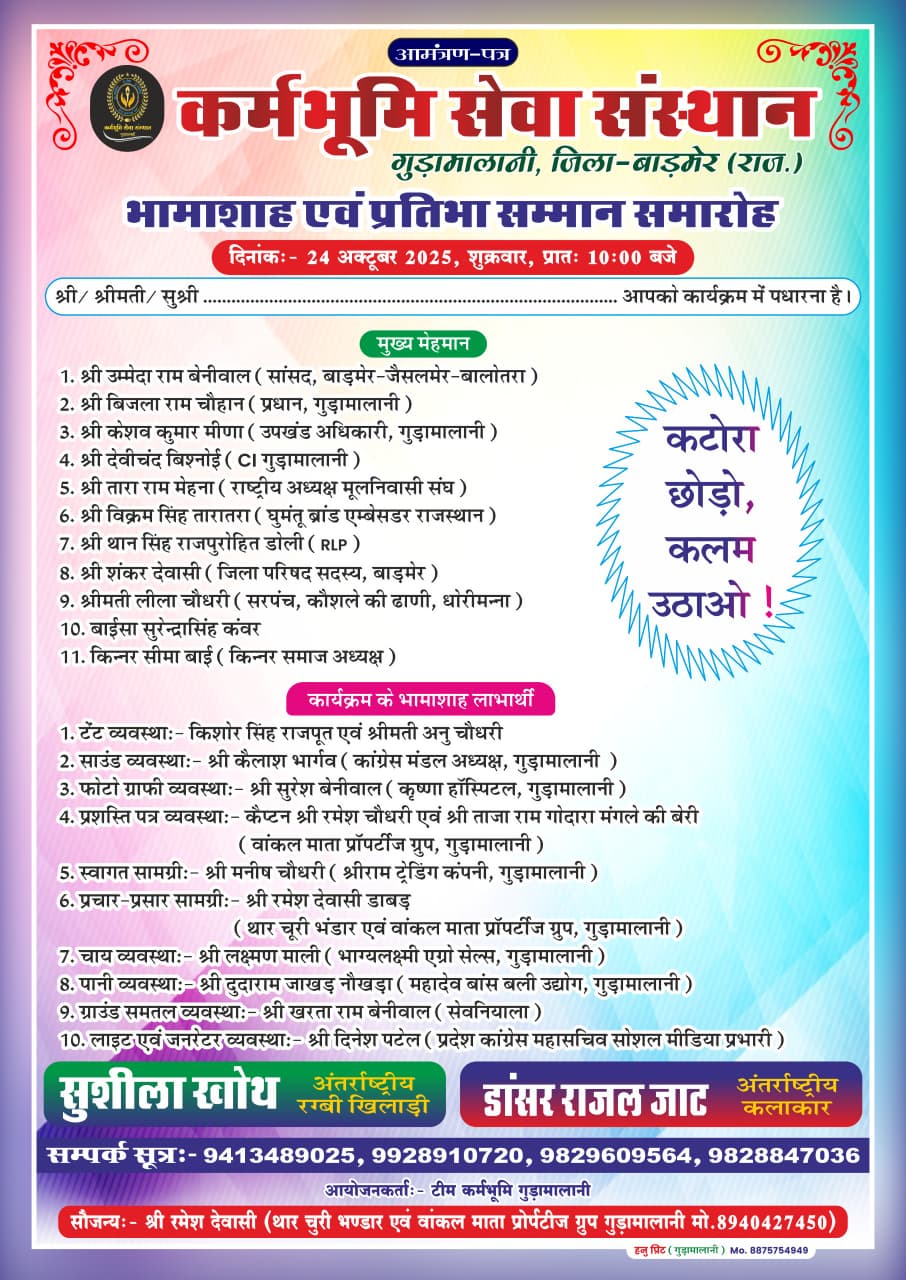 गुड़ामालानी 24 अक्टूबर 2025 को भामाशाह एवं प्रतिभा सम्मान समारोह कर्मभूमि सेवा संस्थान में आयोजित किया जाएगा। इस समारोह में मुख्य अतिथि के रूप में मुख्य अतिथि श्री उम्मेदा राम बेनीवाल (सांसद, बाड़मेर-जैसलमेर-बालोतरा) श्री हेमाराम चौधरी (पूर्व केबिनेट मंत्री) श्री बिजला राम चौहान (प्रधान, गुड़ामालानी) श्री केशव कुमार मीणा (उपखण्ड अधिकारी, गुड़ामालानी) श्री रूपसिंह जाखड़ (अतिरिक्त मुख्य ब्लॉक शिक्षा अधिकारी धोरीमन्ना) श्री देवीचन्द बिश्नोई (CI गुड़ामालानी) श्री तारा राम मेहना (राष्ट्रीय अध्यक्ष मूलनिवासी संघ) श्री विक्रम सिंह तारातरा (घुमंतू ब्रांड एम्बेसडर राजस्थान ) श्री थान सिंह राजपुरोहिज डोली (RLP) श्री शंकर देवासी (जिला परिषद सदस्य, बाड़मेर) श्रीमती लीला चौधरी (सरपंच, कौशले की ढाणी, धोरीमन्ना) बाईसा सुरेन्द्रासिंह कंवर (गुड़ामालानी) किन्नर सीमा बाई (किन्नर समाज अध्यक्ष) उपस्थित होंगे।
