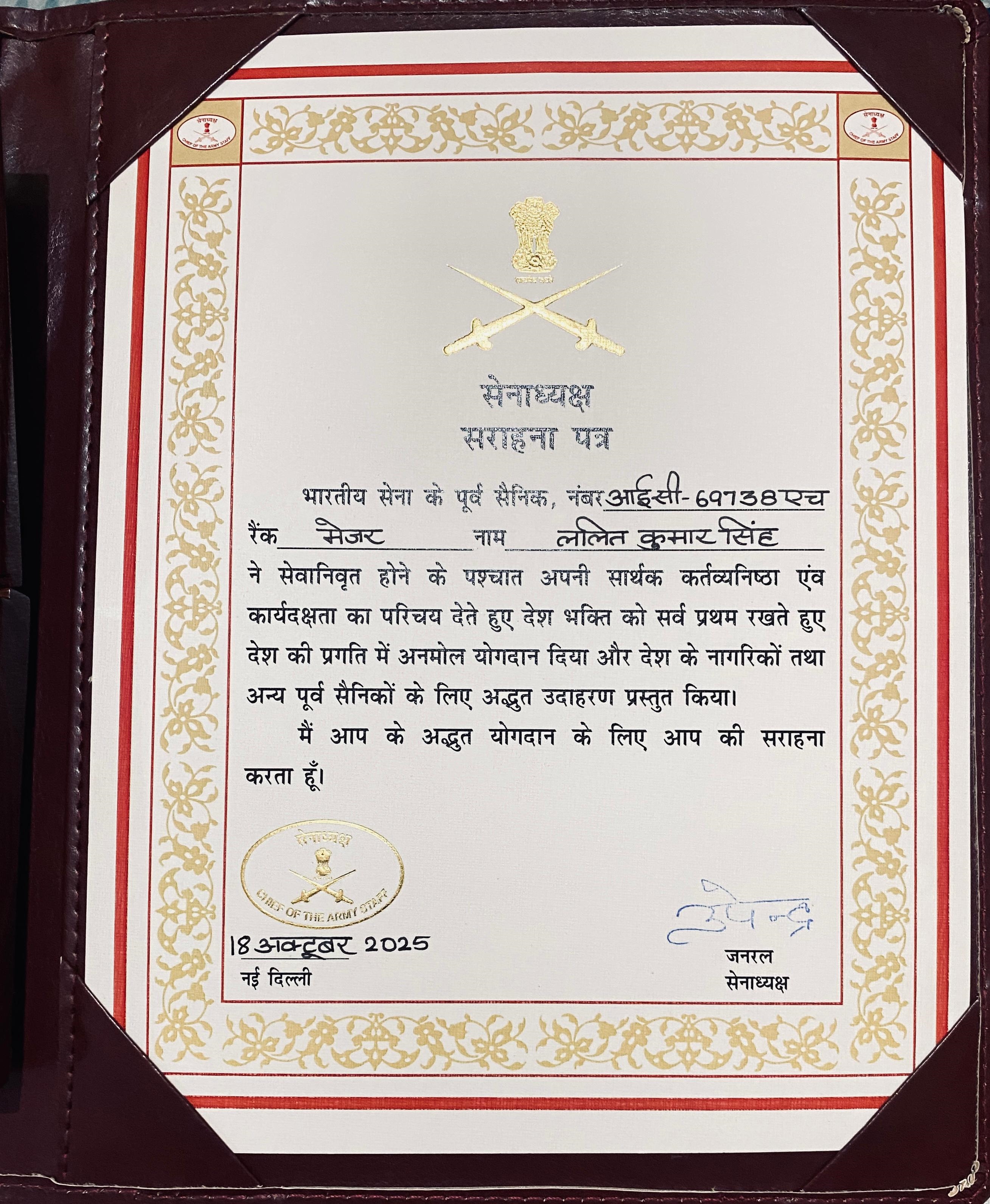 भारतीय सेवा के पूर्व सैनिक मेजर ललित कुमार सिंह ने सेवानिवृत होने के पक्ष अपनी सार्थक कर्तव्य निष्ठा एवं कार्य दक्षता का परिचय देते हुए देशभक्ति को सर्वप्रथम रखते हुए देश की प्रगति में अनमोल योगदान दिया और देश के नागरिकों तथा अन्य पूर्व सैनिकों के लिए अद्भुत उदाहरण प्रस्तुत किया इस हेतु के ऑफ आर्मी स्टाफ जनरल उपेंद्र द्विवेदी द्वारा बच्चों एवं वीर नारियों के लिए मेजर ललित सिंह द्वारा किए जा रहे हैं कार्यों के लिए प्रशंसा पत्र दिया