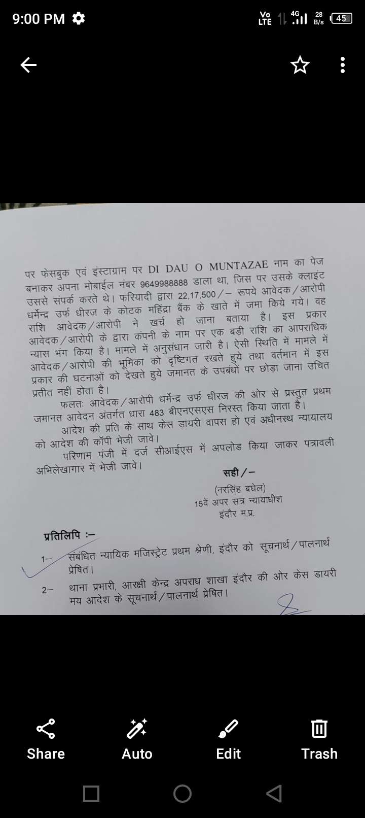 BA/4065/2025 बेल मामले में 16/10/2025 को इन्दौर जिला न्यायालय मध्यप्रदेश से जमानत पर रिहा करने से इन्कार करने पर कारण पूछा गया कि क्यों नहीं मिली बेल। कहां गया सेशन कोर्ट के जज अपनी पावर का इस्तेमाल करते ही नहीं है वो मामले को हाईकोर्ट भेज देते हैं। हाईकोर्ट में बेल एप्लीकेशन लगाने की फीस 1,00,000/- बतायी गयी है परिवार को।