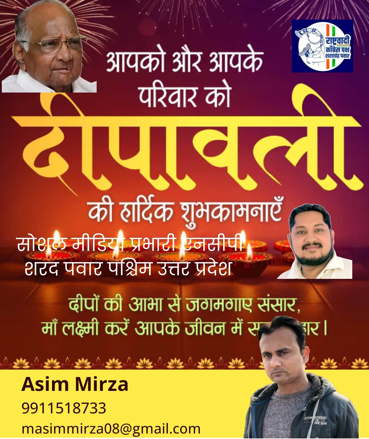 सभी देश वासियों को डॉ रियाज सैफी एनसीपी शरद पवार पश्चिम उत्तर प्रदेश अध्यक्ष और सोशल मीडिया प्रभारी एनसीपी शरद पवार पश्चिम उत्तर प्रदेश आसिम मिर्ज़ा और पूरी टीम की तरफ से दीपावली की बहुत बहुत मुबारकबाद