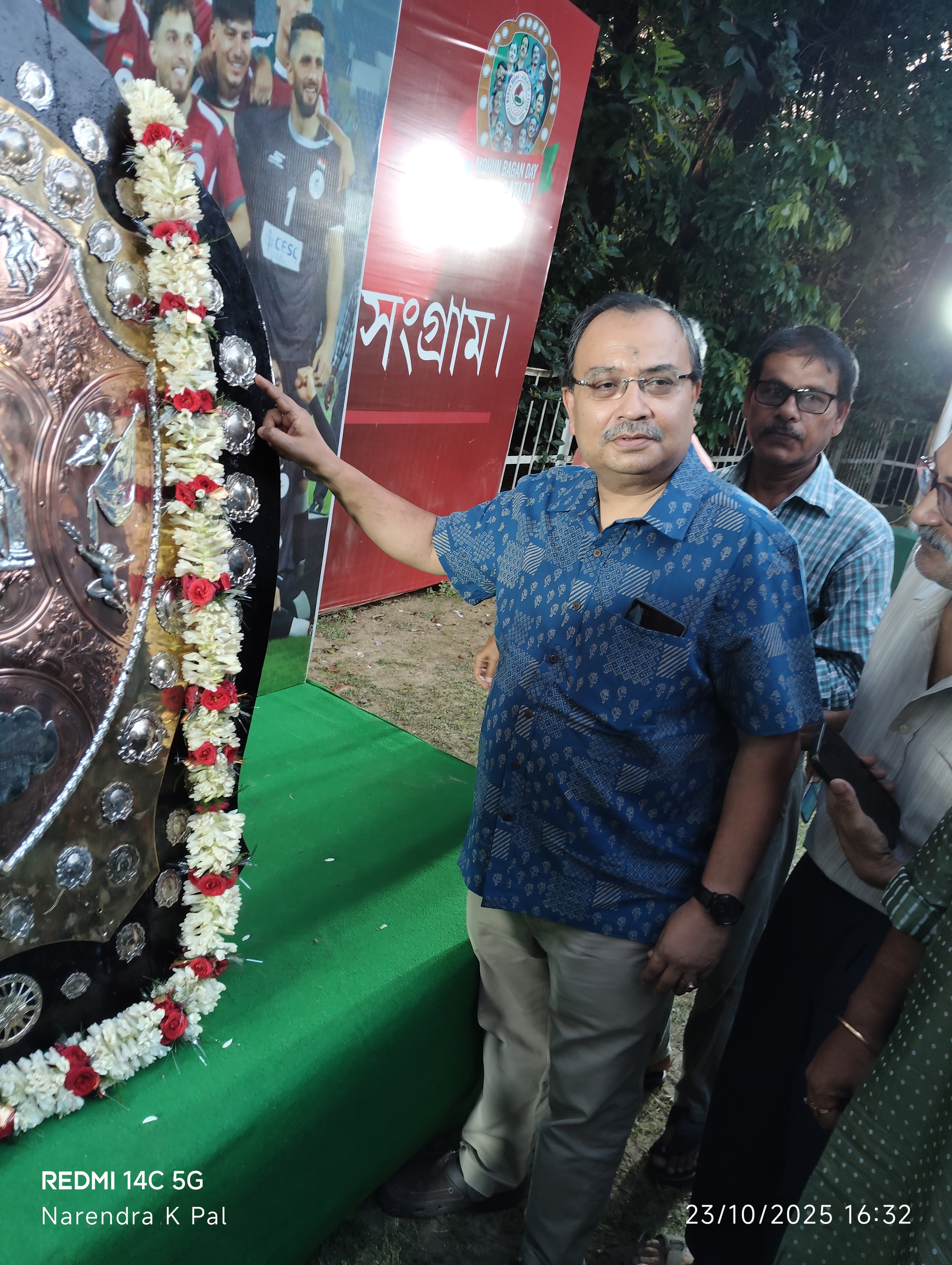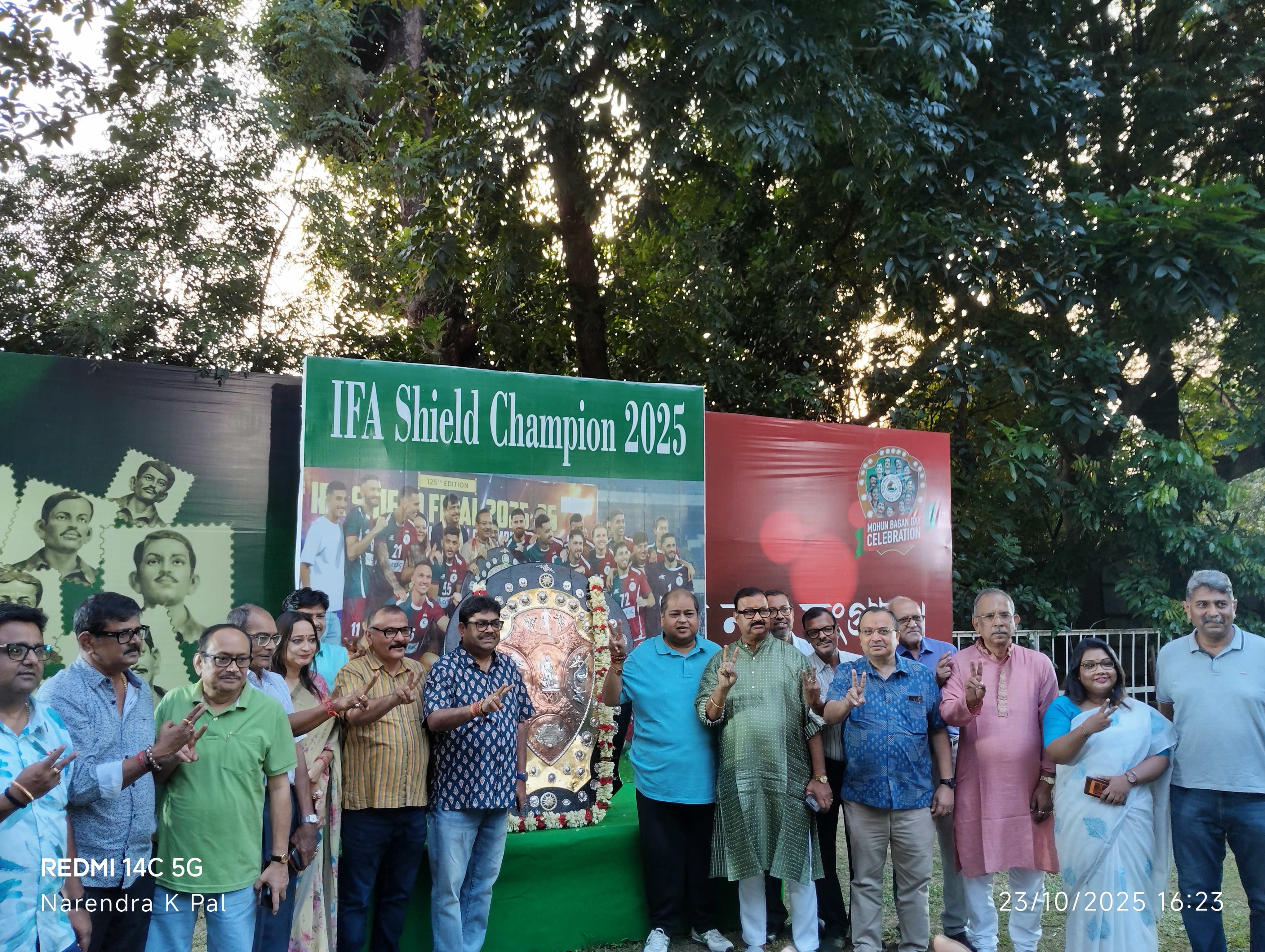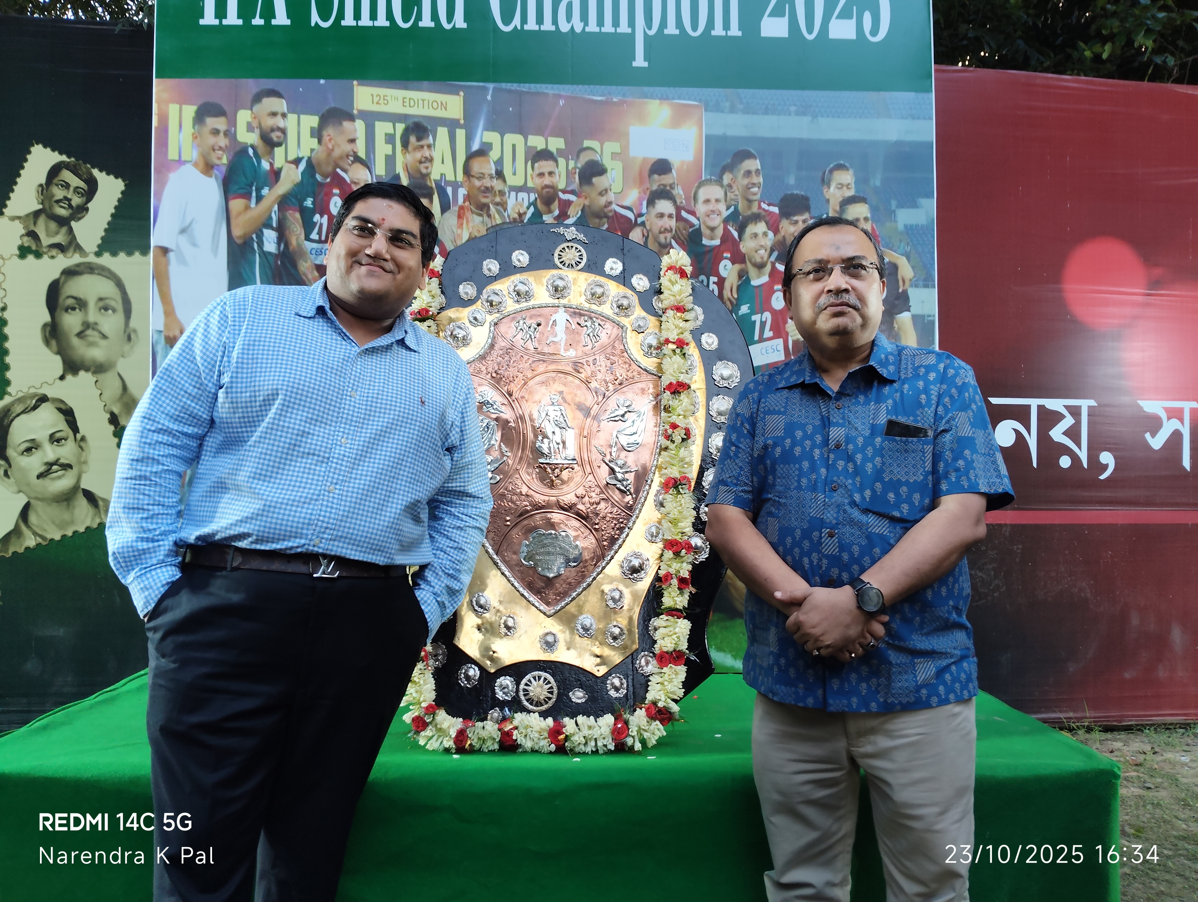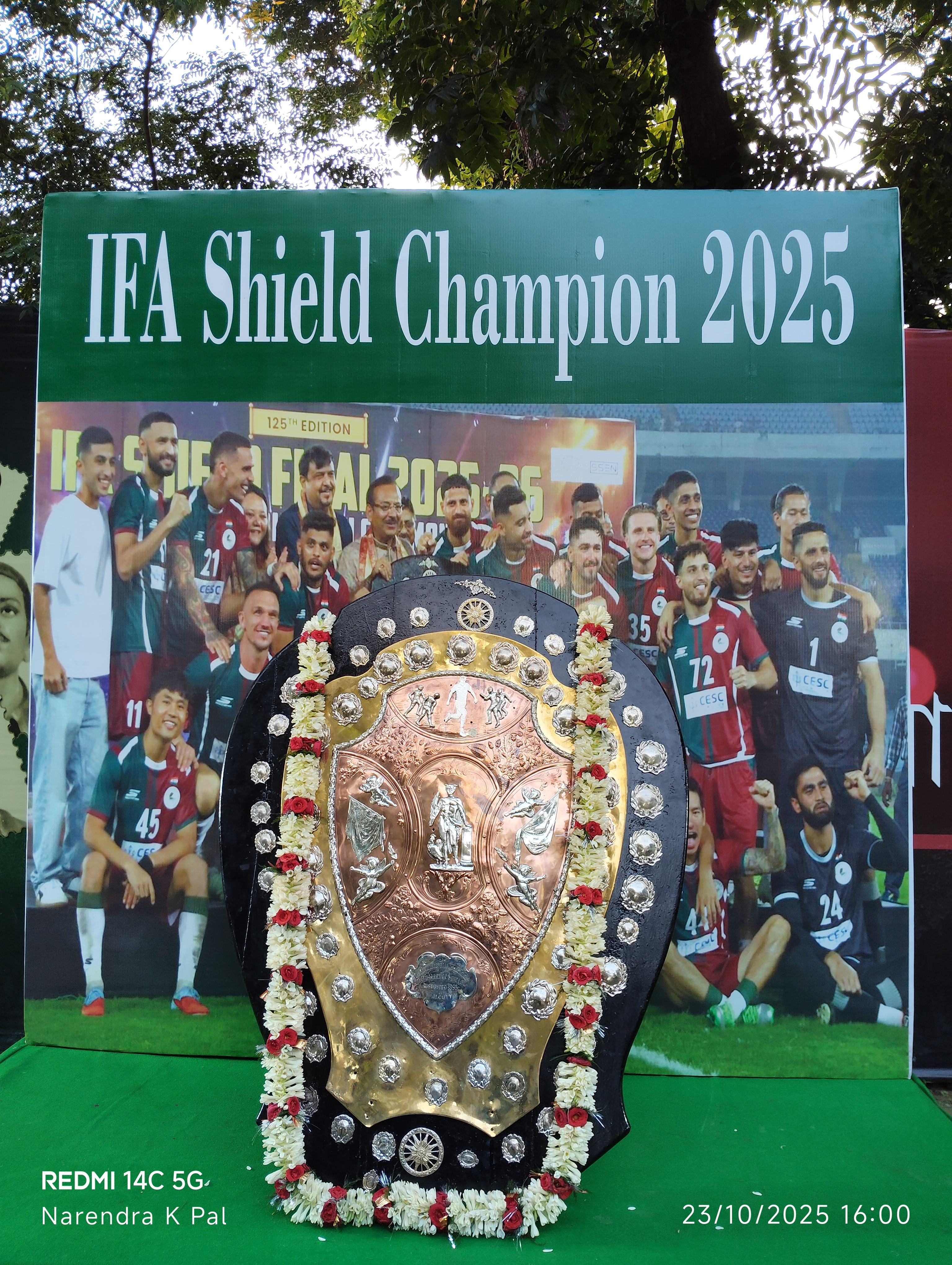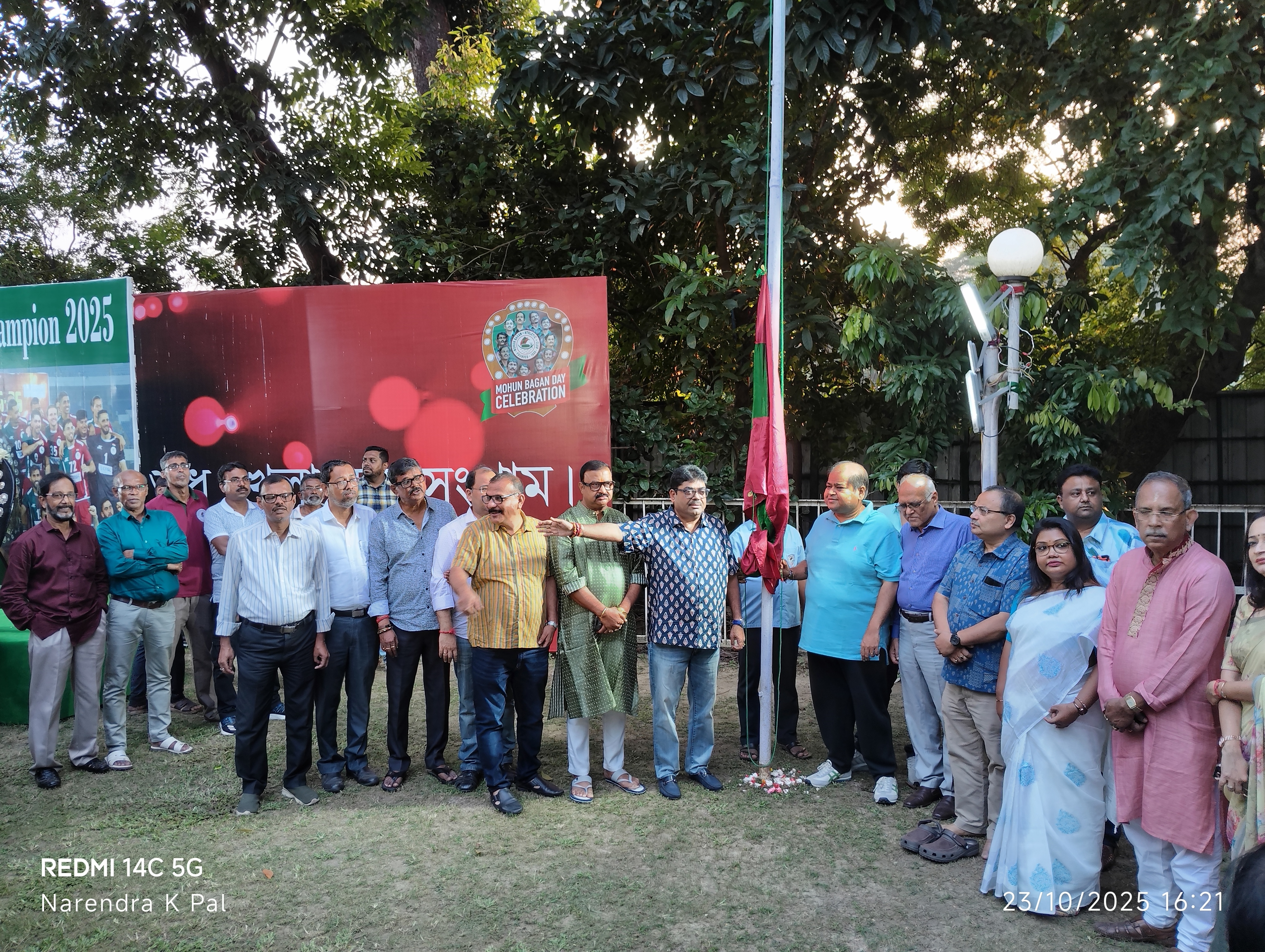 On 23-10-2025 Thursday, the Mohun Bagan Athletic Club Lawn hosted a flag hoisting ceremony to commemorate our victory in the prestigious IFA Shield 2025–26. Present at the event were President Shri Debashis Dutta, General Secretary Shri Srinjoy Bose, and other members of the Executive Committee.The IFA Shield was also displayed at the Club Lawn, allowing members and supporters to witness and celebrate this proud moment.