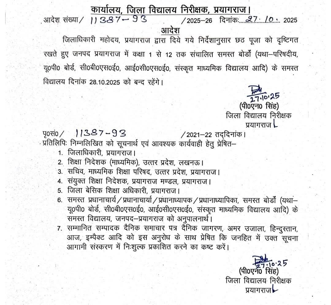 प्रयागराज में कक्षा 1-12 तक के स्कूल छठ पूजा के कारण कल बंद रहेंगे।