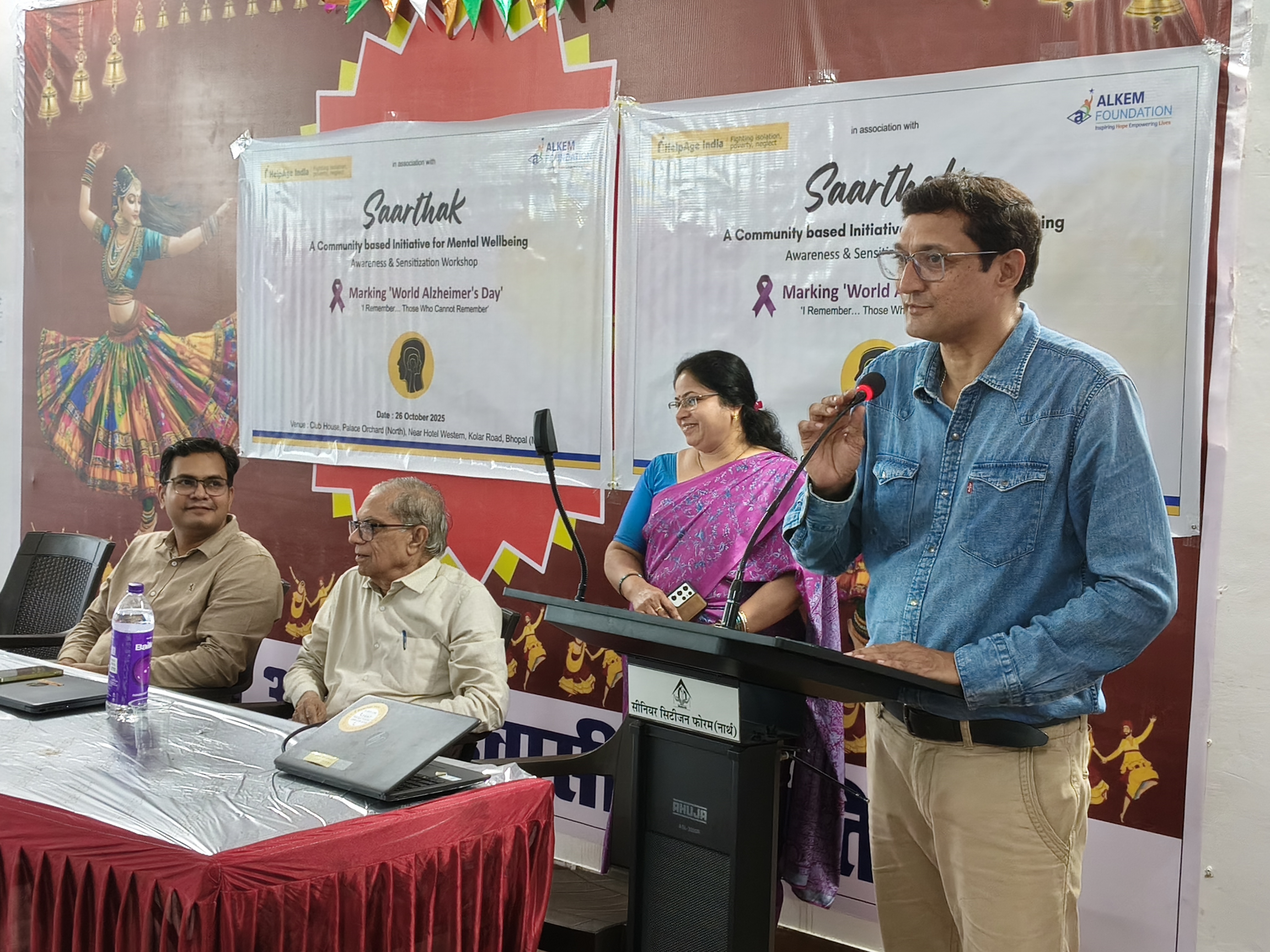 आज दिनांक 26 अक्टूबर 2025 को सार्थक कार्यक्रम के अंतर्गत एक कम्युनिटी बेस्ड इनिशिएटिव फॉर मेंटल वेल बीइंग के अवेयरनेस और सेंसटाइजेशन वर्कशॉप का आयोजन किया गया । जिसका मुख्य विषय अल्जाइमर था । हेल्पएज इंडिया के तत्वावधान में आयोजित इस कार्यक्रम का सपोर्ट एल्केम फाउंडेशन ने किया। आयोजन कोलार सीनियर सिटीजन एसोसिएशन में किया गया । वर्कशॉप में मुख्य रूप से हेल्पेज इंडिया की राज्य प्रमुख श्रीमती संस्कृति खरे, डॉक्टर बी एस ओहरी, (रिटायर्ड, डायरेक्टर, N H M) डॉक्टर पंकज सिंह (न्यूरो फिजिशियन) श्री अरुण तिवारी (अध्यक्ष, SCA) एवं एलकेम से श्री वैभव श्रीवास्तव, हेल्पज इंडिया के राज्य कार्यक्रम प्रबंधक वेणु पिल्लई, सार्थक के कोऑर्डिनेटर नरेंद्र सिंह, एल्डर लाइन के लीडर विवेक यादव, सीतांश सिंह एवं अंजलि पारिख विशेष रूप से उपस्थित रहे। कार्यक्रम में मुख्य रूप से मानसिक विकारों और उसके समाधान से संबंधित चर्चा की गई जिसका लाभ सभी वरिष्ठ नागरिकों ने उठाया। कार्यक्रम में 50 से अधिक वरिष्ठ नागरिक उपस्थित थे।