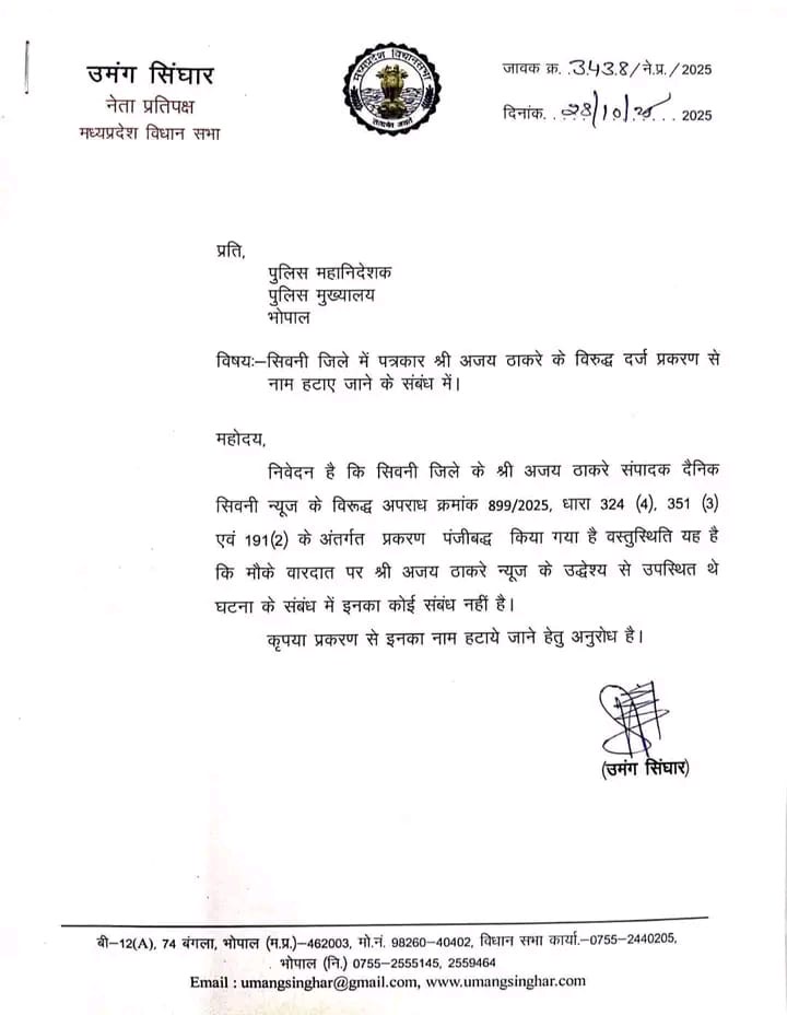 नेता प्रतिपक्ष श्री उमंग सिंघार ने इस पूरे प्रकरण पर गंभीर चिंता व्यक्त की है। उन्होंने मुख्यमंत्री डॉ. मोहन यादव जी एवं पुलिस महानिदेशक कैलाश मकवाना जी को पत्र लिखकर पत्रकार अजय ठाकरे जी का नाम FIR से हटाने का आग्रह किया है।