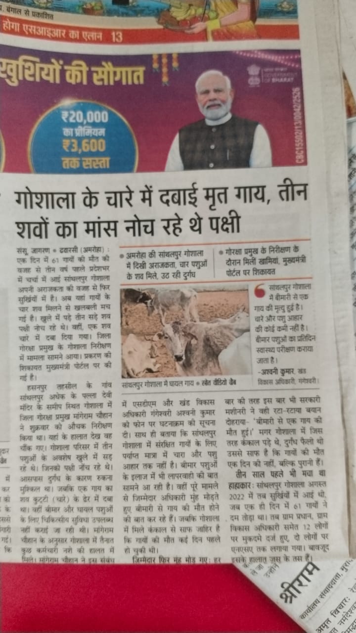 गौशाला में अव्यवस्था और पशुओं की मौत पर विश्व हिंदू महासंघ के प्रदेश मंत्री अवनीश कुमार चौहान के संज्ञान के बाद प्रशासन हरकत में आया l