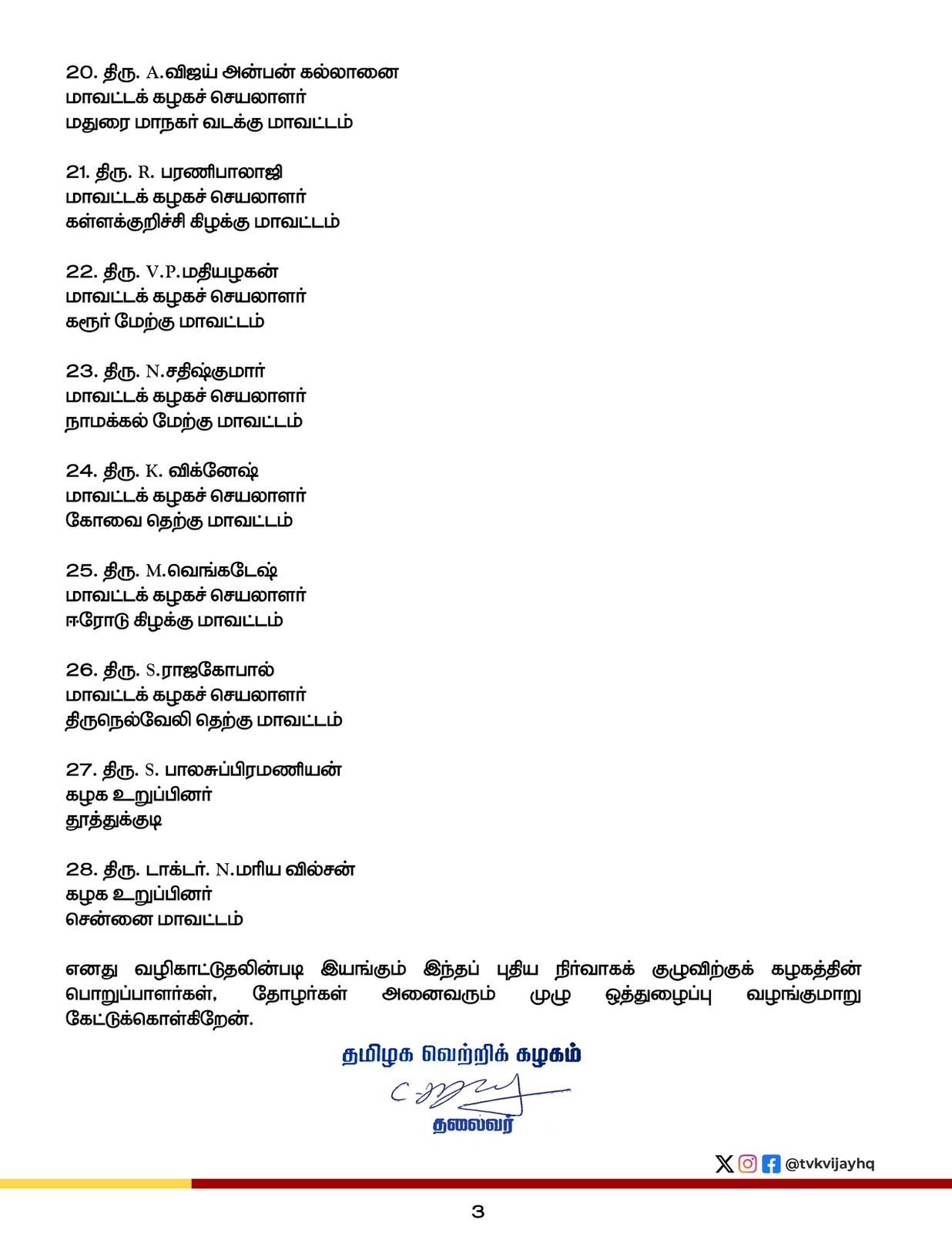 தமிழக வெற்றிக்கழகத்தின் அன்றாட பணிகளையும், செயல்பாடுகளையும் ஒருங்கிணைக்க புதியதாக நிர்வாகக்குழு நியமனம் செய்தார் அக்கட்சி தலைவர