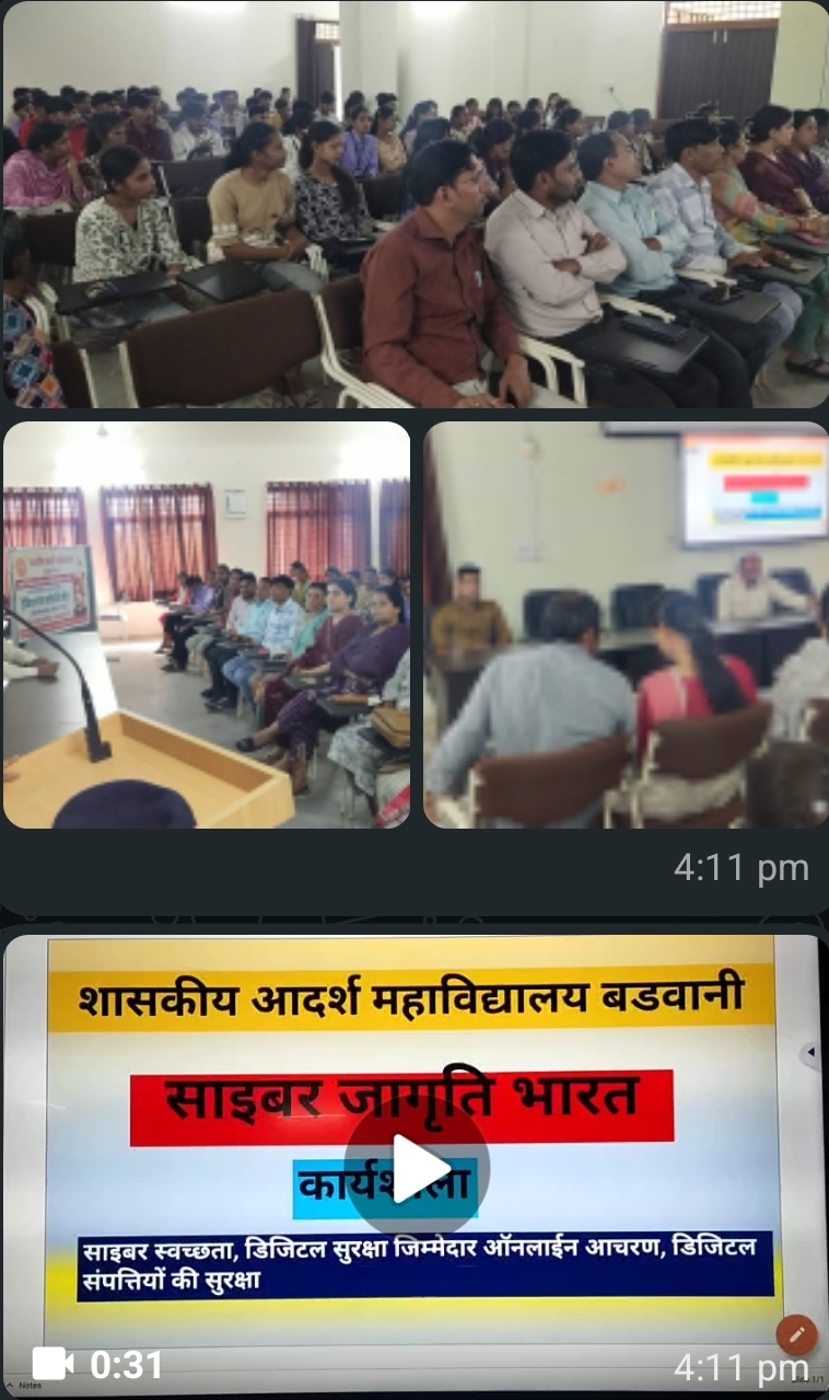 नगर के शासकीय आदर्श महाविद्यालय बड़वानी में आयुक्त उच्च शिक्षा विभाग मध्य प्रदेश शासन के आदेशानुसार राष्ट्रीय साइबर सुरक्षा जागरूकता माह का आयोजन किया जा रहा है इसी श्रृंखला में *साइबर जागृति भारत* विषय के अंतर्गत साइबर स्वच्छता, डिजिटल सुरक्षा जिम्मेदार ऑनलाइन आचरण और डिजिटल संपत्तियों की सुरक्षा के प्रति जागरूकता बढ़ाने हेतु कार्यशाला का आयोजन किया गया। महाविद्यालय के प्राचार्य डॉ. प्रमोद पंडित ने बताया कि आज डिजिटल का युग है हम सभी प्रकार के लेनदेन ऑनलाइन करने लगे हैं हमारे समस्त दस्तावेज हमारे सिस्टम पर, मोबाइल फोन में उपलब्ध है तो इससे साइबर आधारित क्राईम और असुरक्षा की स्थिति बनने लगी है। डिजिटल फ्रॉड होने लगे हैं। इन सब से हमें सतर्क होना आवश्यक है। साइबर क्राइम एंड साइबर सेफ्टी विषय पर श्री पंकज दासौंधी एएसआई और श्री राहुल चौहान कांस्टेबल के द्वारा विद्यार्थियों को साइबर जागरूकता संबंधित मार्गदर्शन दिया गया। इन्होंने बताया कि हम जितनी तेजी से मोबाइल और ऑनलाइन से जुड़े हैं। उतनी ही तेजी से इससे संबंधित अपराध भी बढे। आज साइबर क्राइम, डिजिटल सुरक्षा एक बड़ी चिंता है सजकता से ही हम होने वाले अपराधों से बच सकते हैं। सोशल मीडिया पर आने वाली बहुत सी संदिग्ध फाइले लिंक आदि को बिना समझे ना खोलें, पल भर में ही हमारी जमा पूंजी अपराधी उड़ा लेते हैं। कार्यशाला में प्राध्यापक डॉ बीएस मुजाल्दे ने भी विद्यार्थियों को मार्गदर्शन दिया। कार्यक्रम का आयोजन प्रो. आर. आर. मुवेल द्वारा किया गया। डॉ दिनेश पाटीदार द्वारा आभार व्यक्त किया गया। महाविद्यालय के प्राध्यापक और विद्यार्थियों की सहभागिता से उक्त कार्यशाला संपन्न की गई।।।